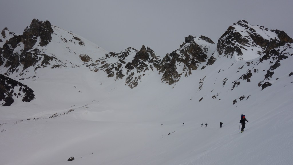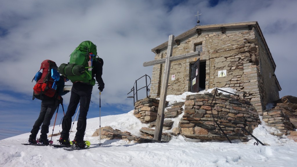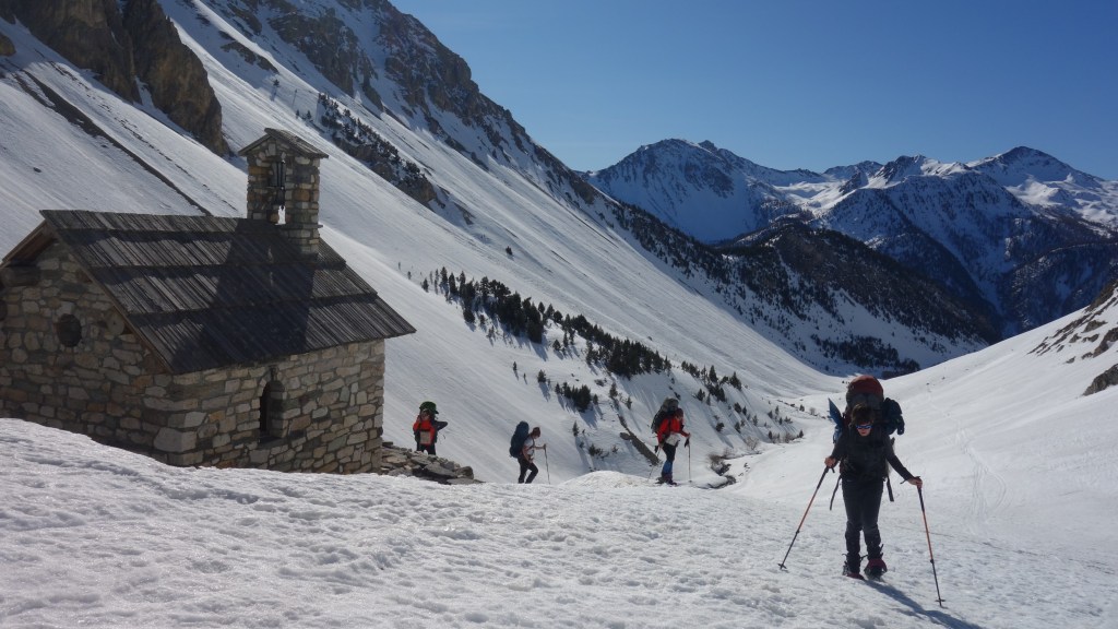 Na een ietwat frisse lunch bij de gelijknamige kapel kijken we even naar de inschuivende wolken en besluiten dat er nog voldoende tijd is voor de doorsteek via Col de la Chapelle en Col de Valmeunier. We laten afstand tussen elkaar om de druk op het sneeuwdek zo klein mogelijk te houden, ook bij een lager lawinegevaar (niveau 2) bouw ik graag wat marge in.