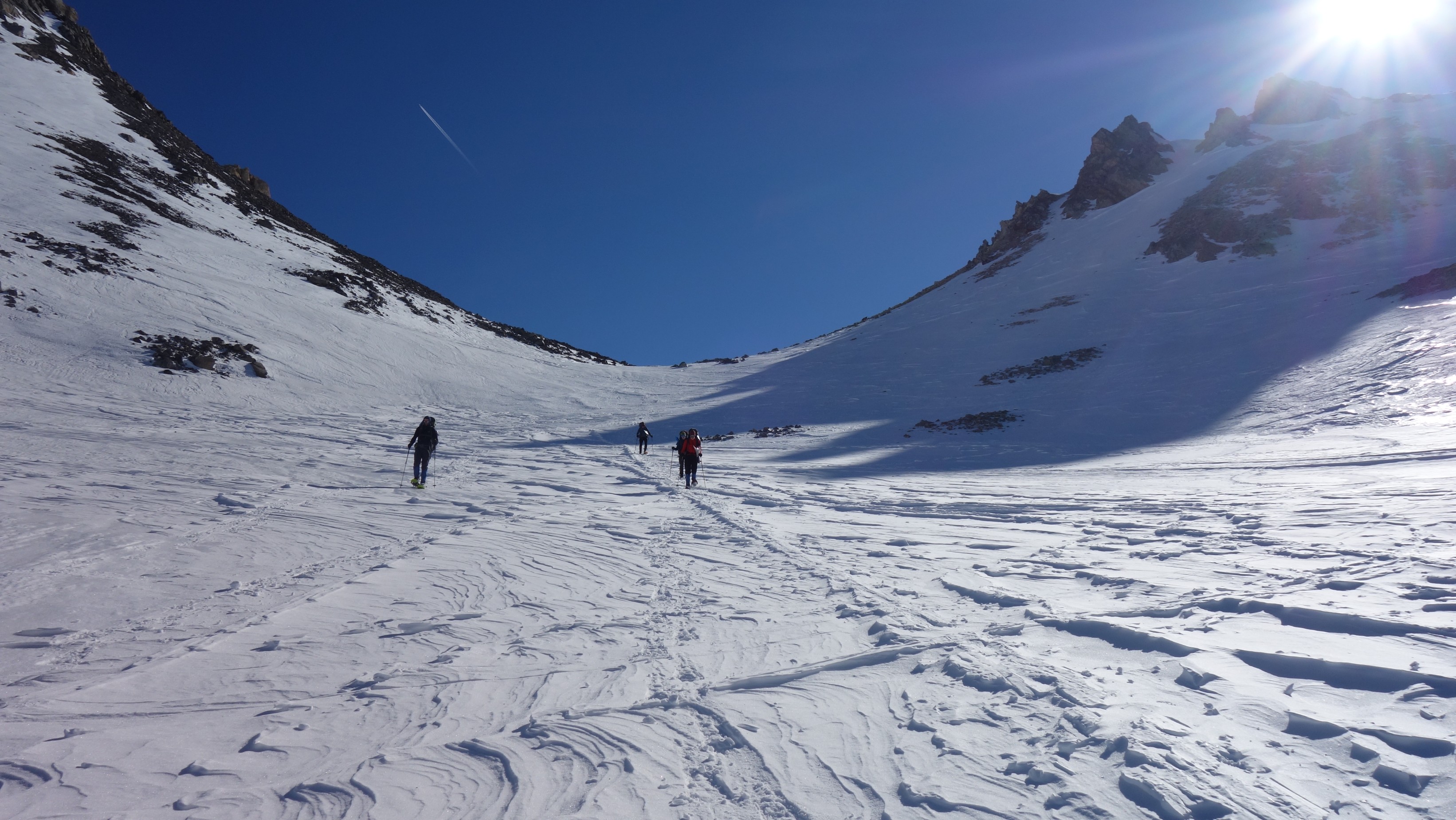 De sneeuw kraakt onder onze voeten. We zakken amper weg in het sneeuwdek dat er al een tijdje onaangeroerd bijligt. Niemand in de omtrek te bekennen. Eerste opdracht voor de groep is zich oriënteren, het terrein lezen en het meest efficiënte spoor zoeken naar Col du Vallon (2.645m). Op de bergpas tonen ‘sastrugi’, grillig gevormde sneeuwformaties, de recente dominante windrichting aan.