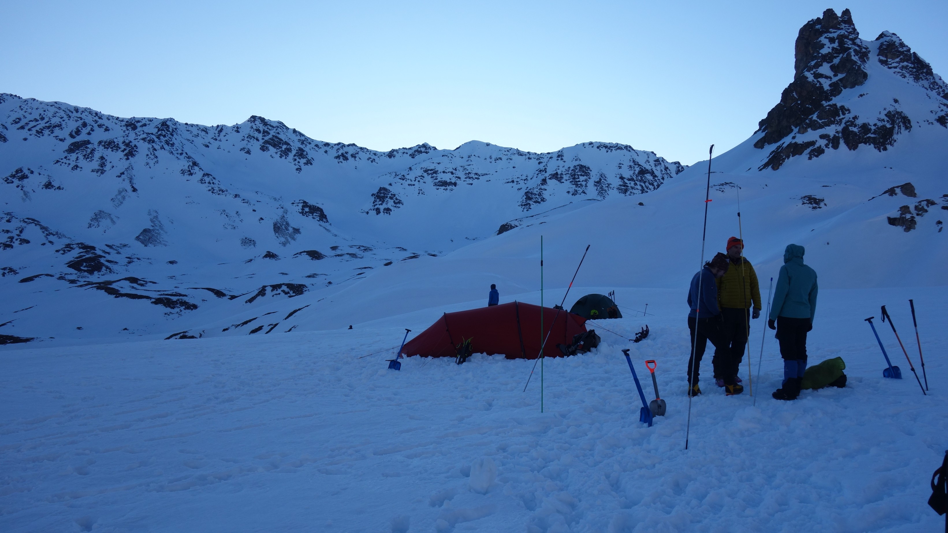 Eenmaal de tenten klaarstaan, nemen we de tijd om nog eens te oefenen met lawineslachtofferzoekapparaat (LSZA), sonde en schop. Als een slachtoffer begraven ligt onder een pak sneeuw, dan is tijd heel kostbaar wegens het gebrek aan lucht. Je hebt hooguit een kwartier de tijd om iemand te lokaliseren en op te graven. Vooral dat laatste neemt veel tijd in beslag, ook in groep. Routine & efficiëntie zijn dus superbelangrijk.