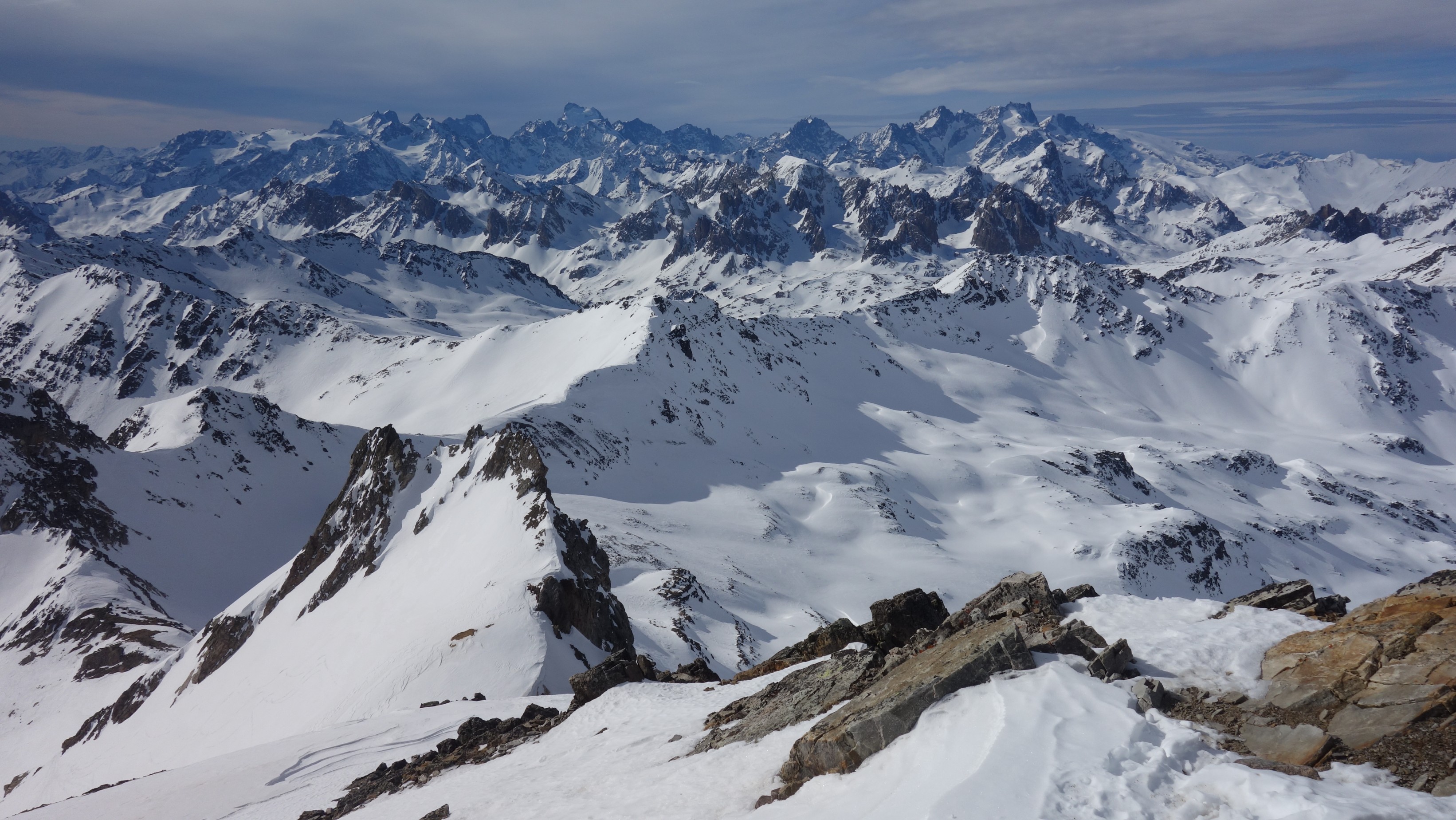 Na de stevige rukwinden van afgelopen nacht is er wat twijfel of de Mont Thabor wel een haalbare kaart is, maar we besluiten het er toch op te wagen en onderweg een beslissing te nemen. De weergoden zijn terug op adem aan het komen en we krijgen dus een vrijgeleide naar de top op 3.178m hoogte. Wat een panorama! Ook het vergletsjerde massief van de Ecrins is duidelijk te zien.