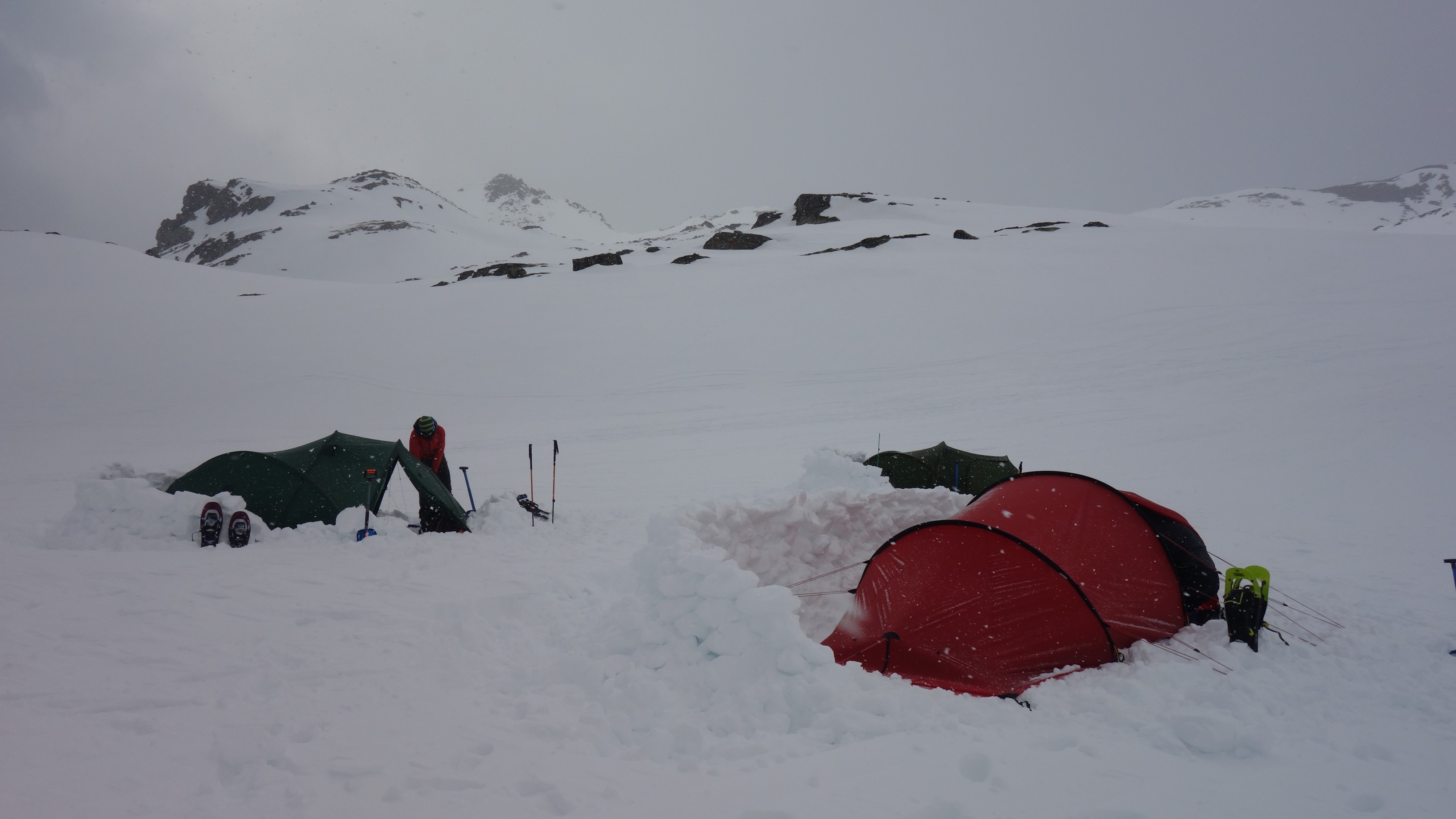 Het belooft een stormachtige nacht te worden dus bouwen we heel stevige en vrij hoge sneeuwmuurtjes om wat beschutting te hebben.