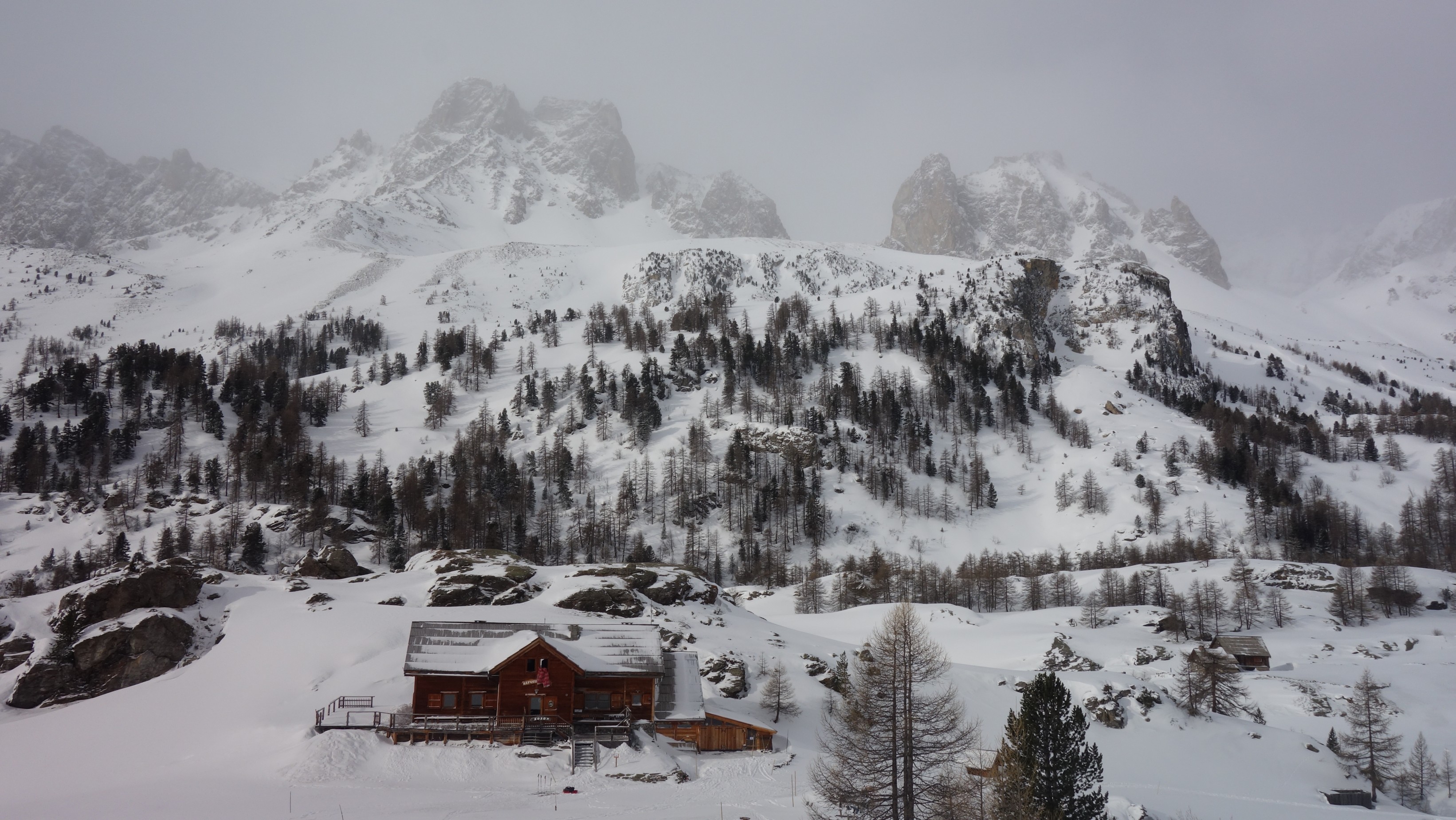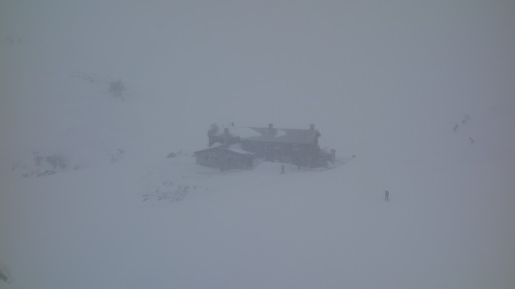 Zuidwaarts dalen we af in de vallei tot Refuge Laval, maar we even van het sanitair gebruik maken. Daarna klimmen we omhoog naar de westflank om dan via eenvoudig terrein Refuge de Ricou te bereiken. Het zicht wordt steeds troebeler en de sneeuw begint met bakken uit de lucht te vallen.