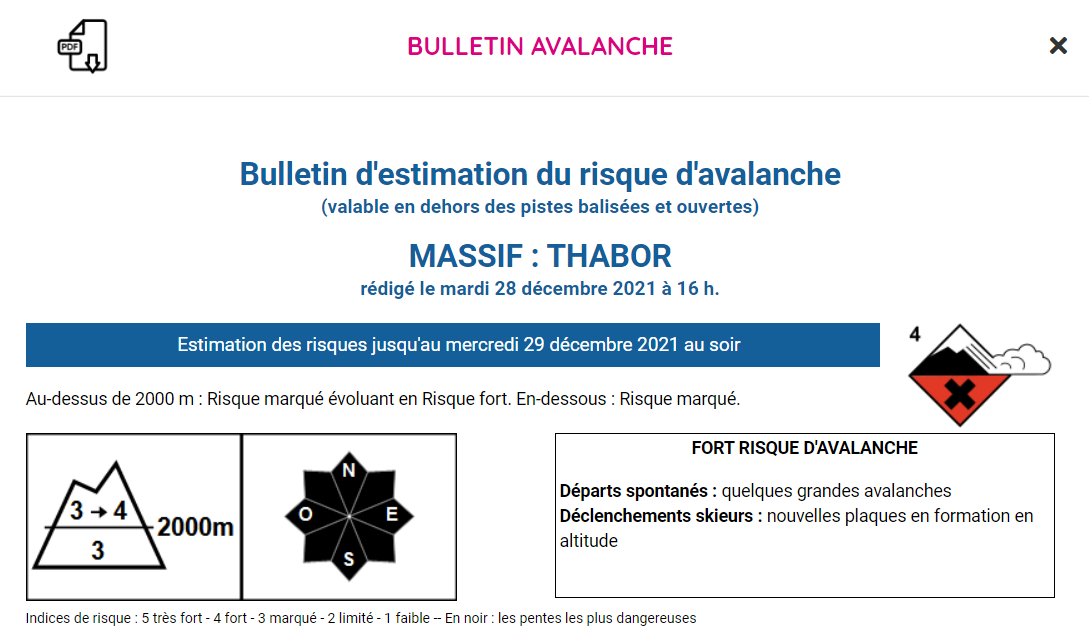 Het komt er dus aan voorzichtig te plannen en diverse scenario’s achter de hand te hebben. Al ruim op voorhand beginnen we de lawineberichten op te volgen via Meteo France om een zicht te krijgen op hoe het sneeuwdek evolueert in het gebied, gedurende de winter éénmaal per week en de laatste week voor vertrek dagelijks. Het gevaar varieert continu maar vaak zal de meest recente geschiedenis het lawinerisico bepalen, tenzij een oude instabiele laag in het sneeuwdek heel lang voor gevaar blijft zorgen. Door later in de winter op stap te gaan, is er iets meer kans op gunstigere omstandigheden. Het sneeuwdek is dikker en stabiliseert sneller door de hogere temperaturen overdag. Maar niets is zeker…dat zou op onze tocht ook blijken.