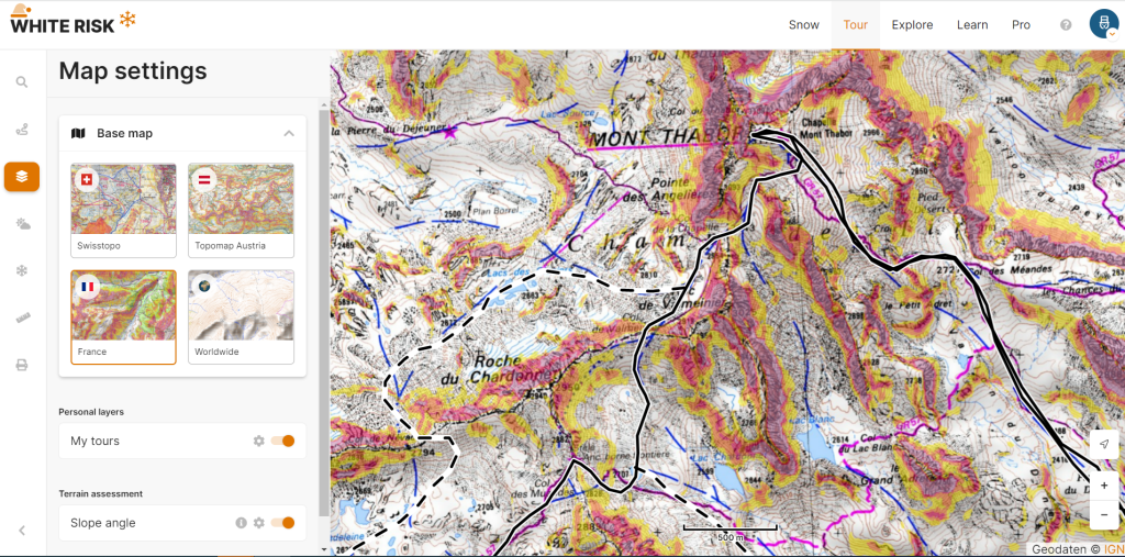 De route werd uitgestippeld met behulp van de betalende tool van Whiterisk omdat je daar de twee ineen hebt (stafkaart & ingekleurde hellingsgraden) en je in de tool veel nauwkeuriger een goede GPX-route kan uitstippelen. Wil je geen geld uitgeven, dan is er ook een online tool van Géoportail waar je alle hellingen van 30° of meer ingekleurd staan op de stafkaart. Je kan er echter geen gpx-en uitstippelen, dus je zult die moeten intekenen via een andere tool (en heel aandachtig zijn bij het maken van je gpx).