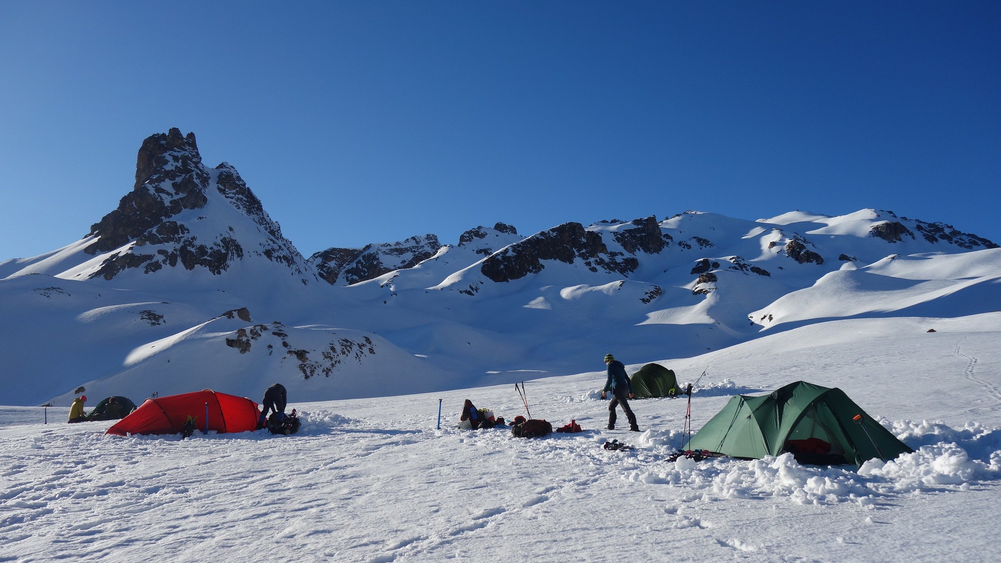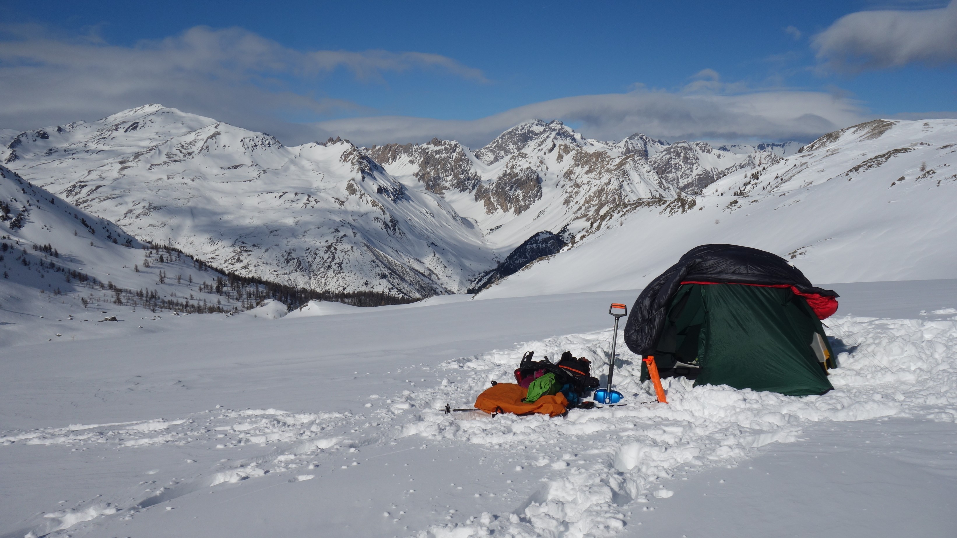 We volgen de graat zuidwaarts en dalen dan net ten noorden van de Crête de Cristol af. Via de ingesneeuwde GR5C steken we door naar de andere kant van vde vallei en plaatsen de tenten op vlak terrein, ver van steile flanken. De slaapzakken laten we bovenop de tenten drogen in de zon. In de winter hoopt het zweet op in het dons omdat het te koud is in de tent en dat is uiteraard niet bevorderlijk voor de isolatiewaarde.