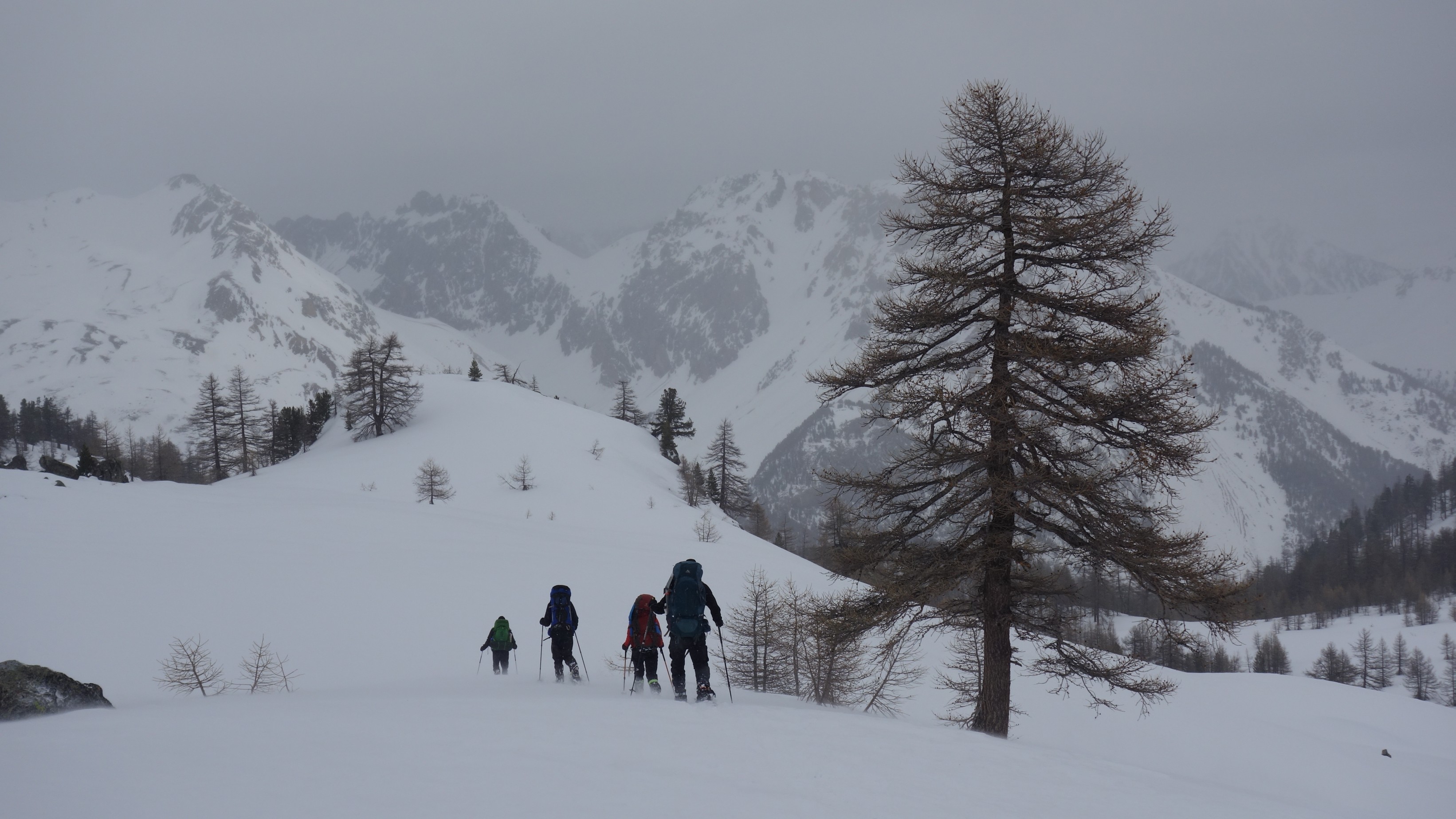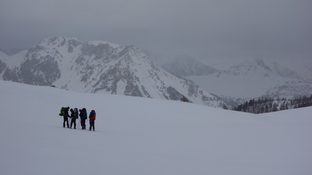 Het wolkendek schuift helemaal dicht tijdens de doorsteek naar Col des Muandes en de GPS houdt ons op koers. Met een aanwakkerende wind is het kwestie van ons goed in te duffelen, de windchill is in de winter niet te onderschatten.