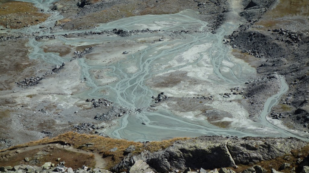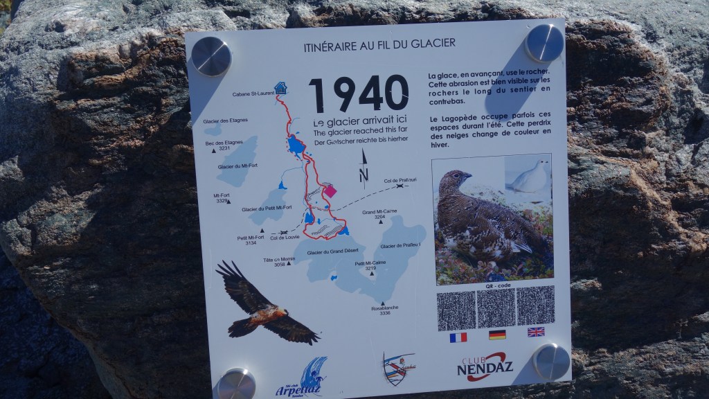 Trailrunnen is duidelijk in, grote en kleine vlaggen van de Nendaz Trail staan langsheen het pad opgesteld. Bordjes met jaartallen langs het pad duiden aan hoe de gletsjer zich in een eeuw tijd steeds hoger terugtrok door de opwarming van de aarde.