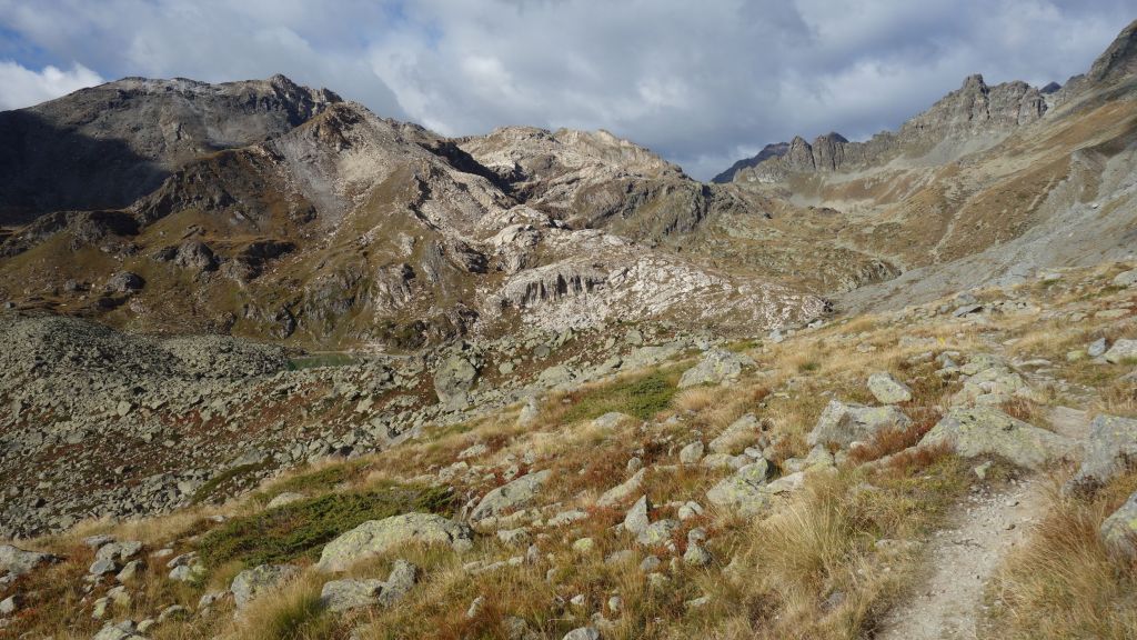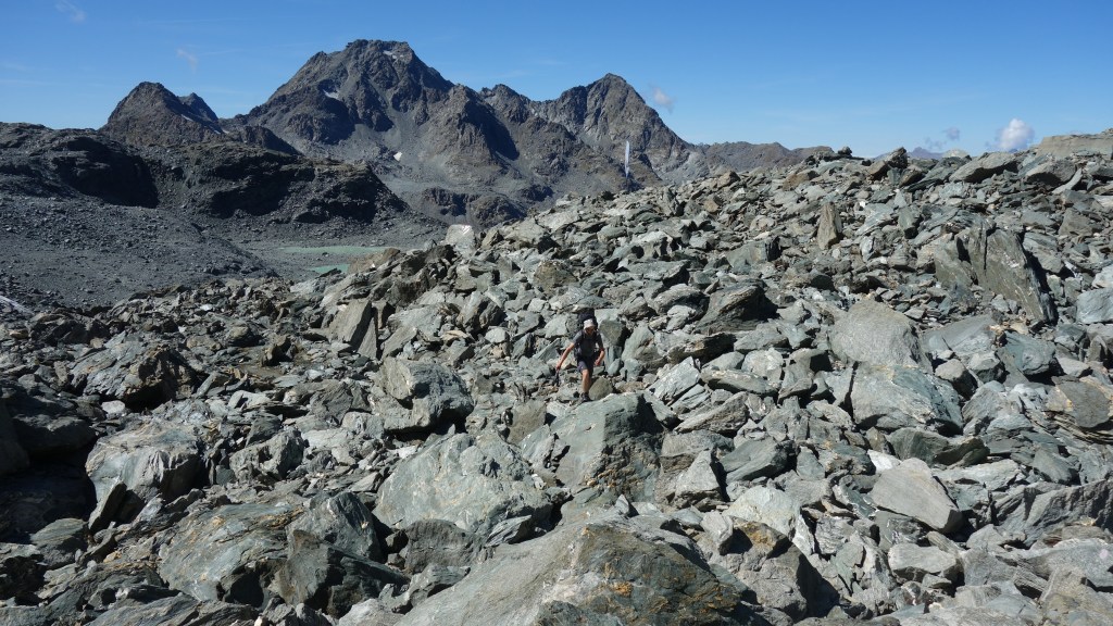 Intussen overschrijden we een volgende vegetatiegrens. Het mooie bergpad verandert in een woestenij van stenen en blokken. Stevige koek als je hier moet trailen. Wel heerlijk om je een weg te banen door dit indrukwekkende landschap.