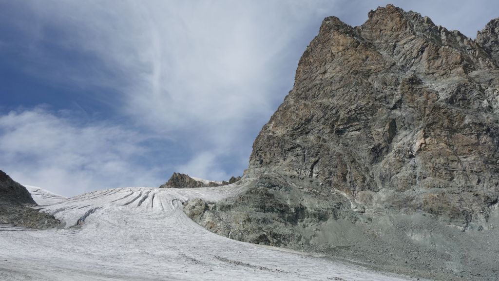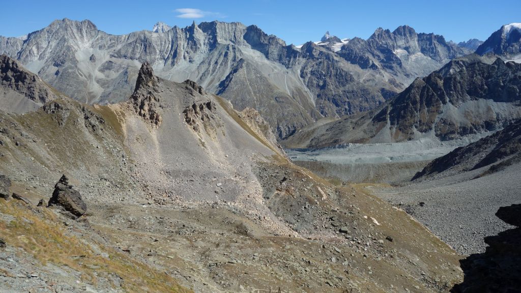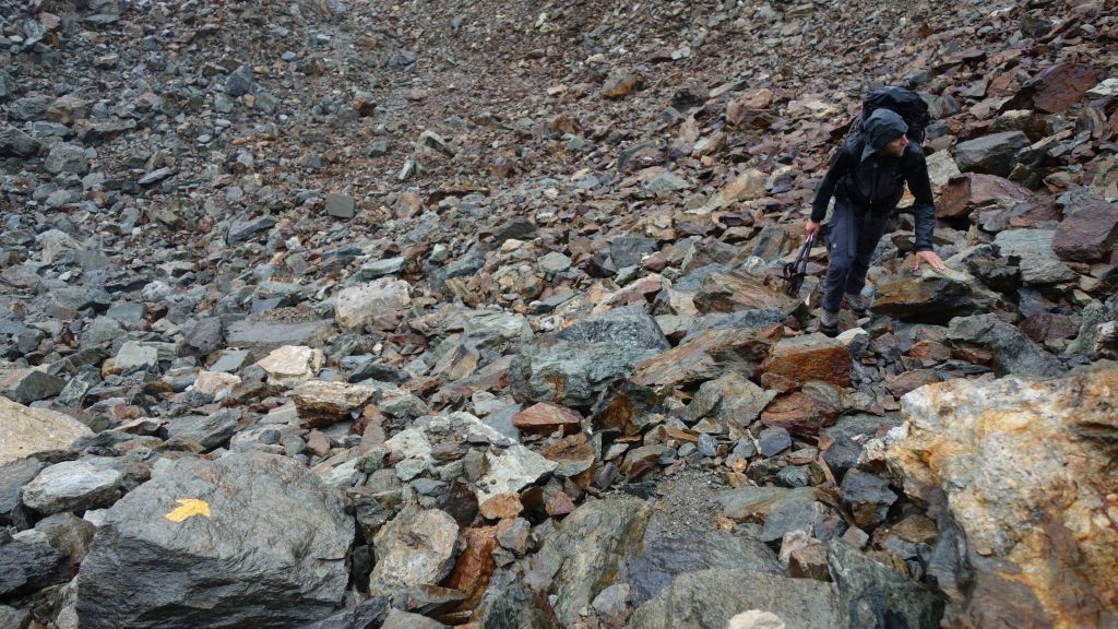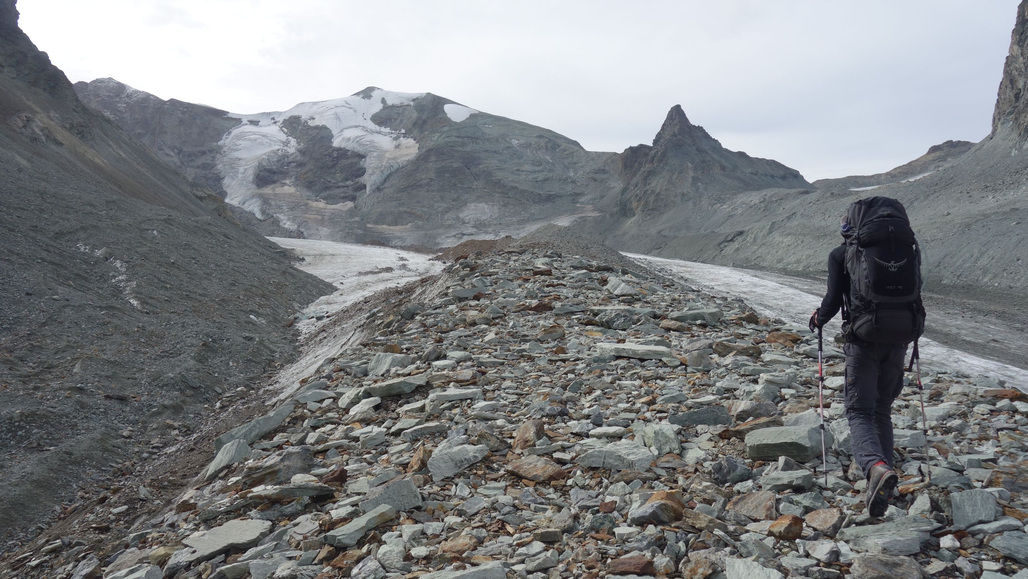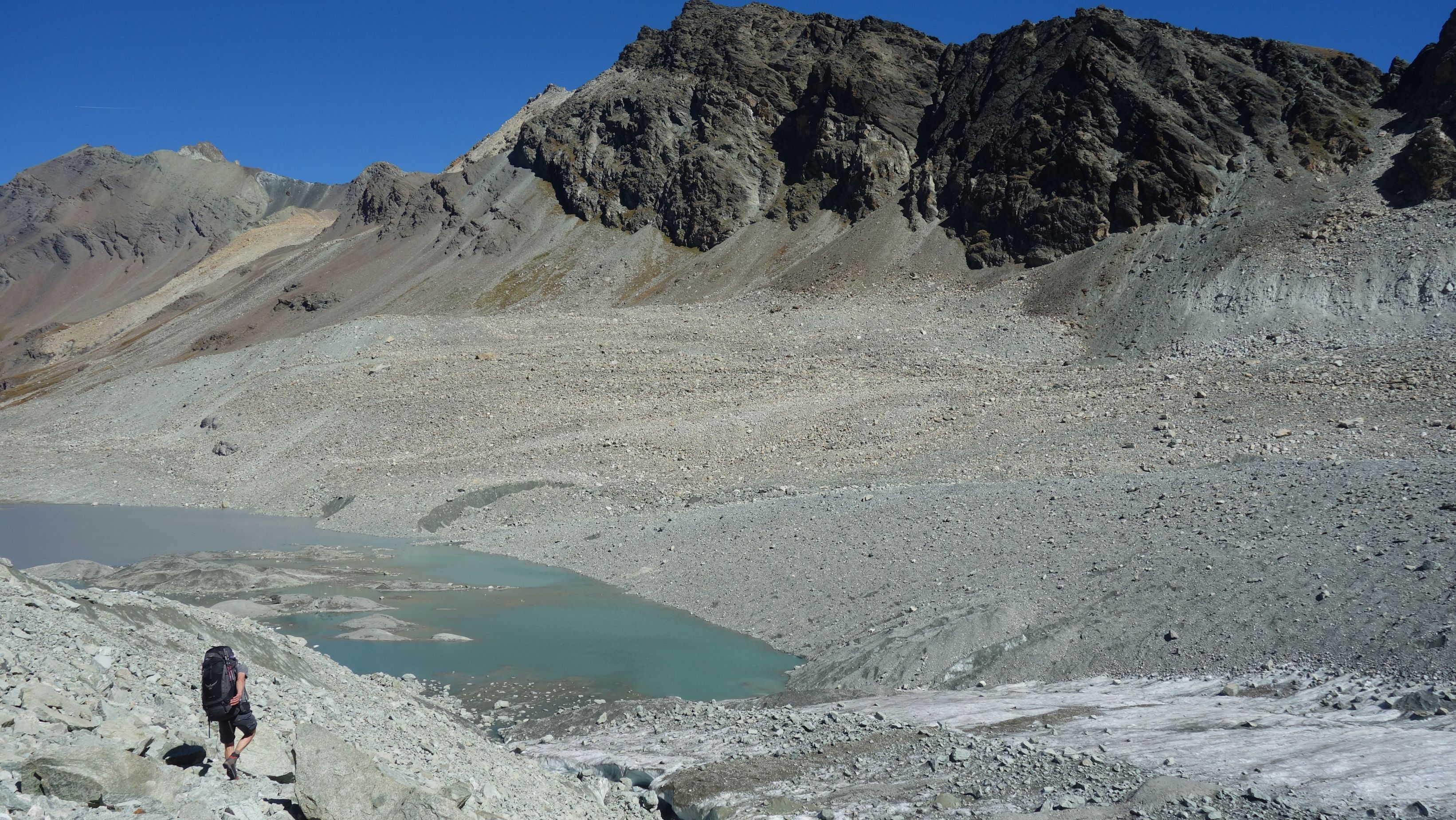 De rode verfbollen die ons door het moreneveld van de Glacier du Cheilon leiden, zijn opeens nergens meer te bekennen. Is de originele route verlegd of is het ijs al zoveel gesmolten dat de stenen zijn weggerold? Voorzichtig dalen we een steile gladde moreneflank af en klefferen terug omhoog naar Col de Riedmatten. De laddertjes van Pas de Chèvre zijn minder geschikt voor een zware bivakrugzak, dus pijnigen we onze kuiten met deze bijzonder steile variante. Het is toch even naar adem happen.