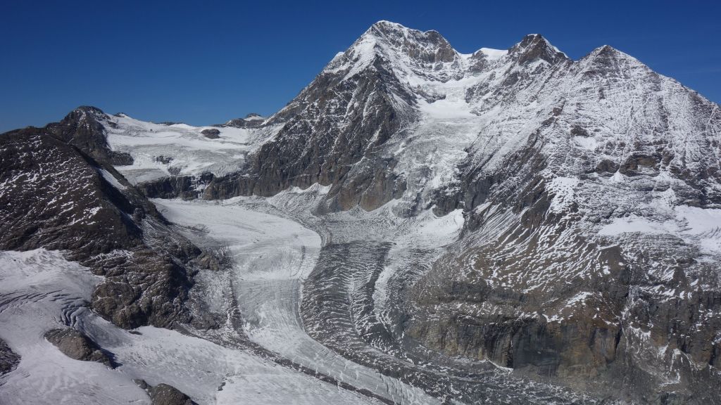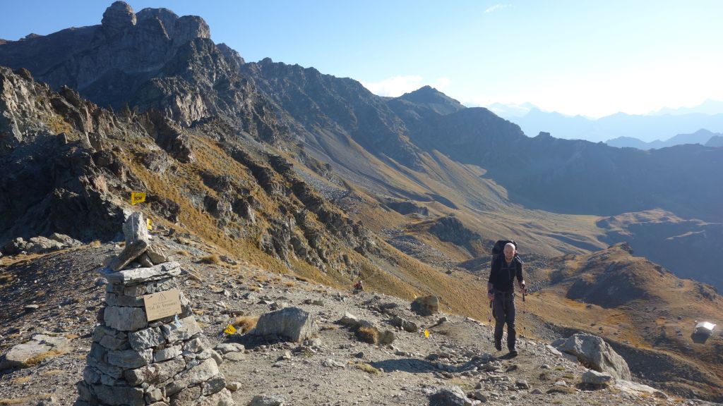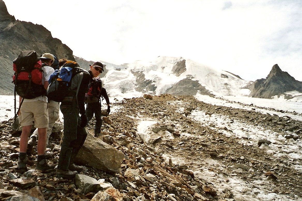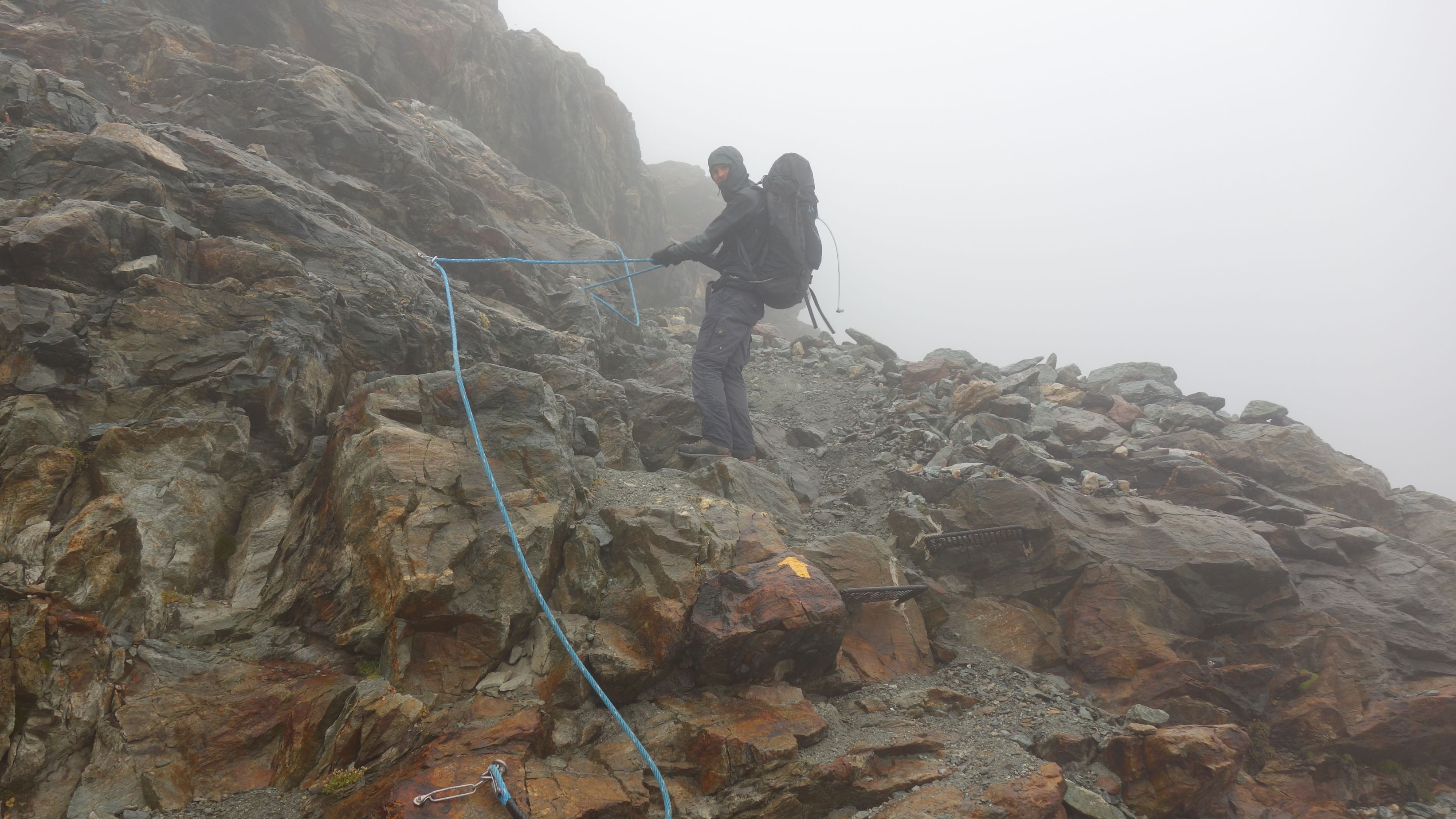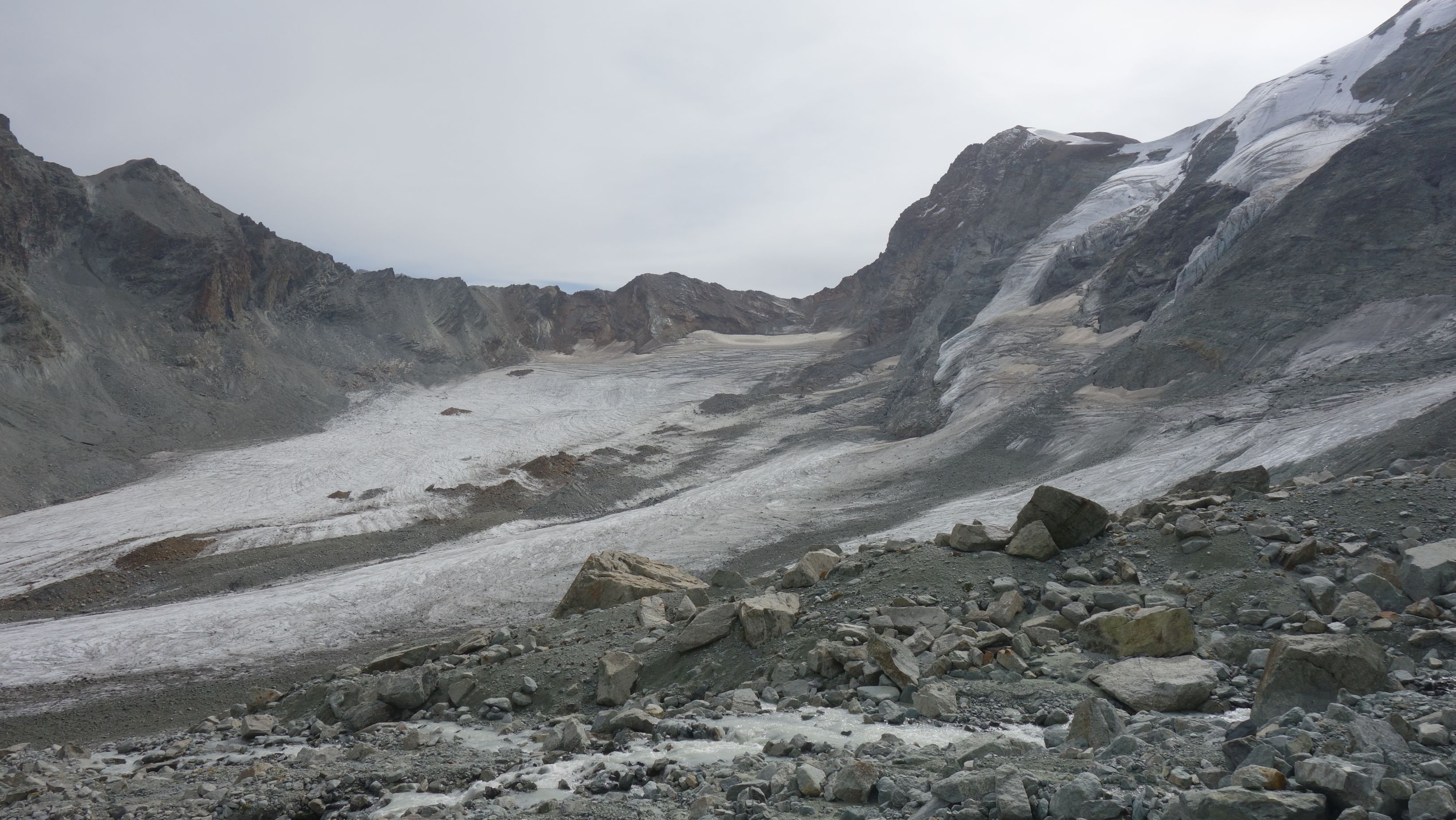 De rode verfbollen die ons door het moreneveld van de Glacier du Cheilon leiden, zijn opeens nergens meer te bekennen. Is de originele route verlegd of is het ijs al zoveel gesmolten dat de stenen zijn weggerold? Voorzichtig dalen we een steile gladde moreneflank af en klefferen terug omhoog naar Col de Riedmatten. De laddertjes van Pas de Chèvre zijn minder geschikt voor een zware bivakrugzak, dus pijnigen we onze kuiten met deze bijzonder steile variante. Het is toch even naar adem happen.