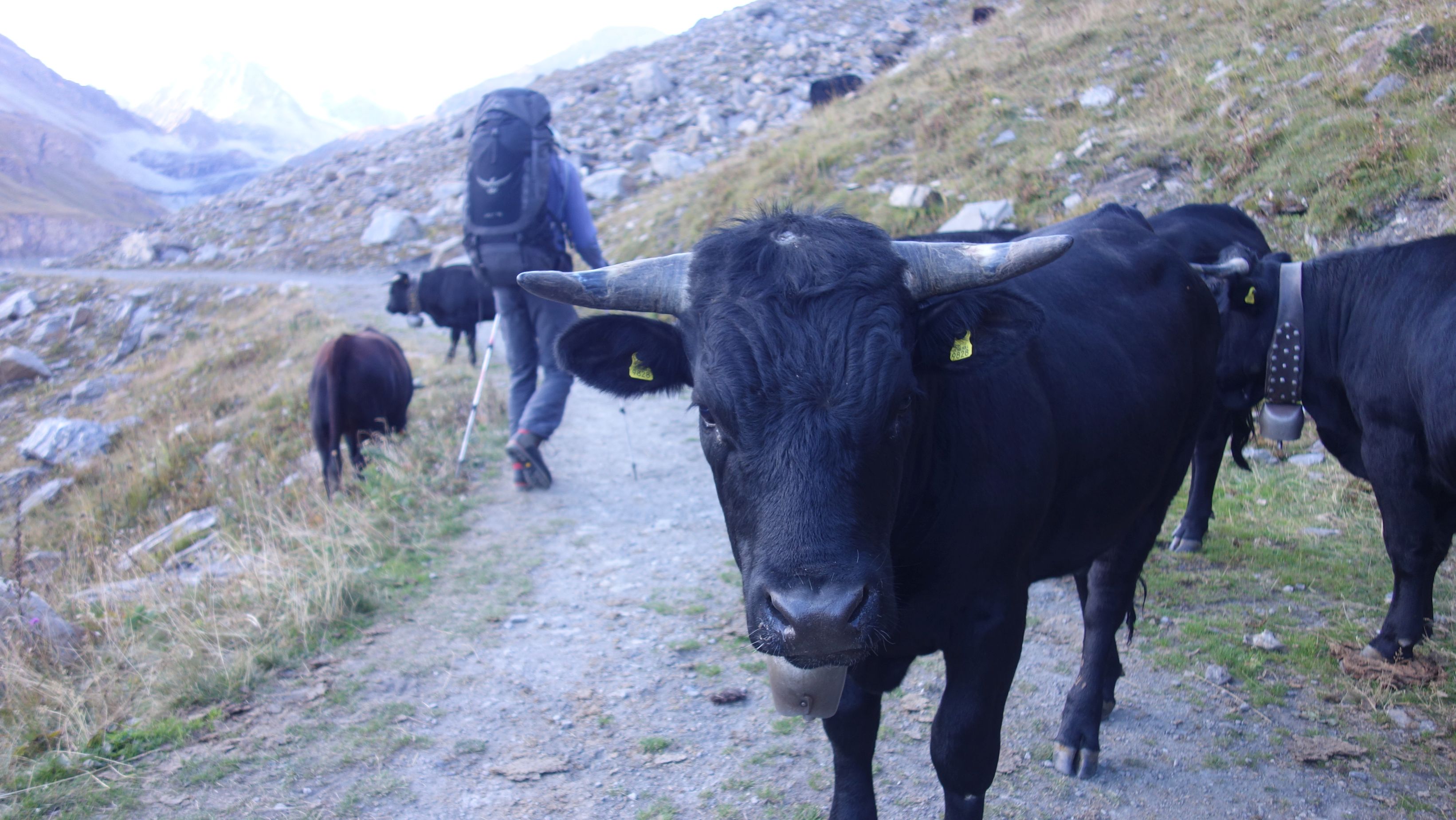 Ons bioritme van thuis is ook dat in de bergen, dus zijn we alweer vroeg op stap. De zon heeft de spots aangezet op de oostflanken maar helaas loopt onze weg aan de schaduwrijke en dus bijzonder kille westzijde van het Lac des Dix. We laveren voorzichtig tussen de zwarte Hérenskoeien met de korte poten en puntige hoorns. In de streek worden ‘Combats des Reines’ georganiseerd die leiden tot het ultieme gevecht voor de titel ‘Reine National’. Het ras wordt voornamelijk nog geteeld uit traditie voor deze batailles, omdat de koeien minder melk opbrengen dan andere soorten.
