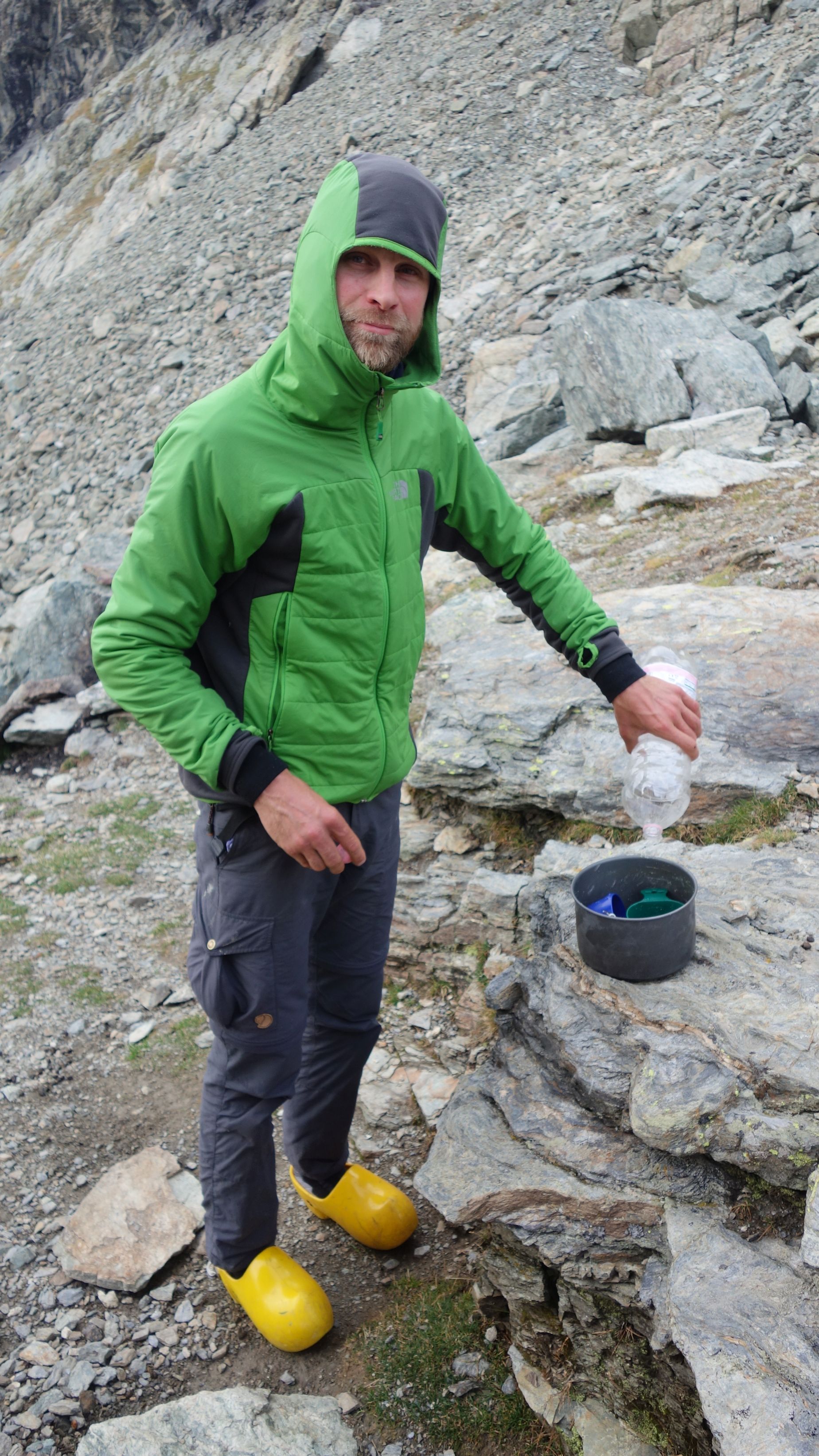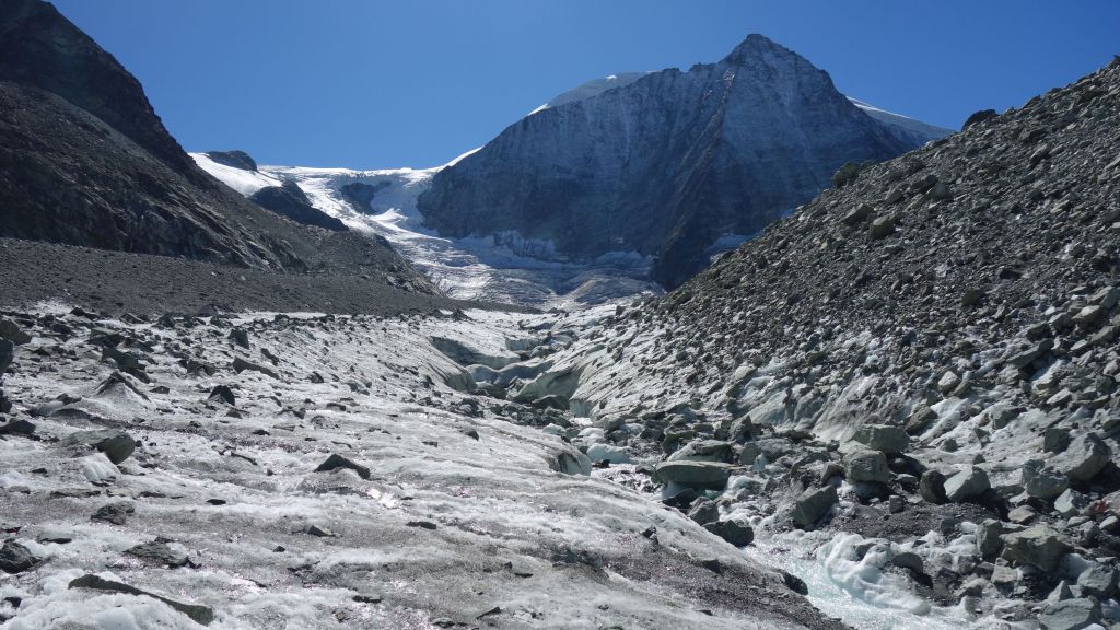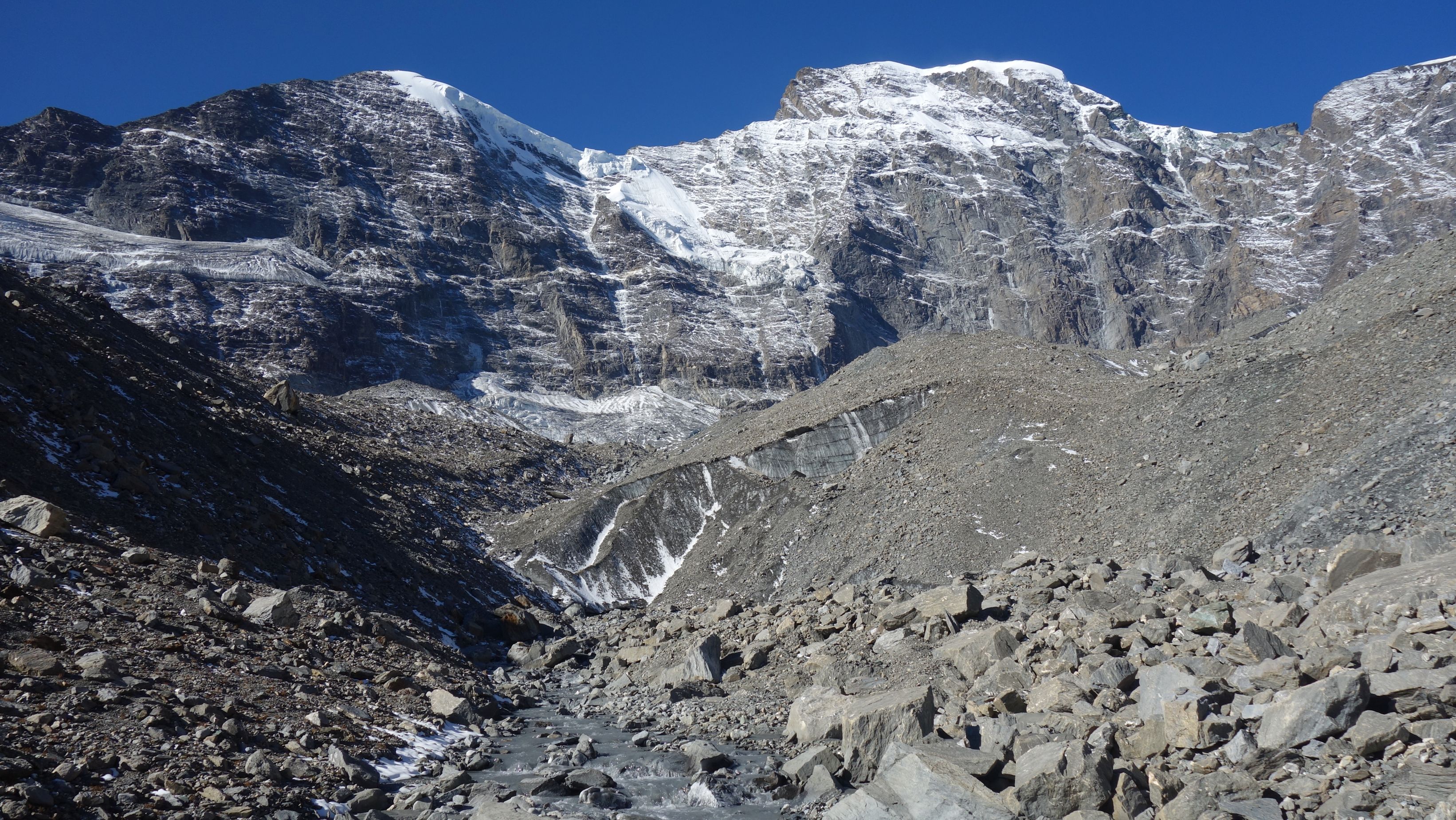 Het heeft weinig zin de originele route te zoeken in deze chaos. Smeltwater stort zich van een hoge steile flank bezaaid met puin. In een directissimo kruipen we er omhoog en gebruiken de rotsen die nog wat vastzitten in het ijs. Een aanslag op de kuiten en quadriceps. De korte pijn. Daarna gaat het veel geleidelijker omhoog. Het moeilijkste is voorbij en onze compagnon kan zijn eigen route terug vervolgen. ’t Is te zeggen, eenmaal we hem de juiste richting hebben aangewezen.