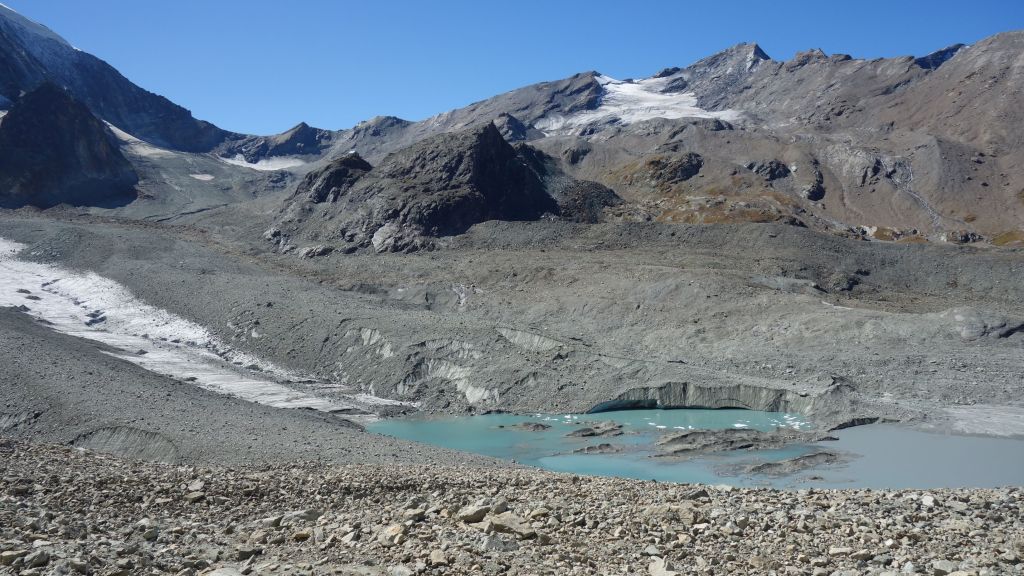 Eerst is er nog een wandelspoor maar het terrein wordt steeds grilliger. De morenenrug temidden de gletsjer waar we zoveel jaren geleden nog eenvoudig konden opwandelen, steekt nu enkele meters boven onze kop uit. We staan erbij en kijken ernaar. Met wat moeite geraken we er toch nog op. Ook de route naar de Col de Collon is er niet makkelijker op geworden. Een Fransman loopt te dralen over de gletsjer, met niet meer dan een verouderde topogids in zijn handen. Hij is het spoor bijster en vraagt of hij ons mag volgen.