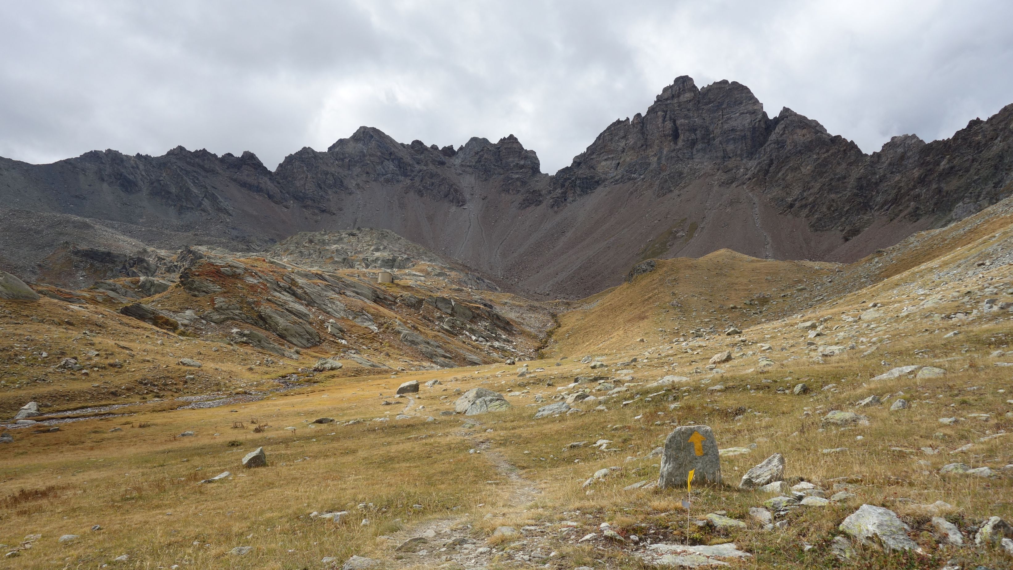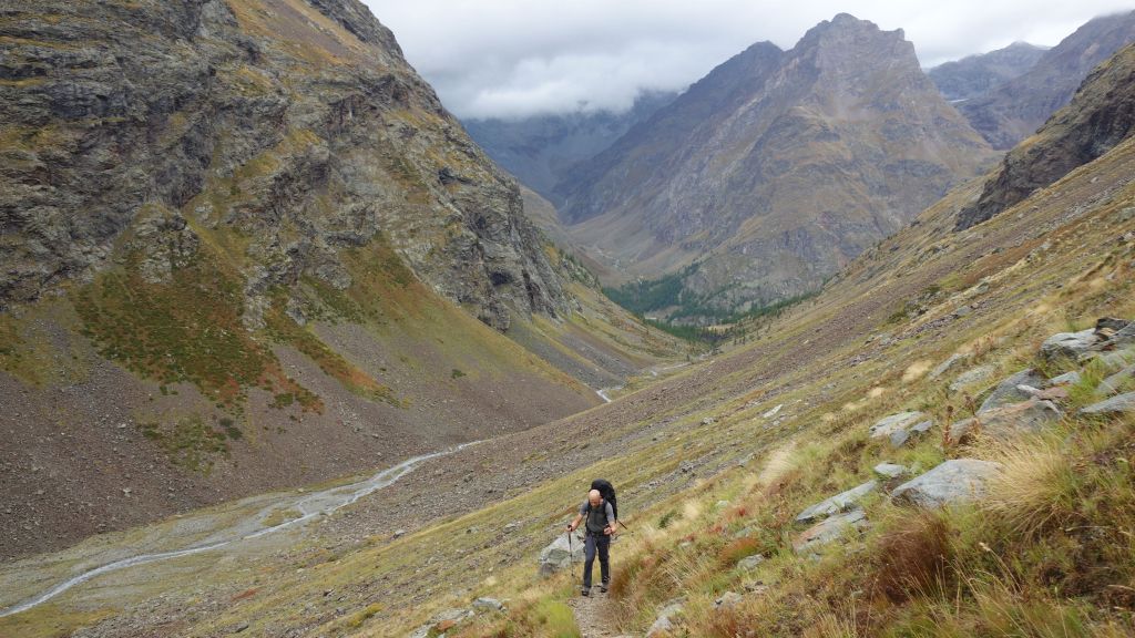 Vanaf de col duikt een mooi bergpad de Come d’Oren in. De omgeving krijgt terug wat kleur. Na een lange afdaling vleien we ons neer voor een cola & taart op het terras van Rifugio Prarayer. La vie est belle! Vanavond een douche, een bed en véél eten in de berghut.