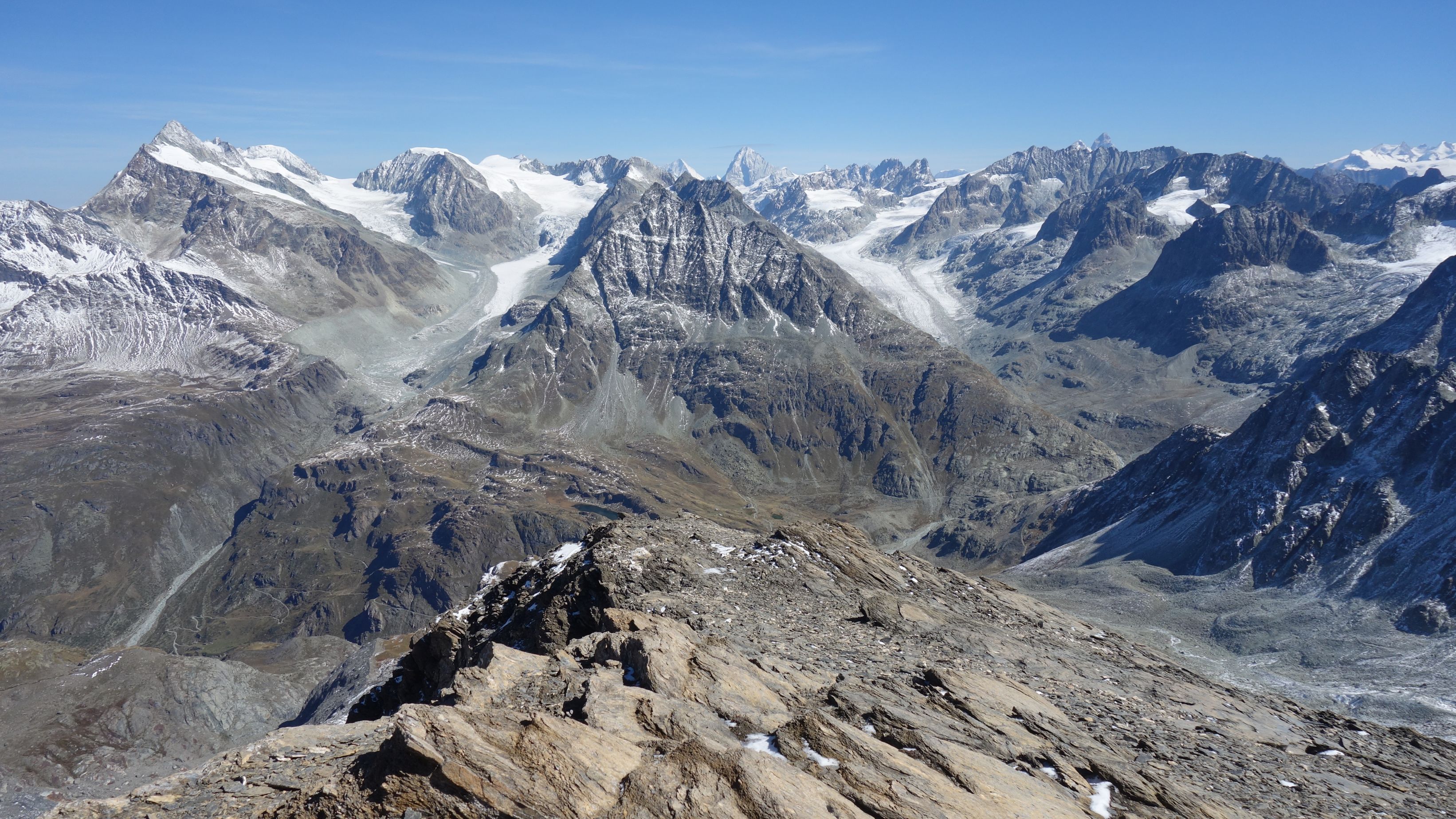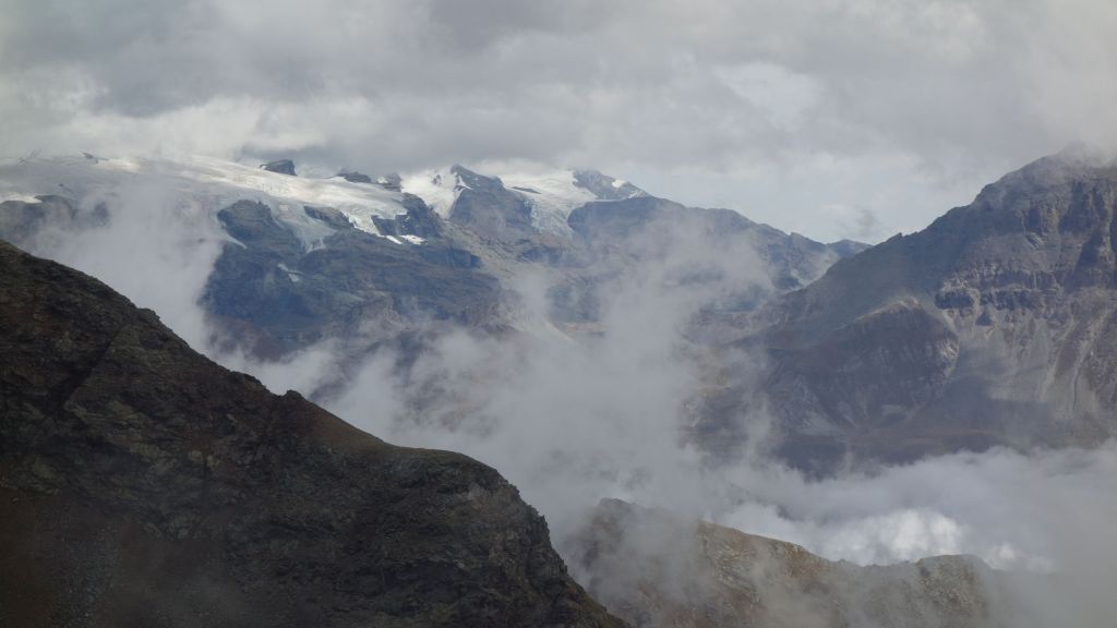 Vanaf de Fenêtre de Durand kan je ‘vlot’ omhoog naar Mont Avril, die met zijn 3.349m hoog een fantastisch panorama biedt over het hooggebergte. Dat wil ik toch niet missen. Liet ik in het begin van de week Ivo nog makkelijk achter, nu hijg ik achterop. Het ademen kost bijzonder veel moeite. Een keelontsteking op grote hoogte is duidelijker nog erger dan op zeeniveau. Maar de beloning is groot. We kijken onze ogen uit.
