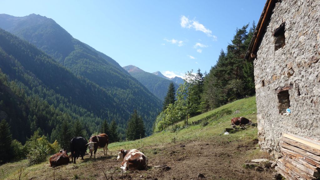 Aan de Dranse de Bagnes staat een gesloten herdershut met bankje in de zon en een perfect begraasde pelouze. Af en toe komen de lokale koeien even goeiedag zeggen en moeten we voor hen een korte omleiding voorzien. Na enkele passages is de nieuwsgierigheid eindelijk bekoeld.