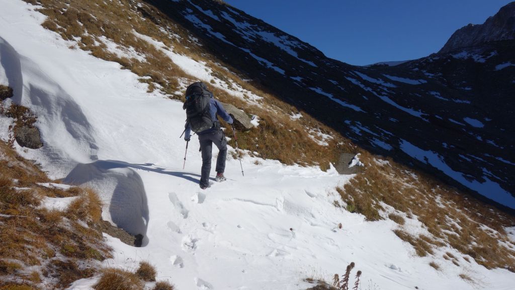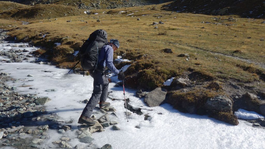Als er nog veel sneeuw ligt, zijn een paar stijgijzers en een pikkel echt wel nodig, maar ik zou toch aanraden om deze tocht met soms hele hoge en steile bergpassen (tot 3000m) later in de zomer te doen om risico’s te vermijden.