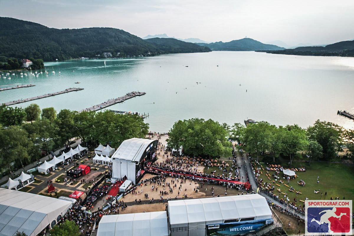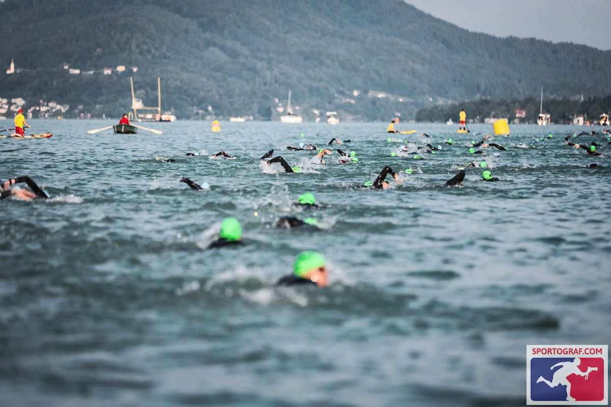 Het melkachtige water van de prachtige Würthersee is 21° warm, en wetsuits zijn dus toegelaten. Licht briesje, stralend weer en een gemoedelijke sfeer. Met de rolling start duurt het lang voor ik eindelijk het water in kan. Maar dan is het opeens zover. Efkes slikken en hup het sop in.
