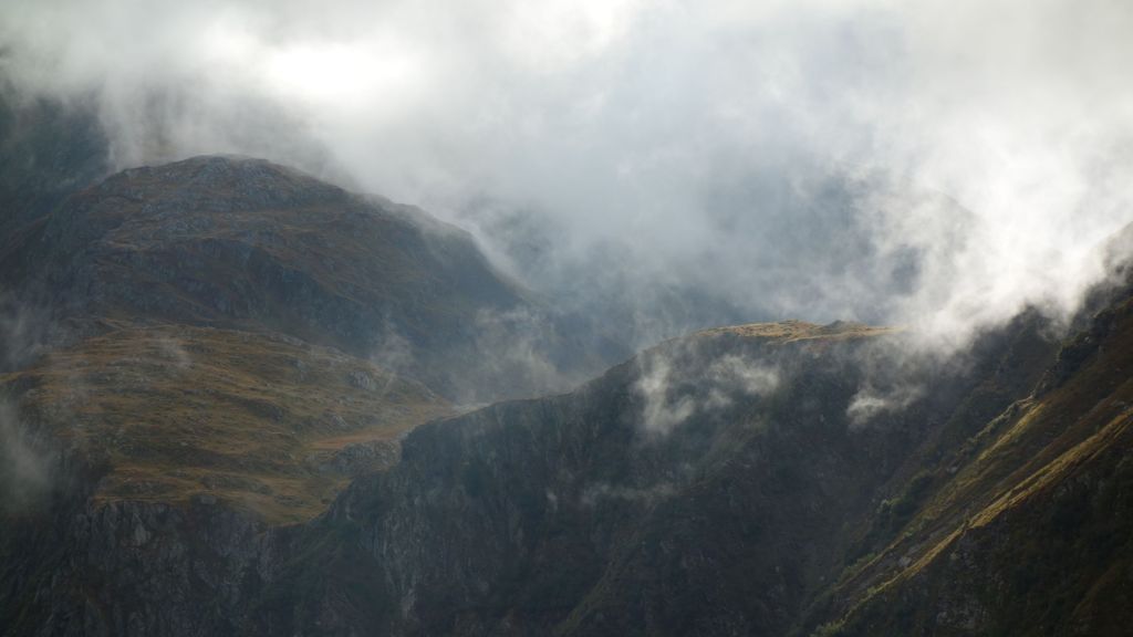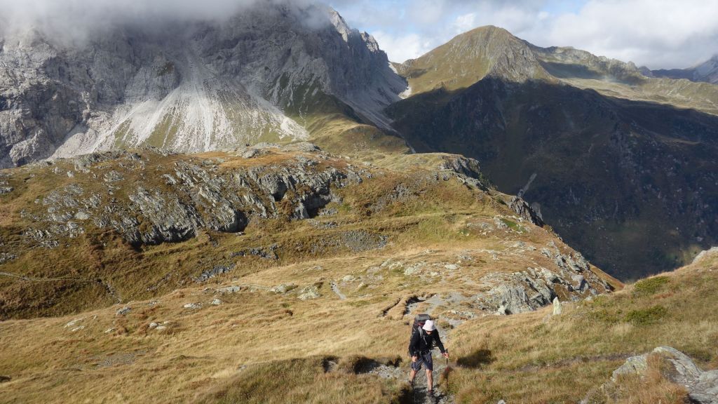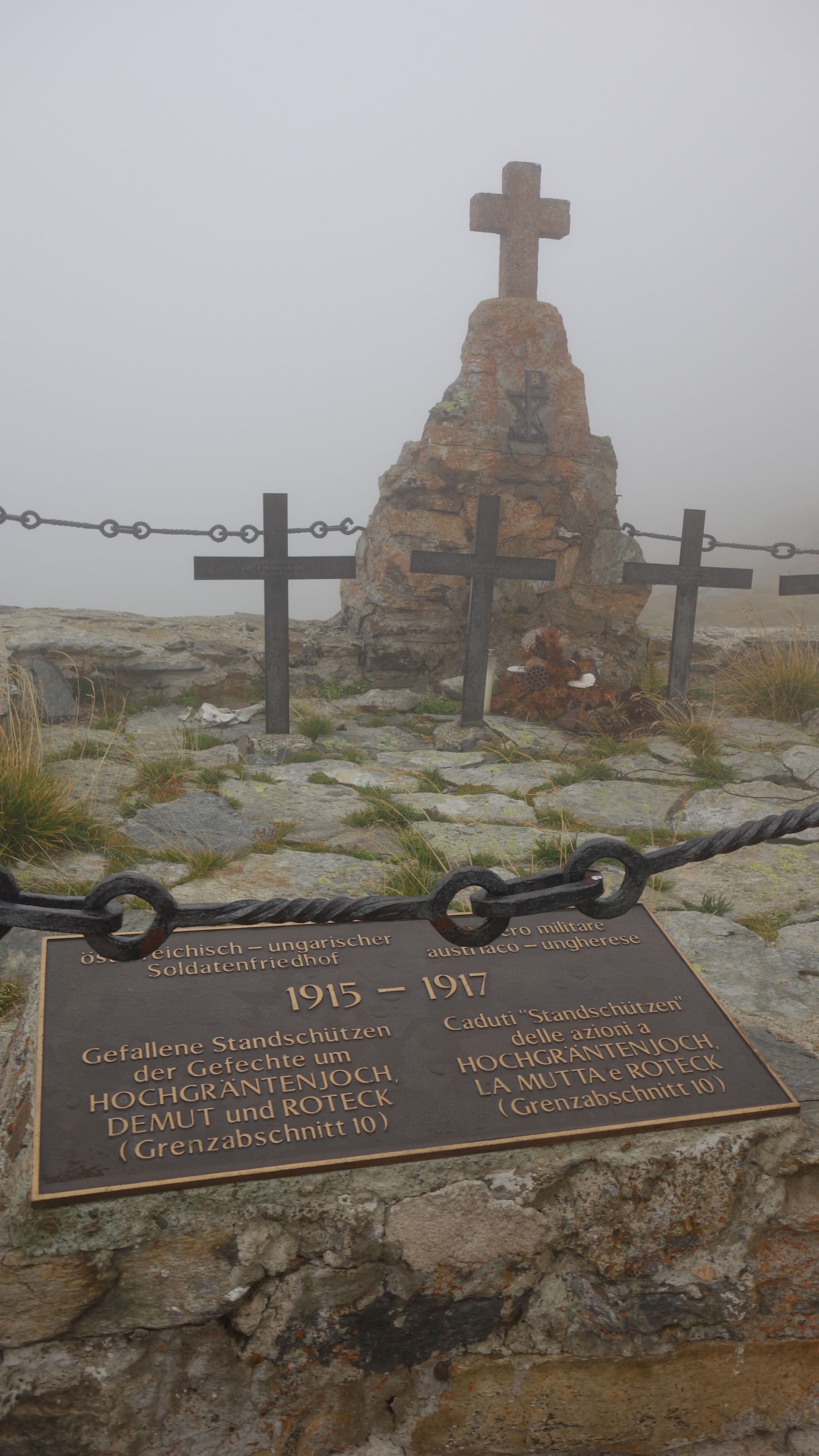 Na een stevige klim volgen we de bergkam verder richting de Hochgräntenjoch. Het pad werd aangelegd in WO I. Militaire platforms en oorlogsgraven getuigen van dit woelige verleden. Als het weer begint om te slaan, zetten we de tarp op nabij Hollbrucker Seen. Intussen zitten we in de wolken.