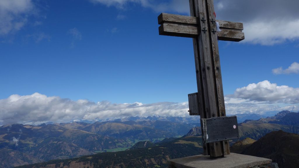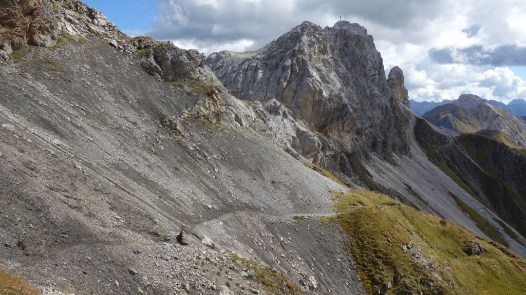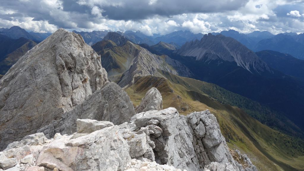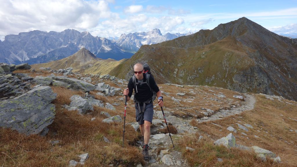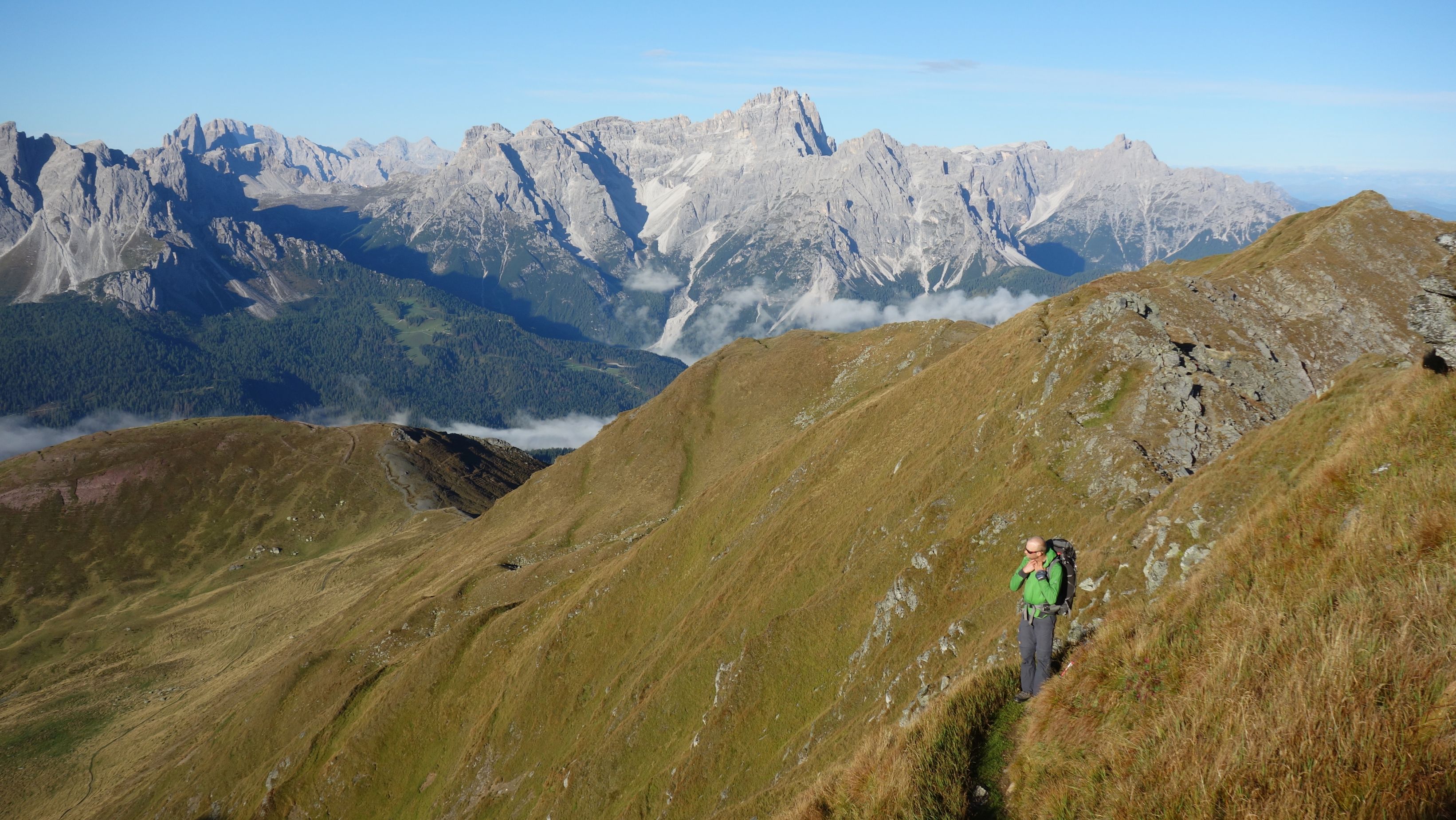 Via de Pfannspitze pikken we terug de Italiaanse grens op. Wie een via ferrata-uitrusting bij zich heeft, kan de Große Kinigat van noord naar zuid oversteken, maar dat kon er niet meer bij in de rugzak. Dus trekken we onderlangs de top, laten onze bagage achter bij het Filmoorsattel en klimmen via de wandelroute langs de zuidkant omhoog. Prachtig zicht!