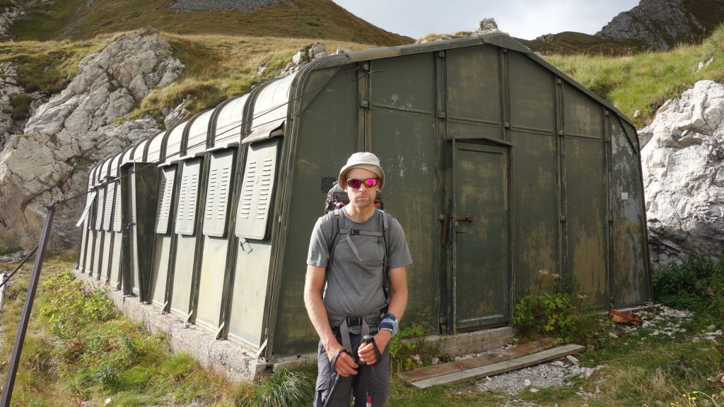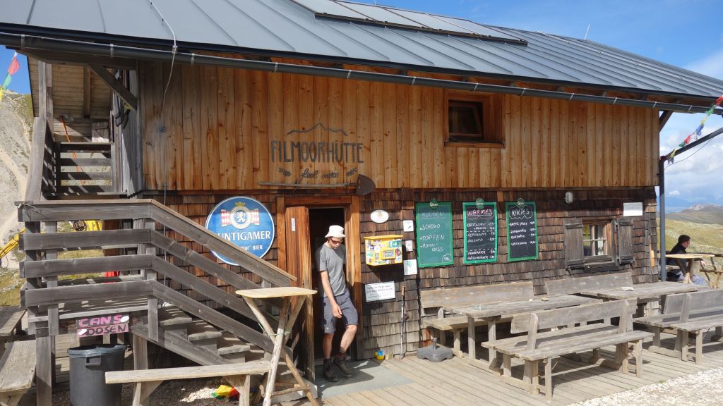 Aan de sfeervolle Filmoorhütte laven we de dorst met een halve liter schiwasser. Ons laatste doel van de dag is Bivacco a Piva, maar de bivakhut is allesbehalve uitnodigend als slaapplaats. Dus wordt het terug een nachtje onder het zeil nabij de onverharde weg die zich uit het dal naar boven slingert. De elektriciteitsmasten proberen we weg te denken. Soms is een bivakplek wel praktisch, maar niet perse gezellig. Hogerop is er geen water meer.