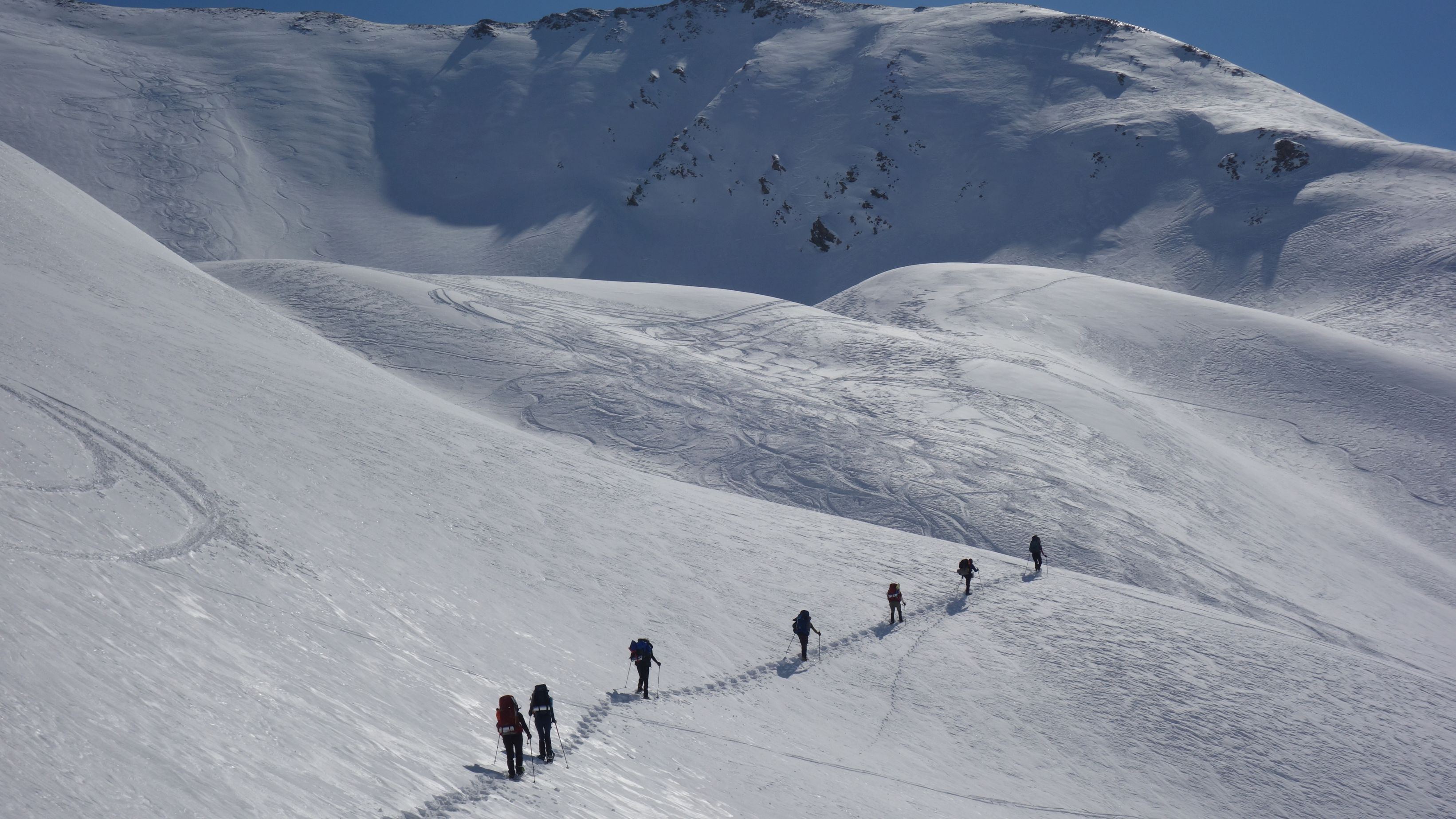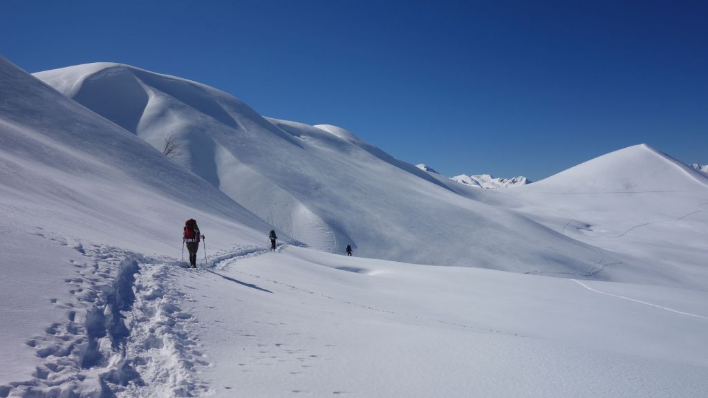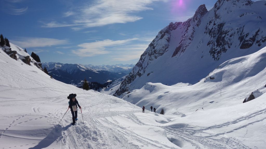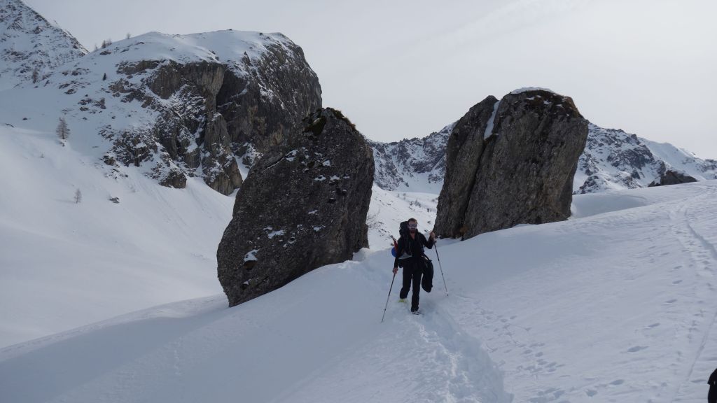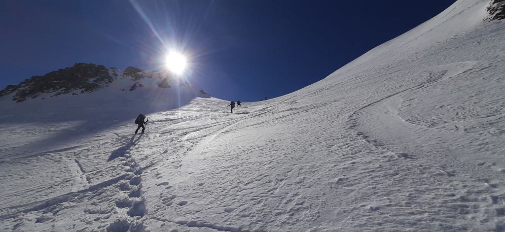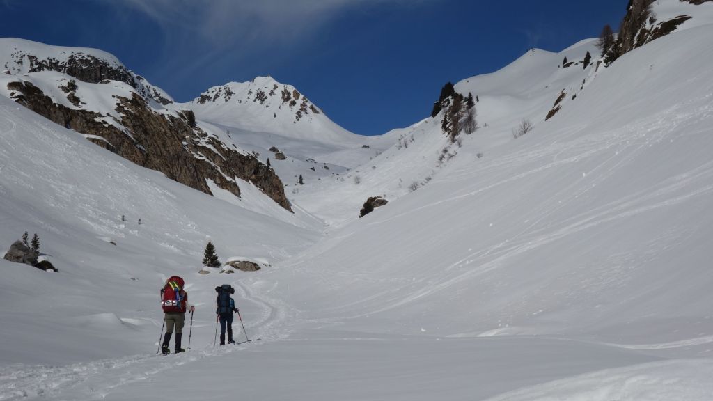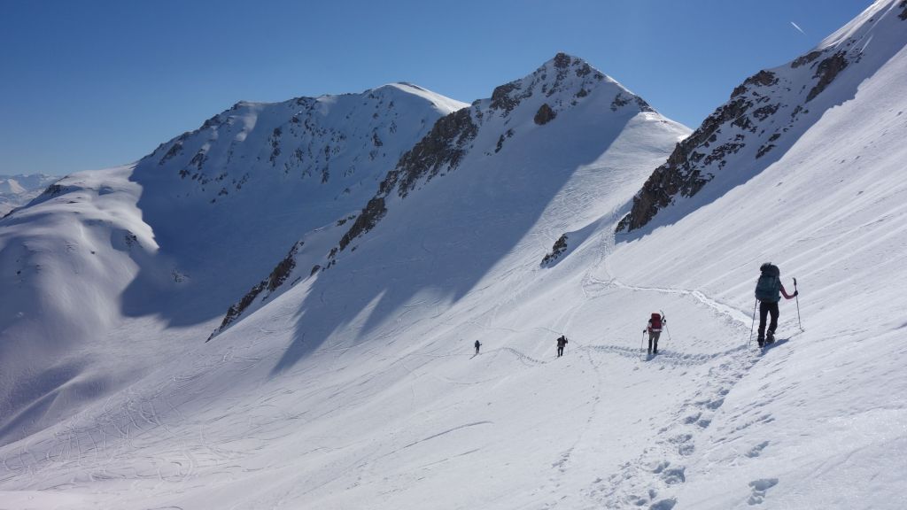 Zo gezegd, zo gedaan. We hebben geluk met de weerscondities en kunnen ook gebruik maken van de diverse toerski-sporen naar de col. Het is soms wel wat uitkijken naar welk traject het meest is aangewezen. Zo dalen we even af om uit een steile flank te blijven en zo een andere spoor op te pikken dat vanuit het dal zigzaggend omhoog gaat.