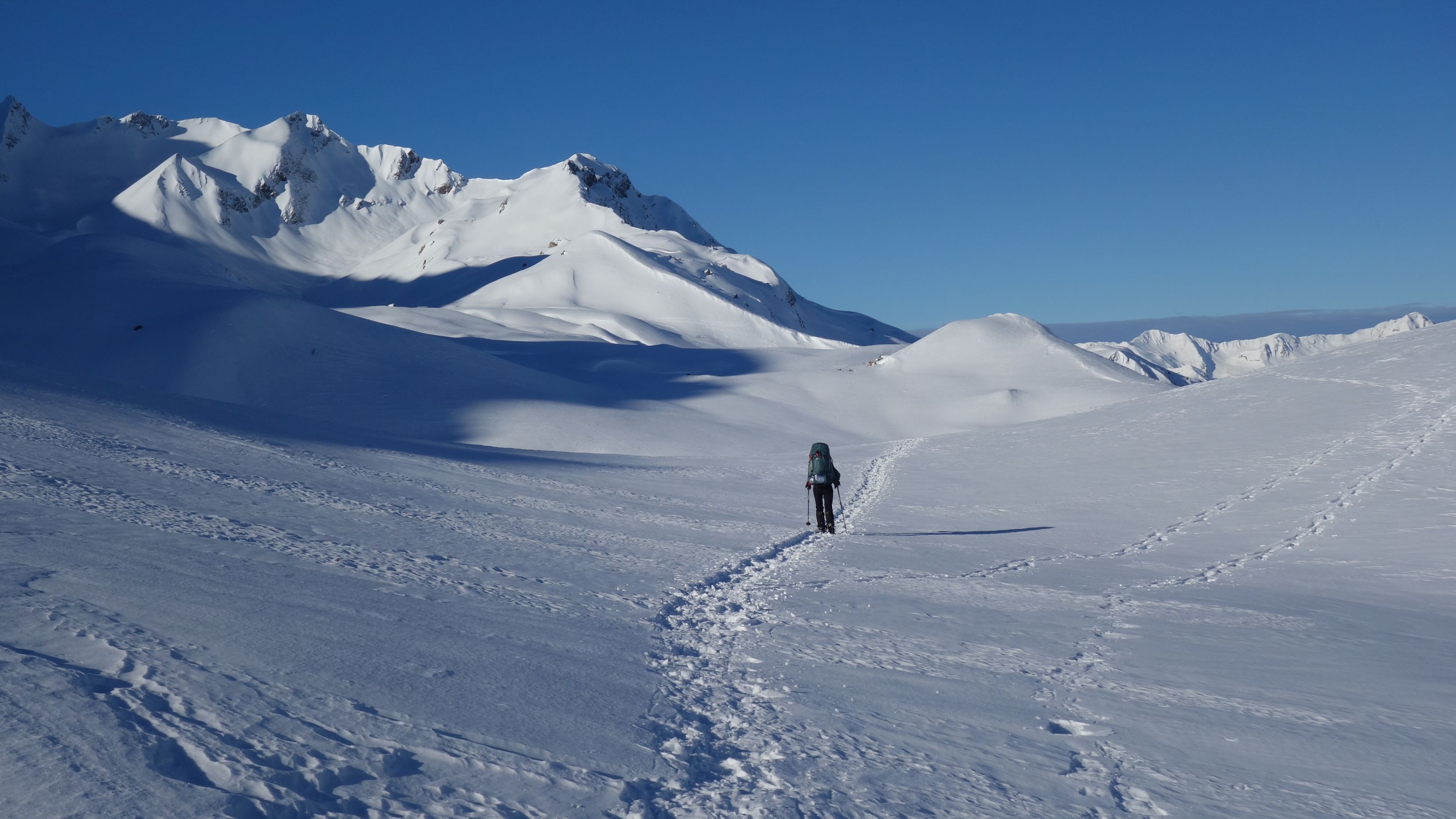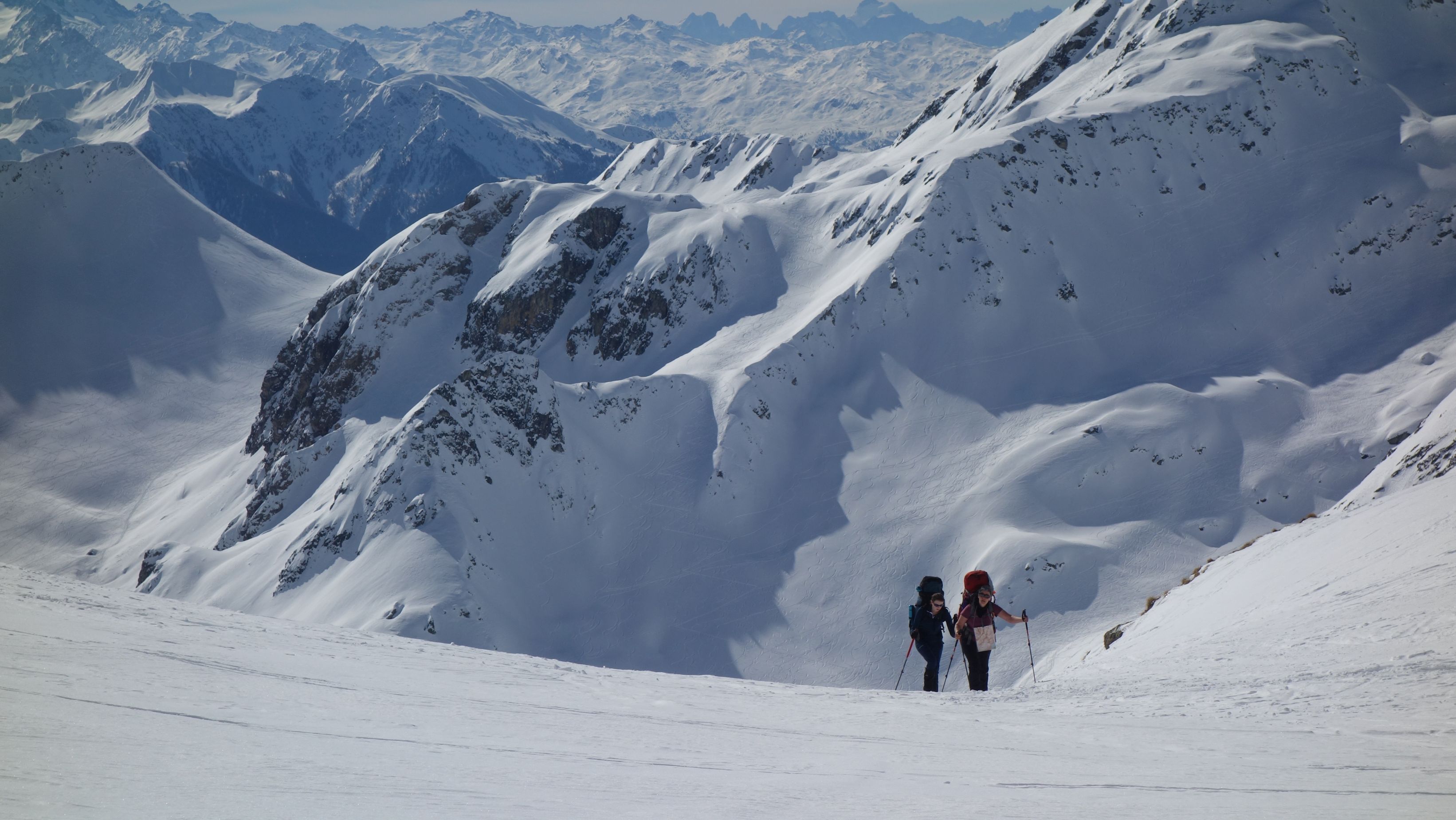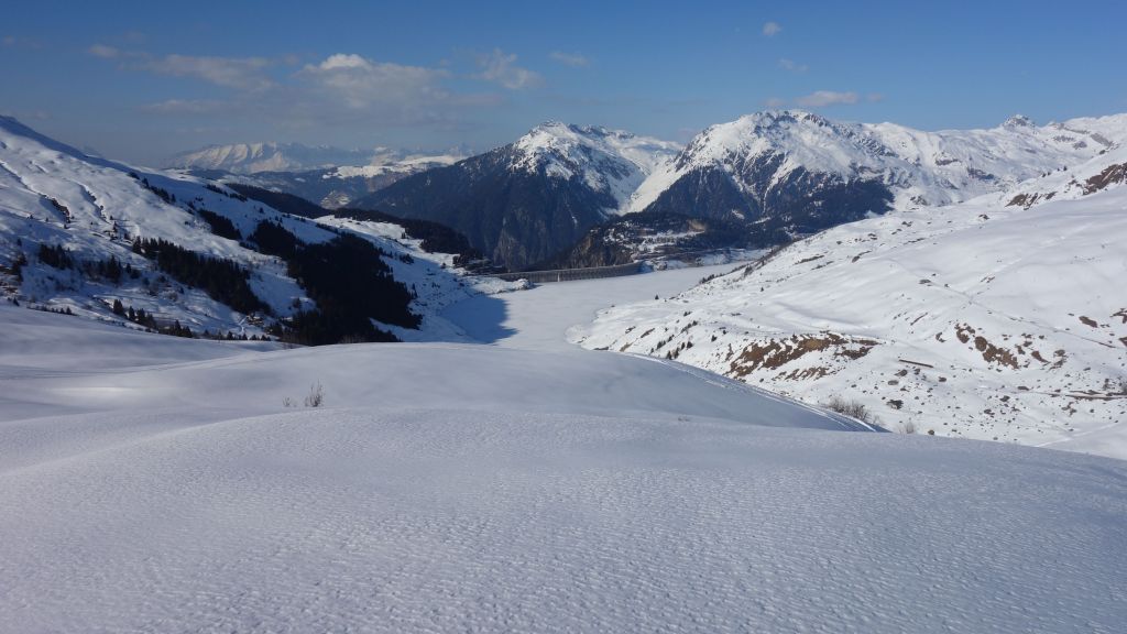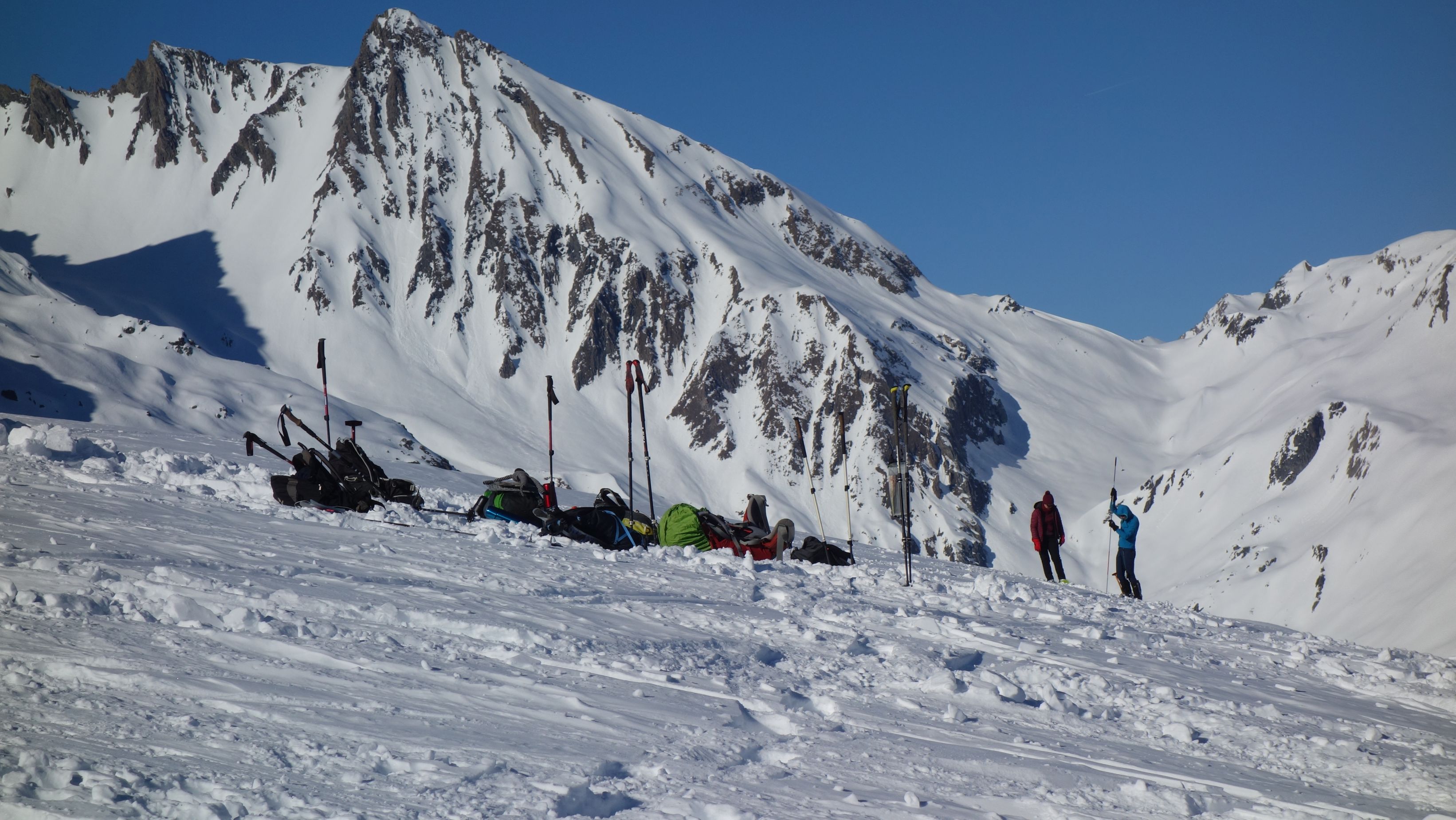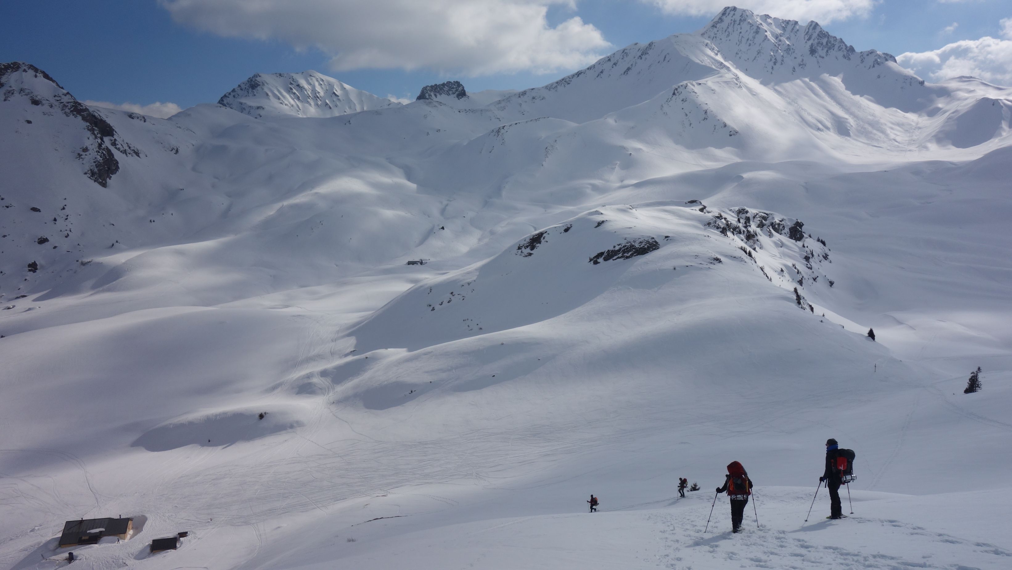 Zo gezegd, zo gedaan. We hebben geluk met de weerscondities en kunnen ook gebruik maken van de diverse toerski-sporen naar de col. Het is soms wel wat uitkijken naar welk traject het meest is aangewezen. Zo dalen we even af om uit een steile flank te blijven en zo een andere spoor op te pikken dat vanuit het dal zigzaggend omhoog gaat.