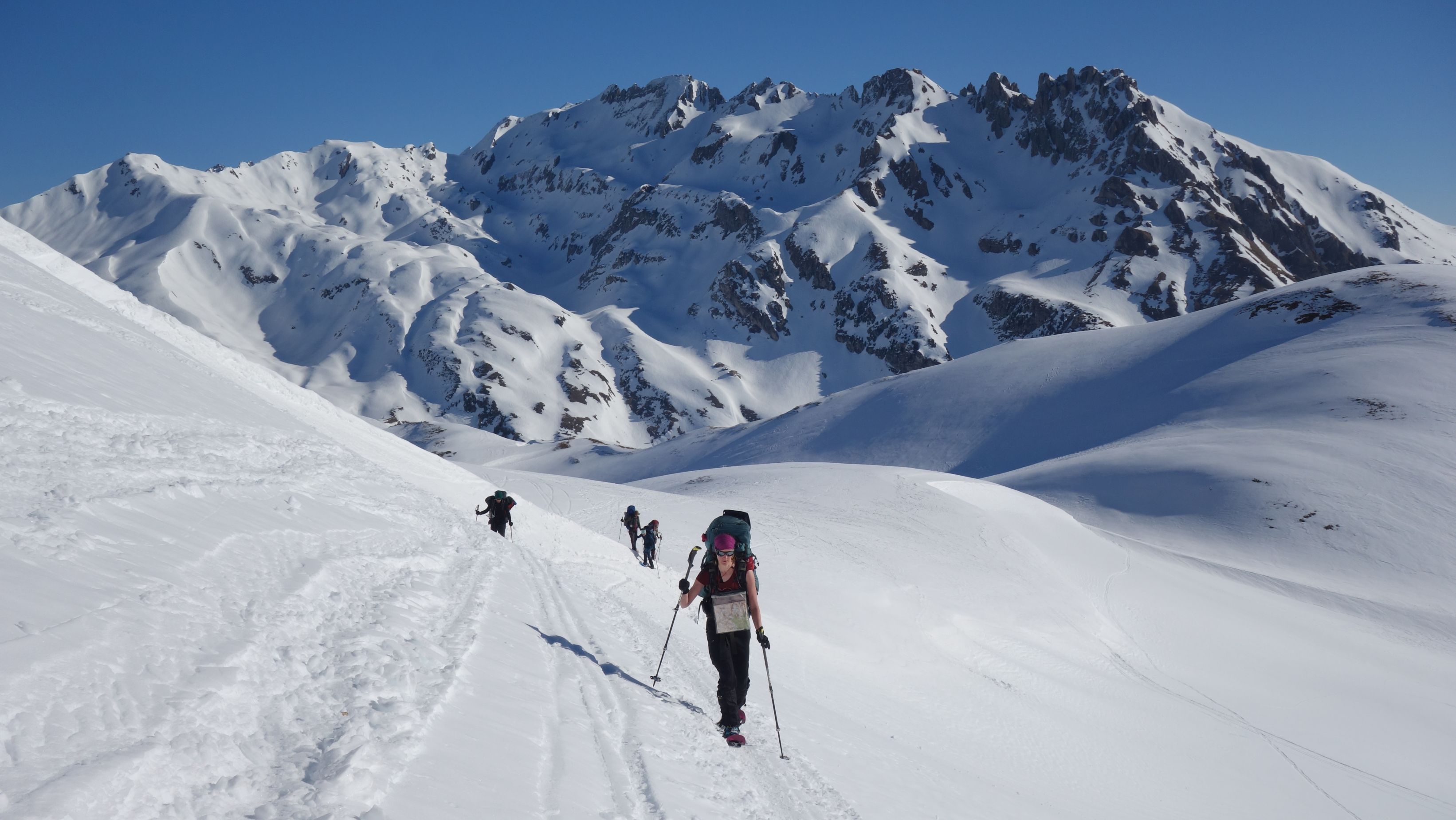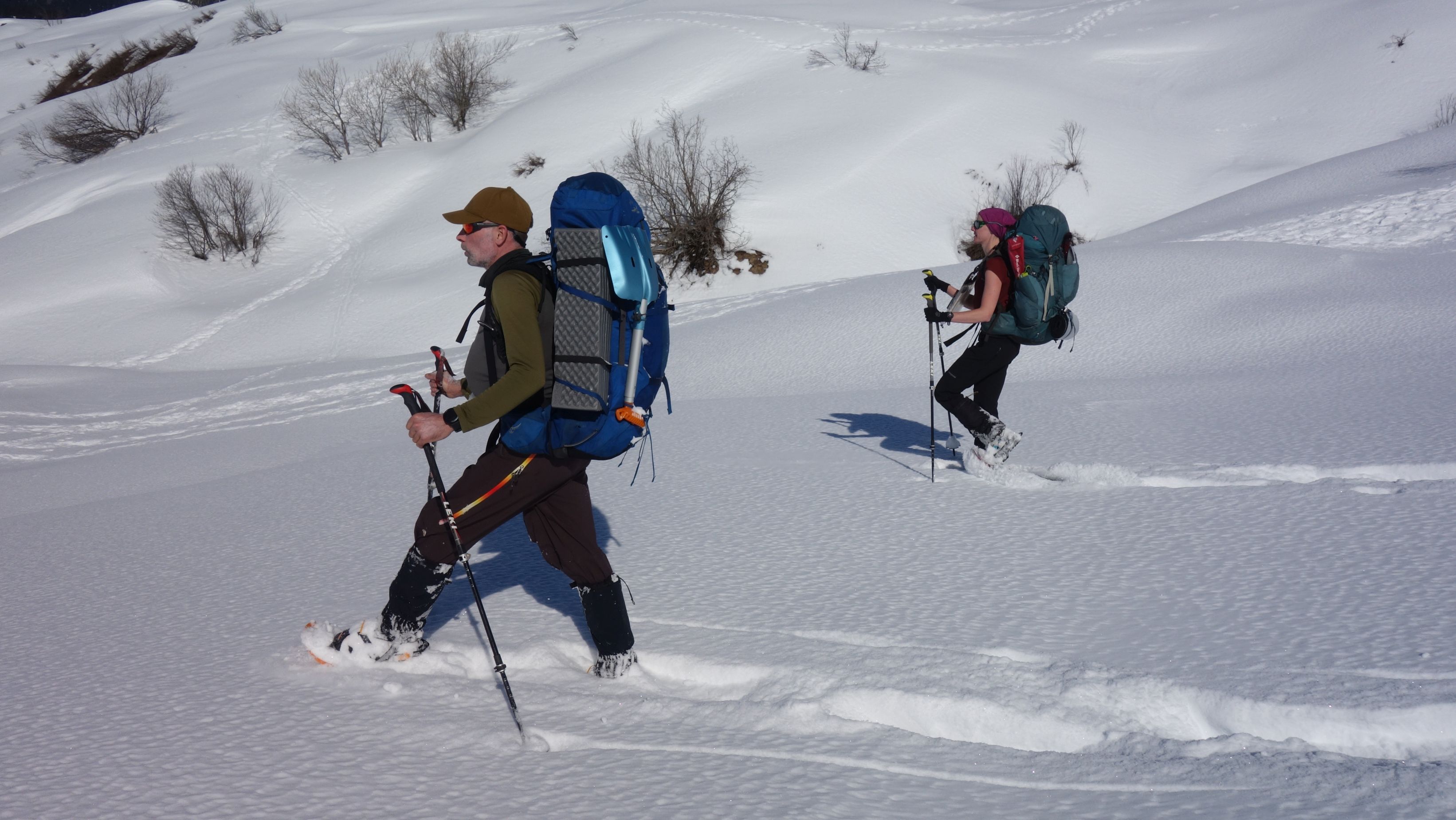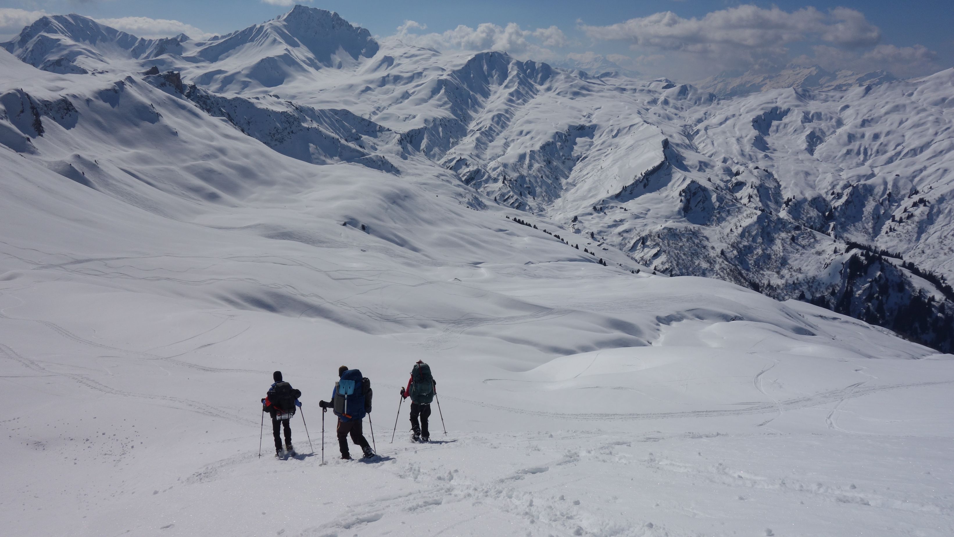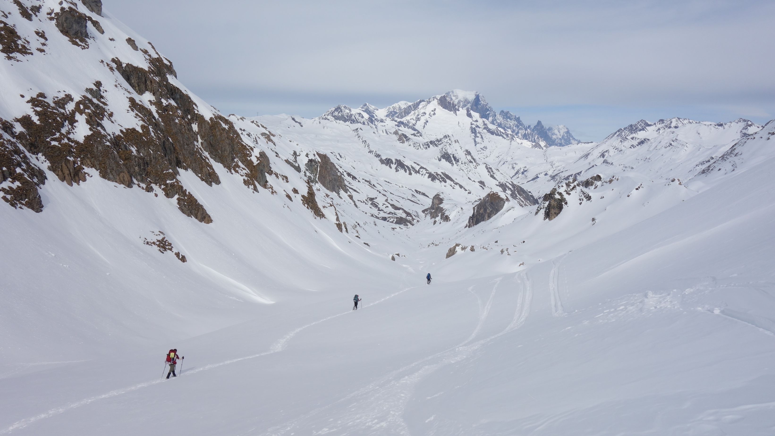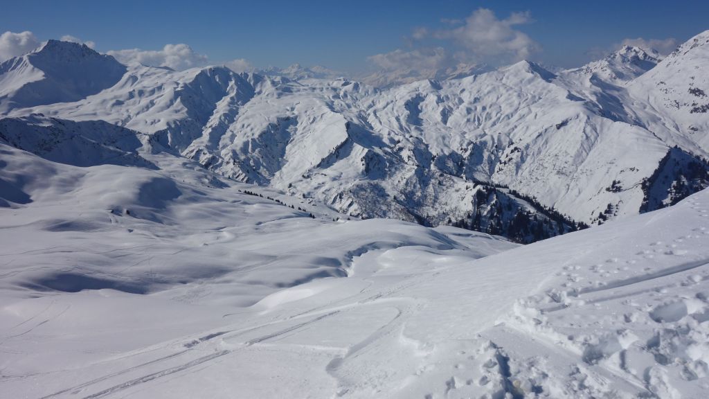 Zo gezegd, zo gedaan. We hebben geluk met de weerscondities en kunnen ook gebruik maken van de diverse toerski-sporen naar de col. Het is soms wel wat uitkijken naar welk traject het meest is aangewezen. Zo dalen we even af om uit een steile flank te blijven en zo een andere spoor op te pikken dat vanuit het dal zigzaggend omhoog gaat.