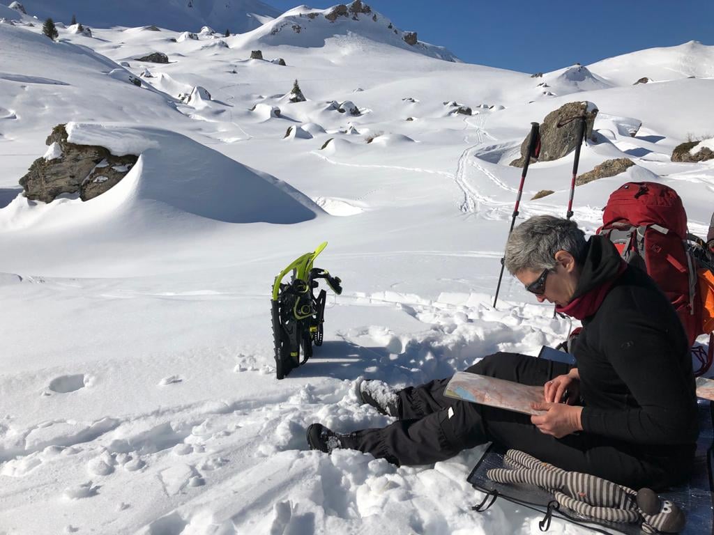 In de afdaling wordt er met kaart & kompas genavigeerd. Niet eenvoudig want in de winter zijn er weinig oriëntatiepunten. Terug in de auberge bespreken we de lawinesituatie en weersvoorspellingen voor de komende dagen. De groep heeft zin in een uitdagende tocht en de condities lijken optimaal om dat plan uit te voeren.