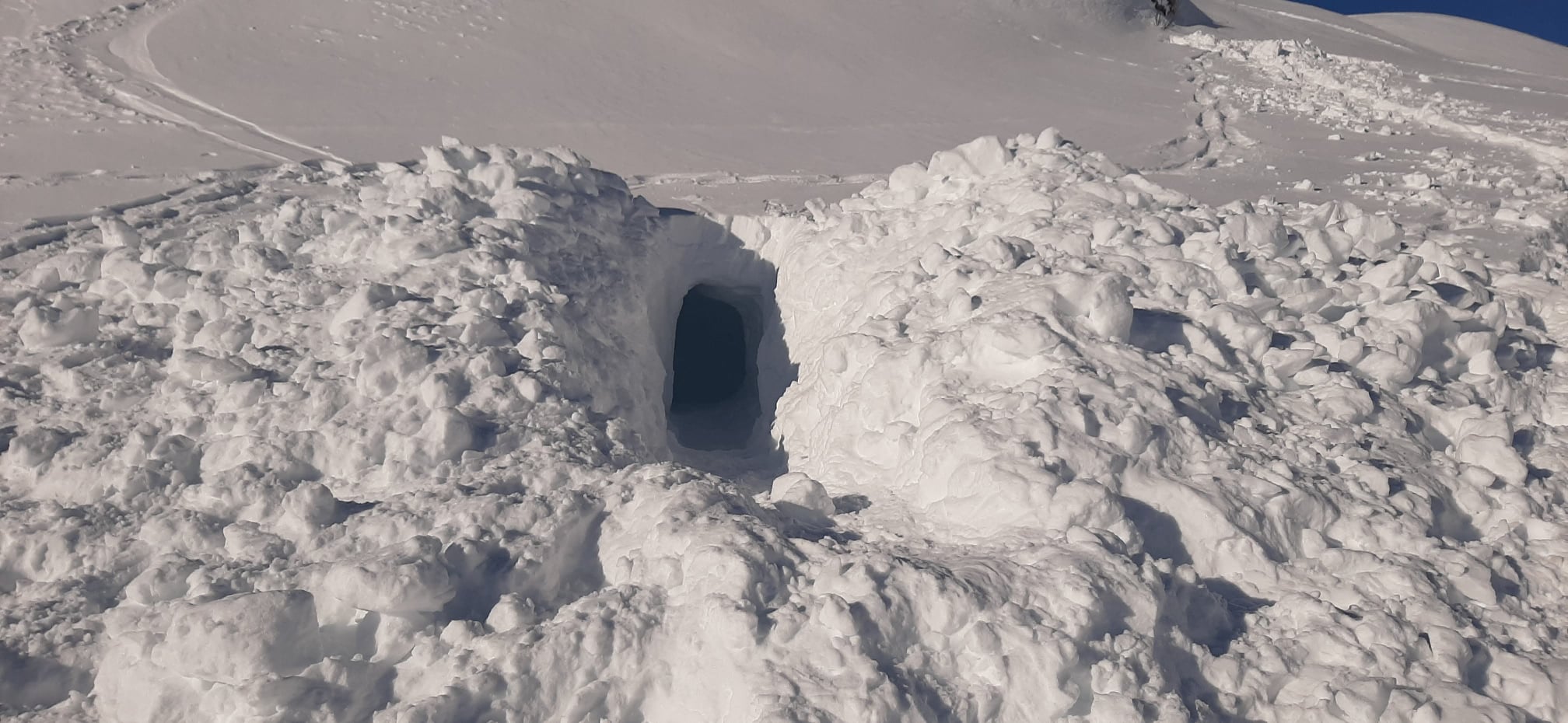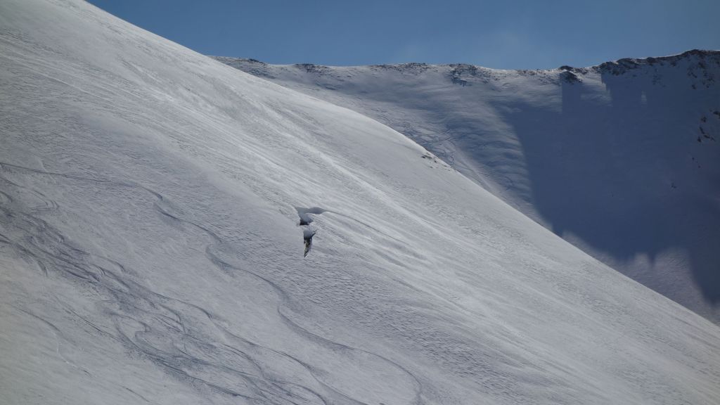 In de afdaling komen we onderlangs een ‘fischmaule’, een breuk in het sneeuwdek en altijd een teken van instabiliteit. Alternatieve passages zijn er niet, dus valt dus niet te veel te lanterfanten.