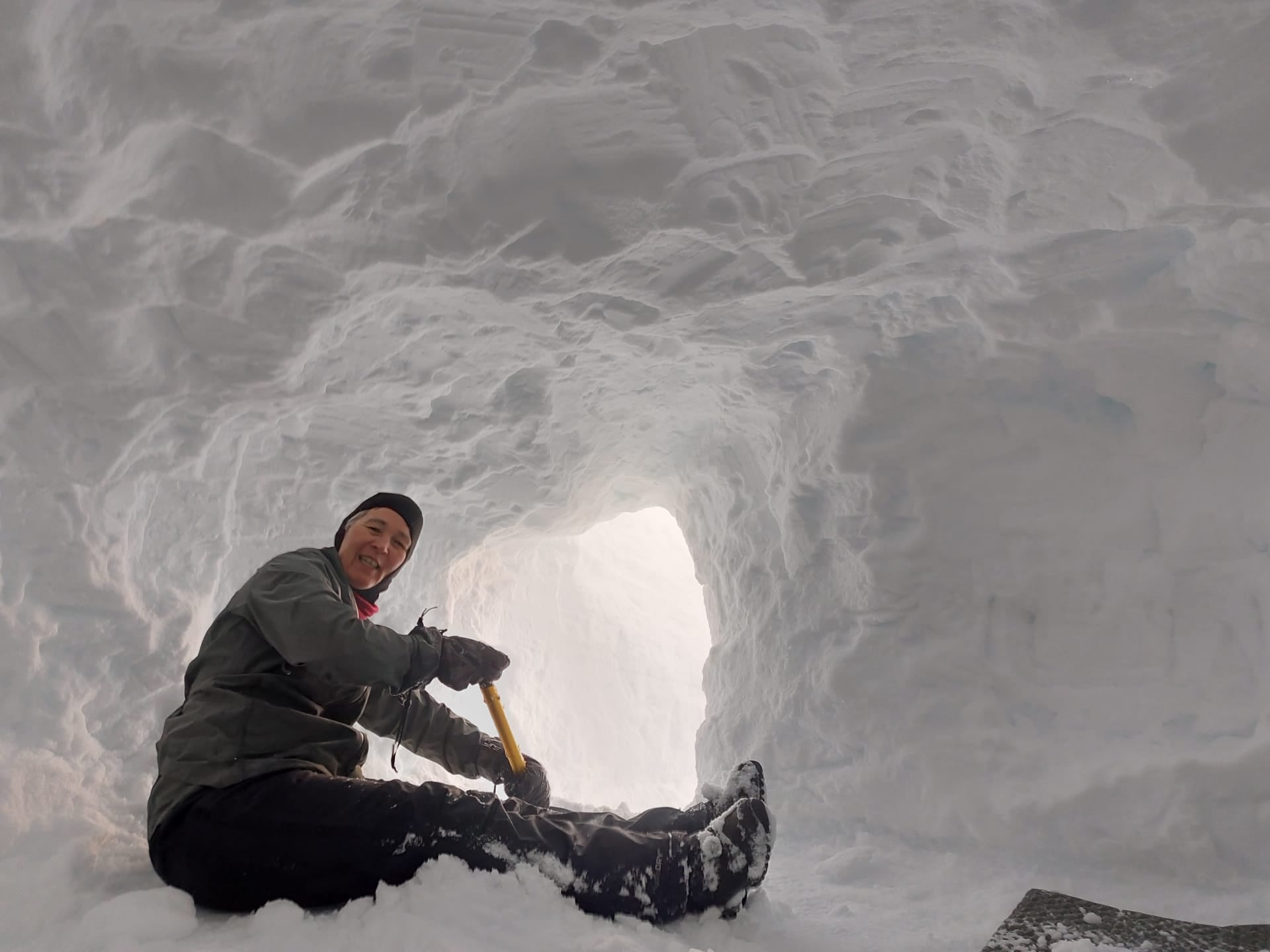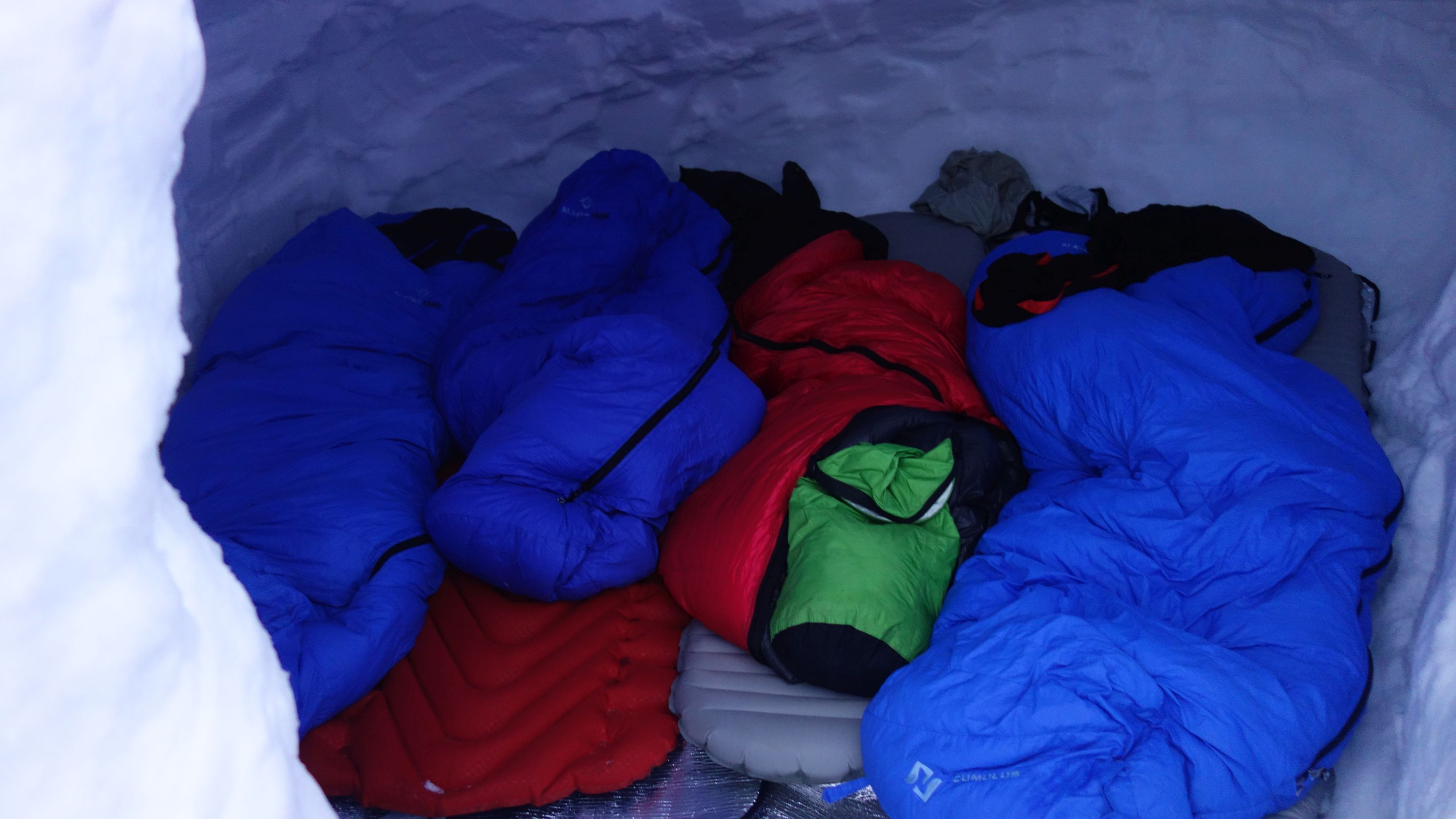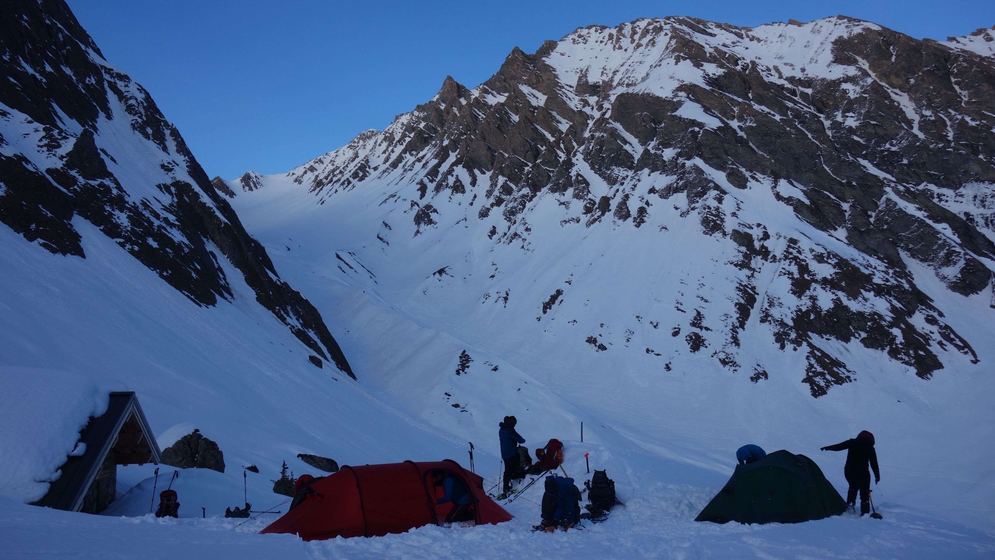 In de vroege namiddag bereiken we al Refuge de la Coire en is er dus nog genoeg tijd om een hol te graven voor onze laatste bivaknacht. Met de sonde vinden we een goeie sneeuwdiepte op de flank van een heuvel ten zuidwesten van de hut. Na enkele uren zwoegen hebben we twee mooie slaapruimtes gemaakt. In de hut keuvelen we nog wat na bij het avondeten. Mijn deelnemers zijn er niet helemaal gerust in dat het met de nachtrust goed gaat komen.