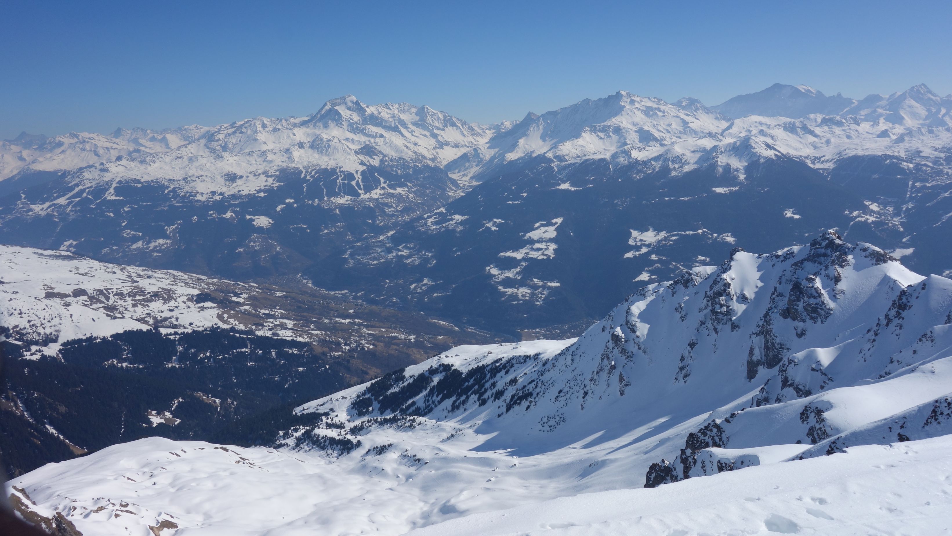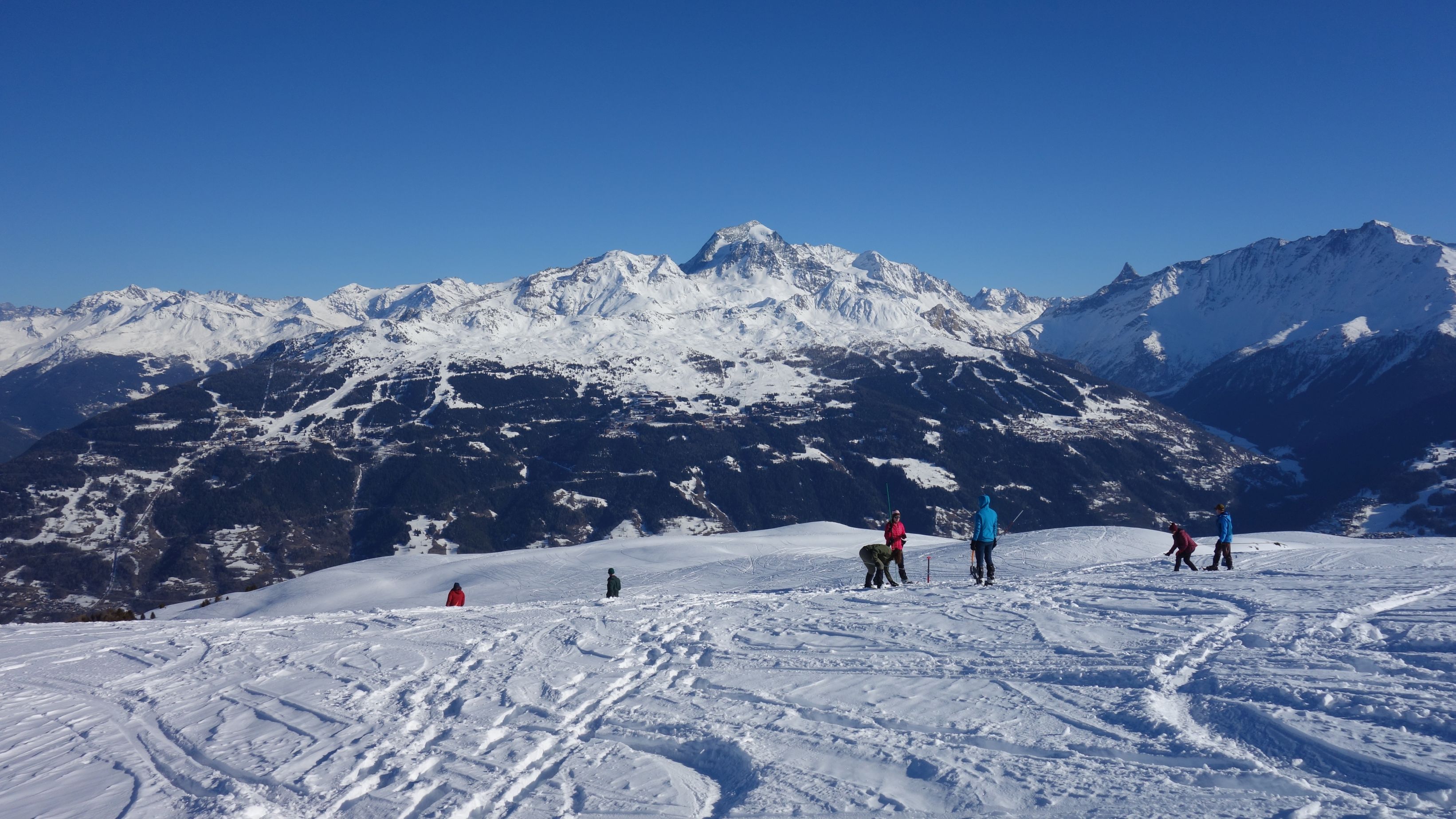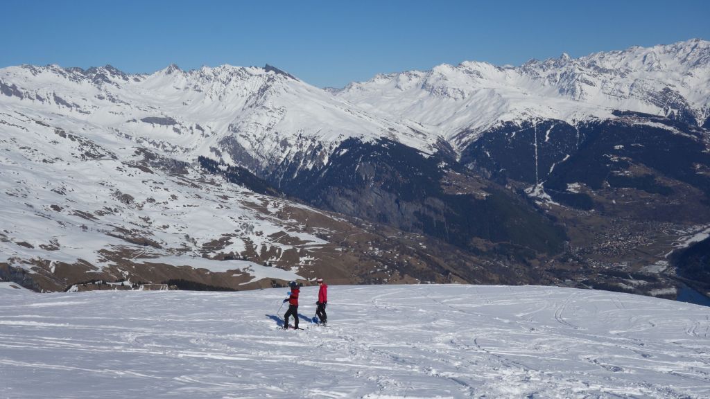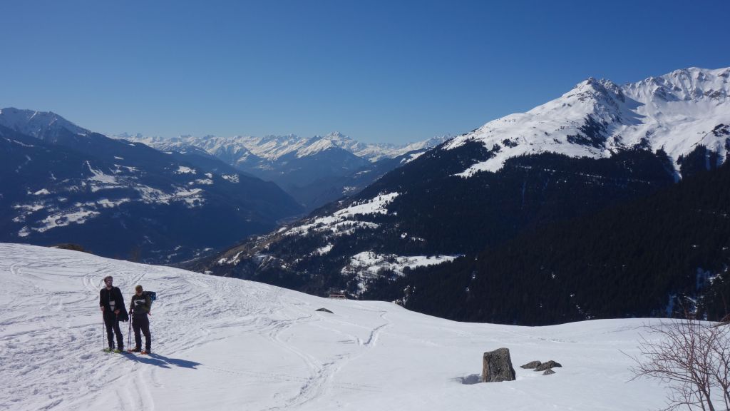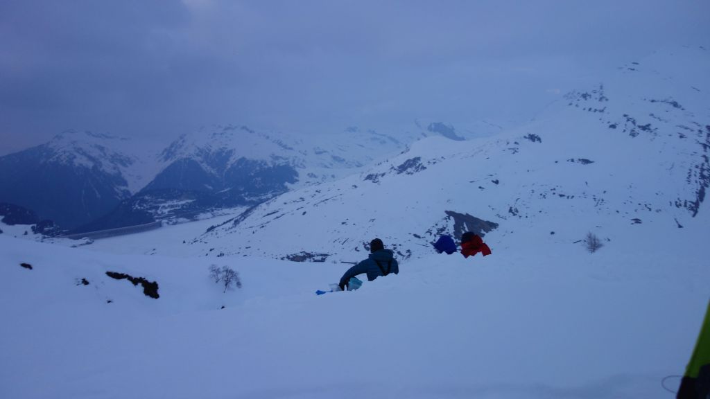 Na de lunch is het hoog tijd om aan de afdaling te beginnen. De warme temperaturen zorgen er voor dat de sneeuw snel aan draagkracht verliest en dat het lawinegevaar ook wat stijgt. Op de kam valt het goed mee, maar hoe lager we zakken, hoe lastiger het wordt. Pas bij Pra Plan zijn de delicatere passages achter de rug en kunnen we terug wat langer pauzeren.