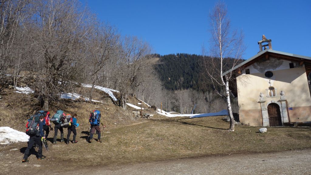 ’t Is zover, de kolossen van rugzakken worden met enige moeite opgetild en aangegespt. We worden eensklaps 5 centimeters korter. Via het parcours van de Tour du Beaufortain verlaten we Granier, en glibberen over enkele ijsplekken op het pad.