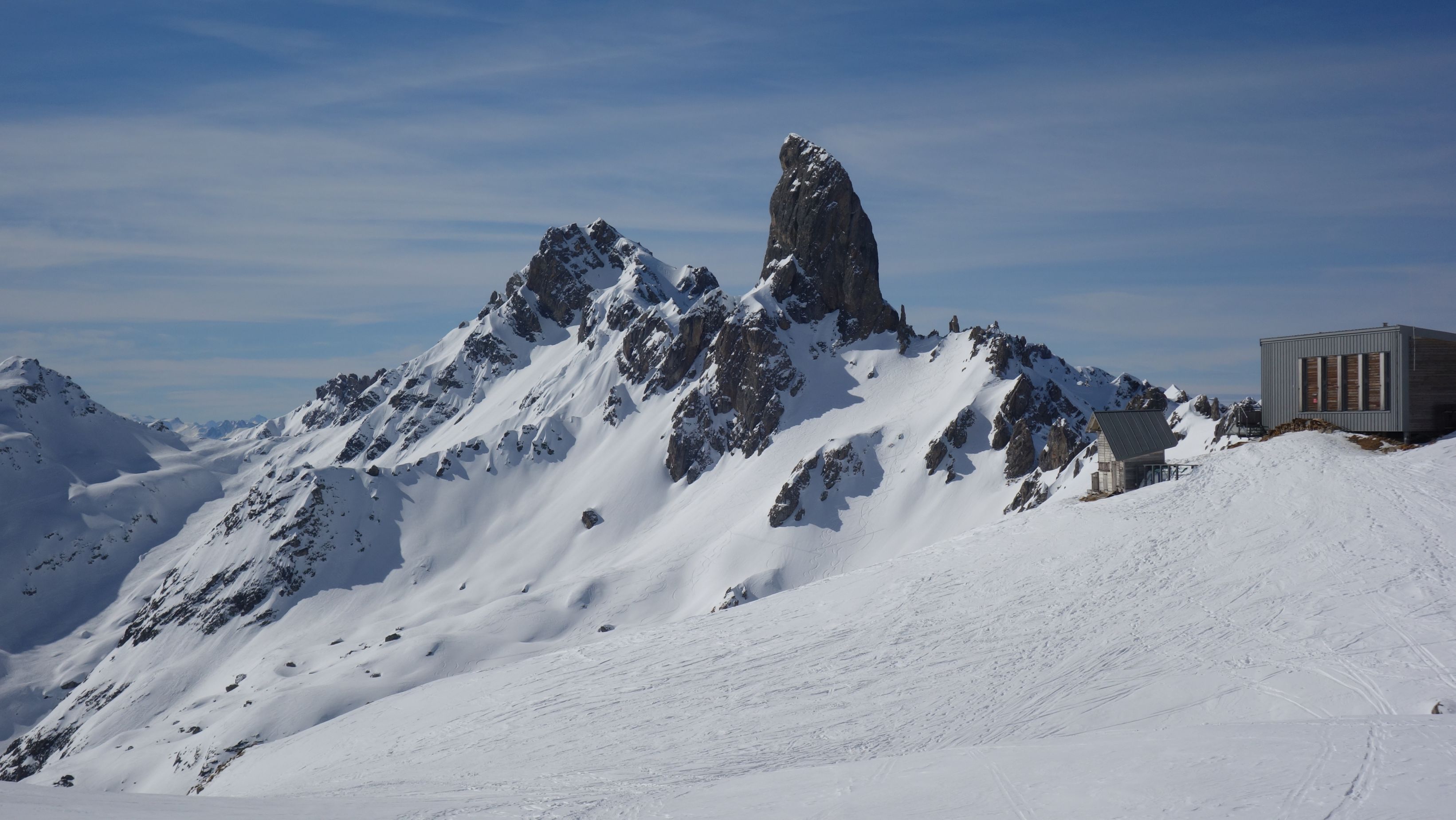 Via le Vâ gaat het weer stevig omhoog. Het is teamwerk om een goed zigzagspoor te maken in de diepsneeuw naar Chalet de Couvercle. Aan de kop wordt er afgewisseld. We zijn best opgelucht om onze rugzak te kunnen afwerpen. Het wolkendek schuift toe. De die-hards zitten terug buiten, ik kruip snel in mijn donzen cocon.