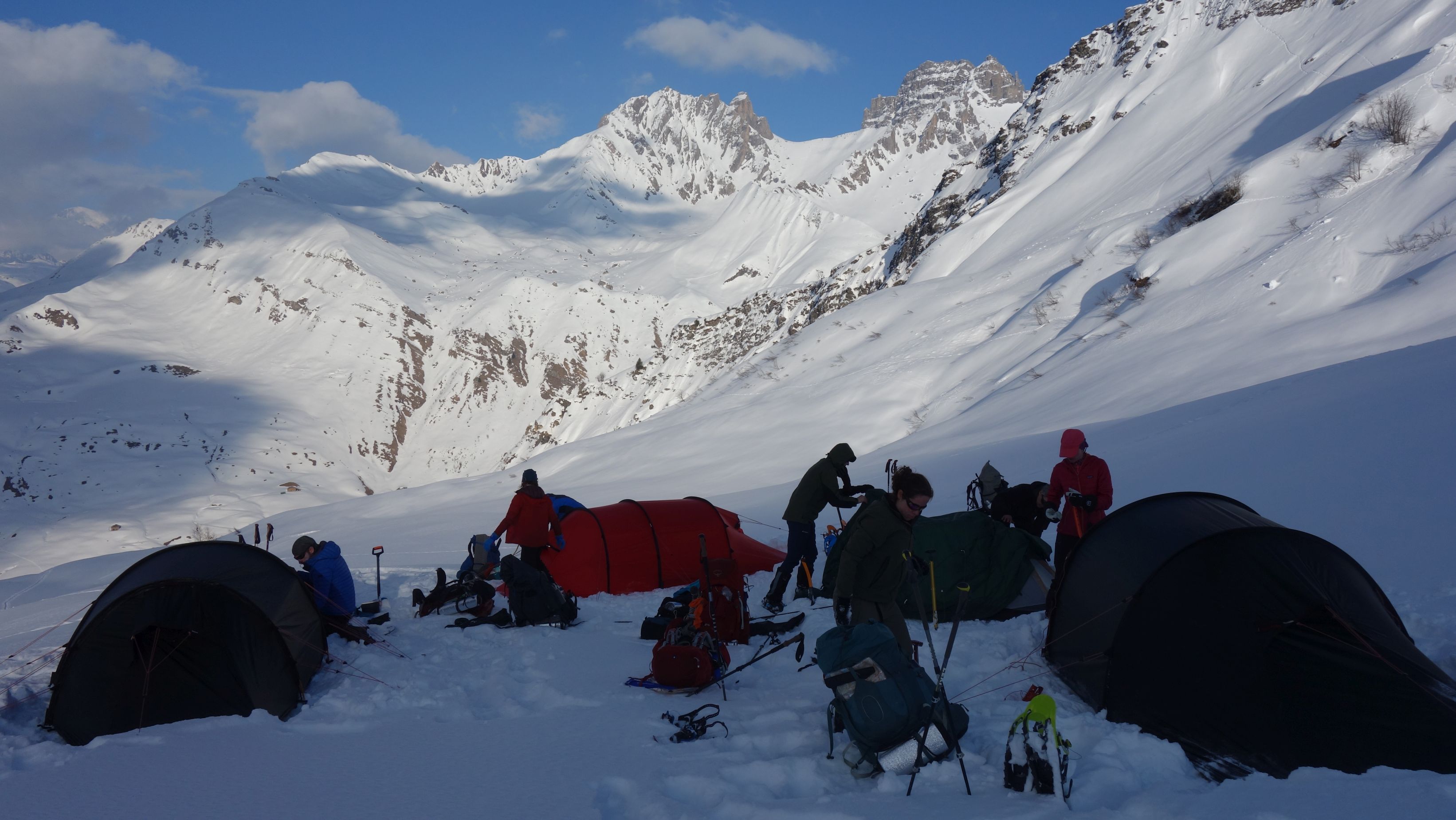 Iedereen blijkt goed geslapen te hebben, tot hun eigen verrassing. Vaak is het warmer in een hol dan in de tent dankzij de isolatie van de sneeuw, beetje afhankelijk van hoe groot je de ingang gemaakt hebt. Er is alleszins genoeg energie voor de laatste dag. Zowaar de koninginnenetappe van de tocht! Er staat ons een lange en stevige tocht te wachten. Via de Col de Corne Noire willen we doorsteken naar Point du Combe Bénite (2.575m).