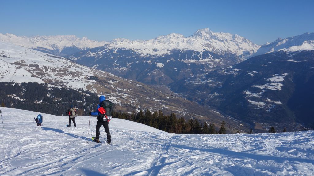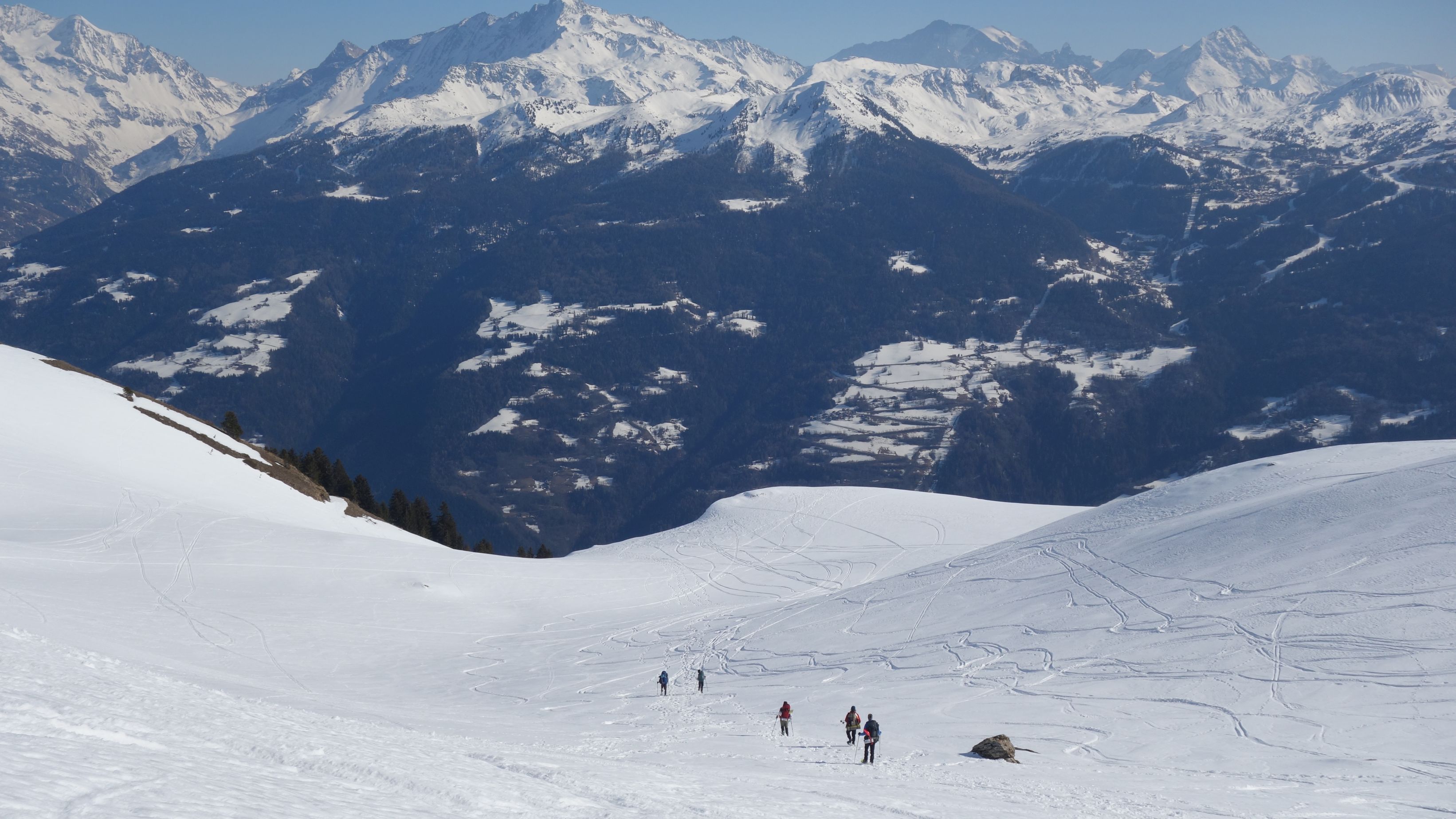 Aan de voet van de helling komt een toerski-spoor vanuit het dal omhoog richting de populaire Mont Coin. Best handig. Zo kunnen we vlot een kom bereiken op 2.200 meter hoogte.