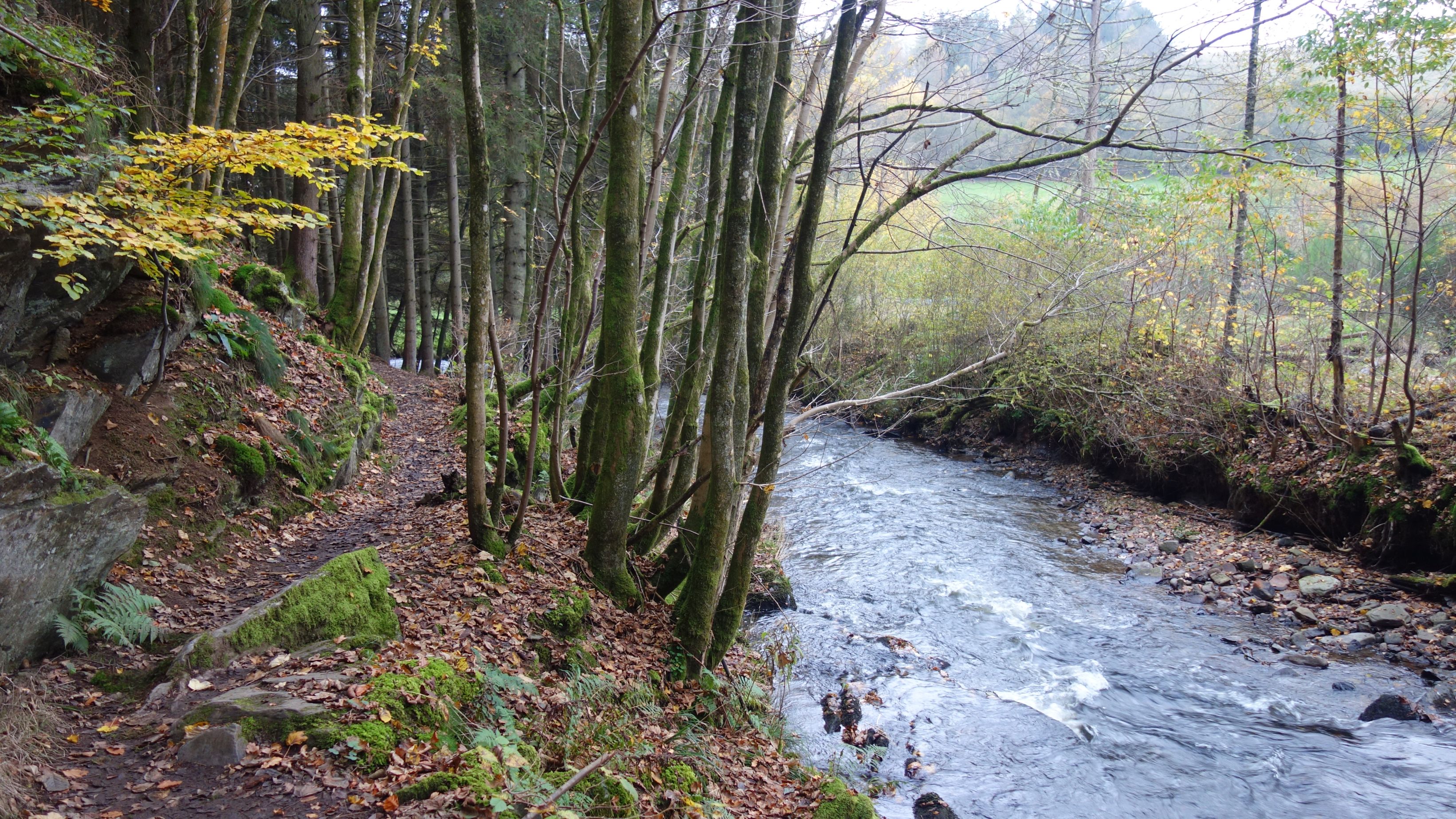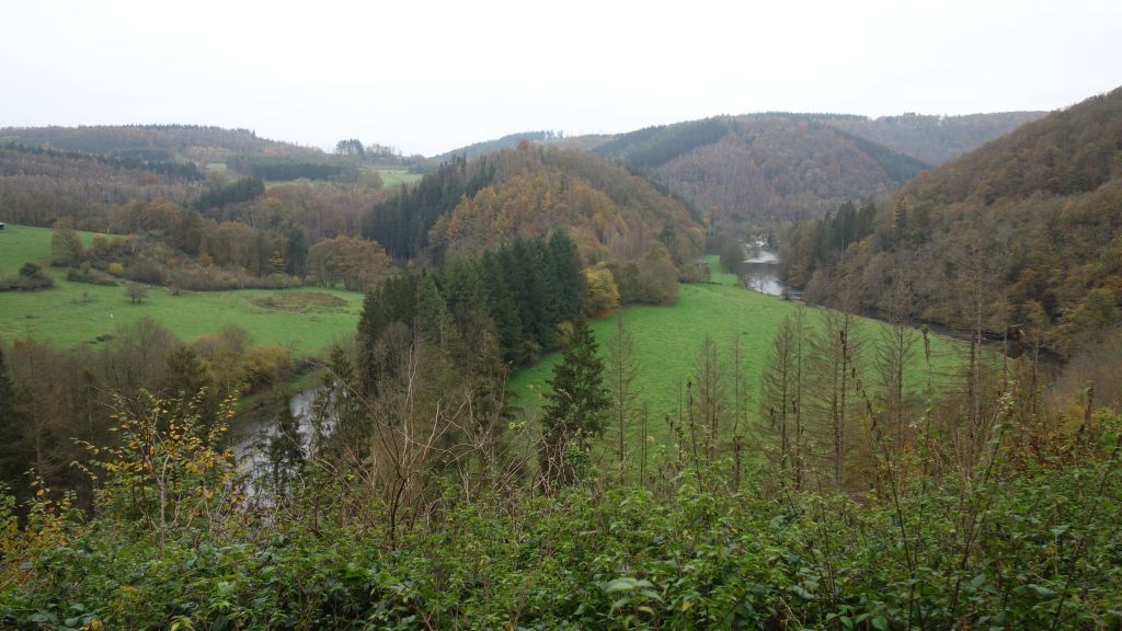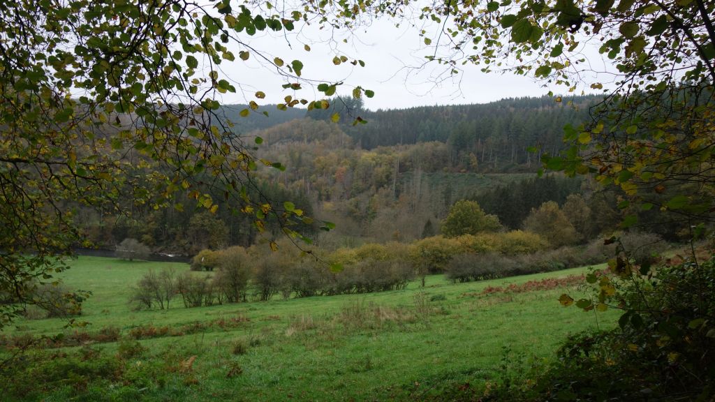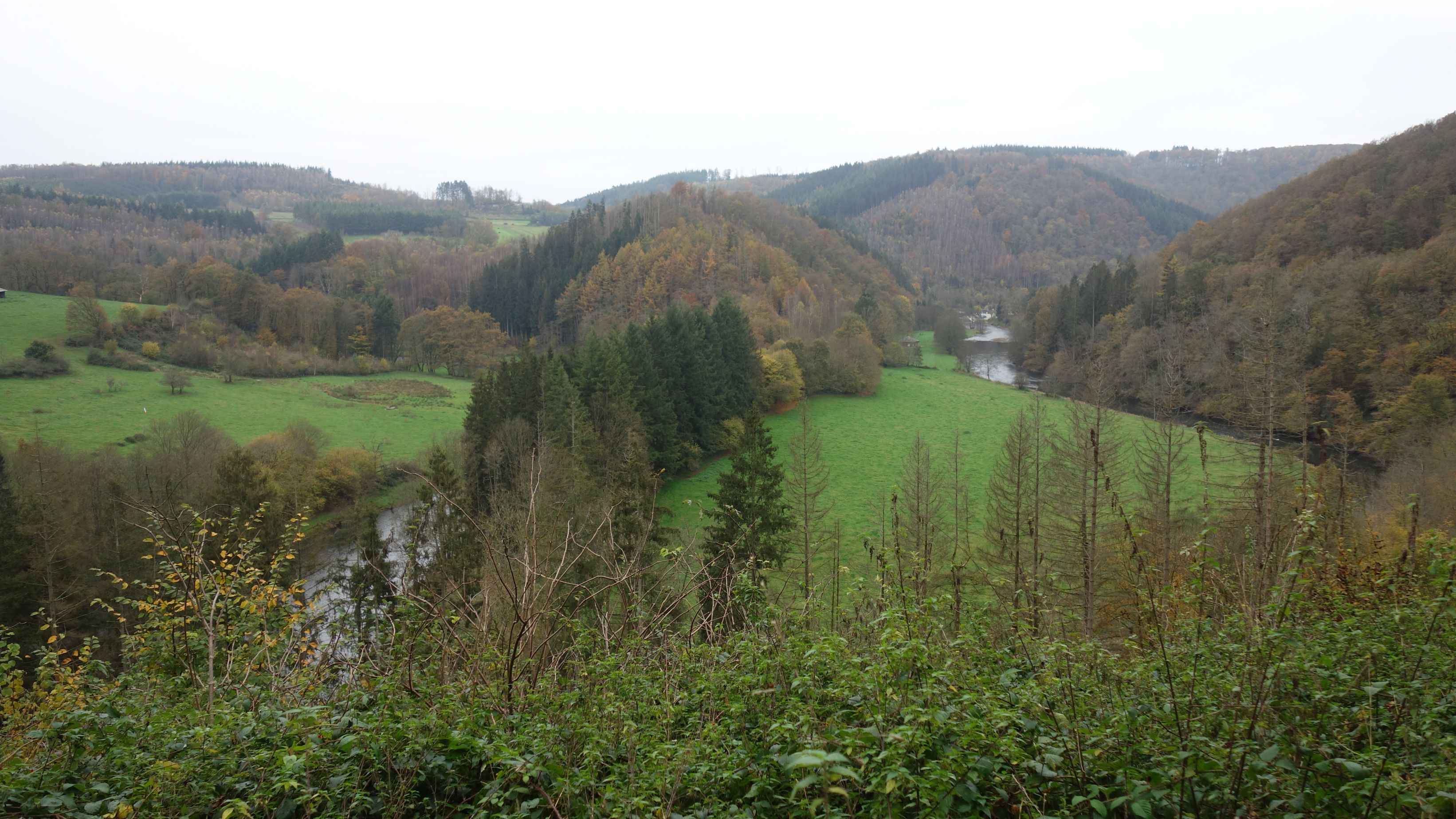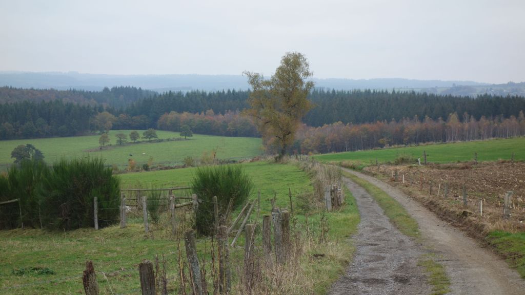 Een eenvoudig uitloopdagje zou het worden, dacht ik. We steken even door een loofbos door en kunnen zo snel een onverharde weg op. Wat verder komen we de Eisleck Trail tegen die ons terug naar de Ourthe brengt. Daar zou volgens Alpenvereinaktiv een paadje moeten liggen dat stroomopwaarts de rivier volgt maar het verdwijnt al snel de ‘brousse’ in. Ivo begint te mopperen maar blijft me volgen. Wat later ploeteren we door de modder en lijkt er geen doorkomen meer aan. Dan maar omhoog en de bosweg opnieuw oppikken.