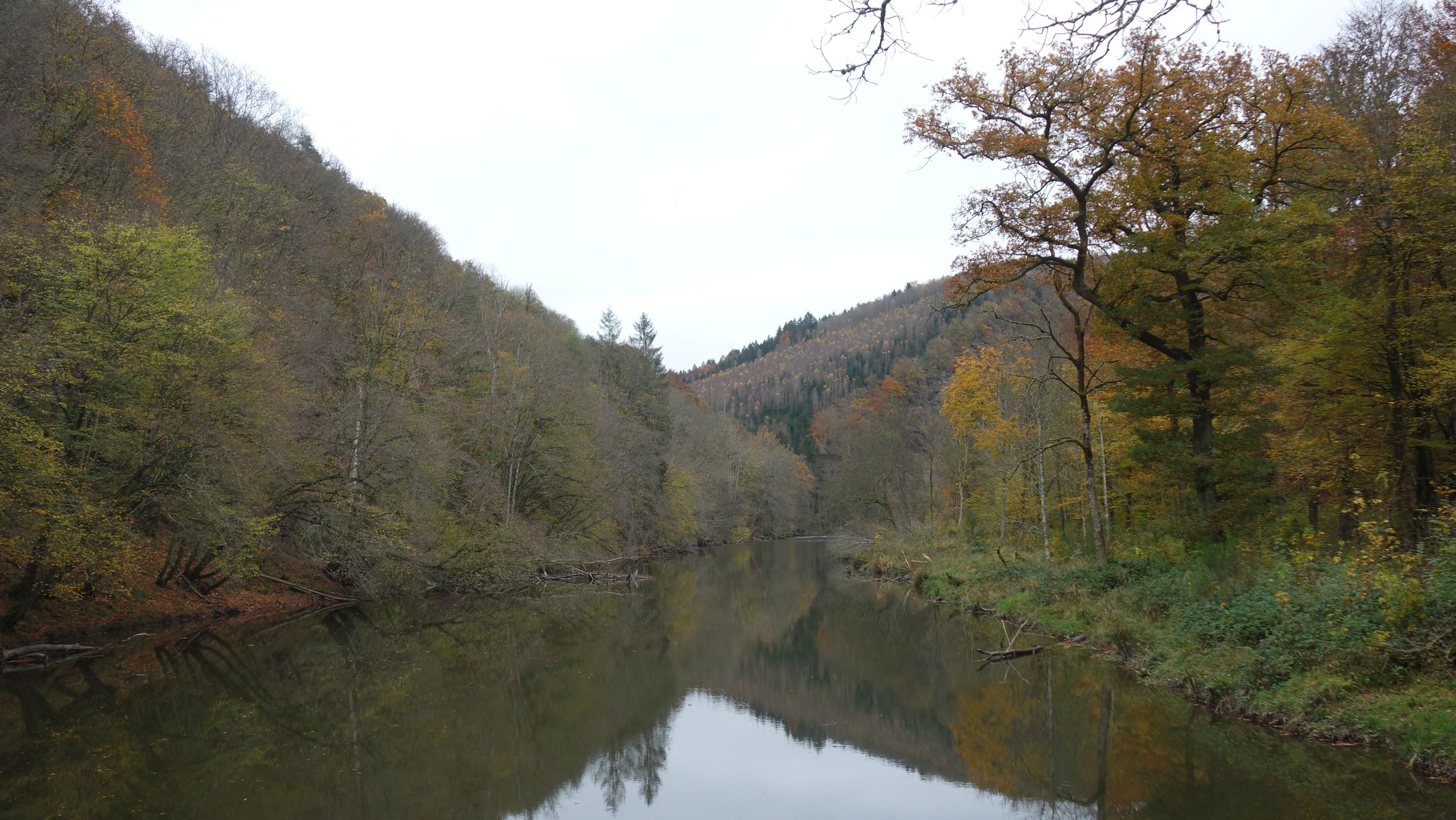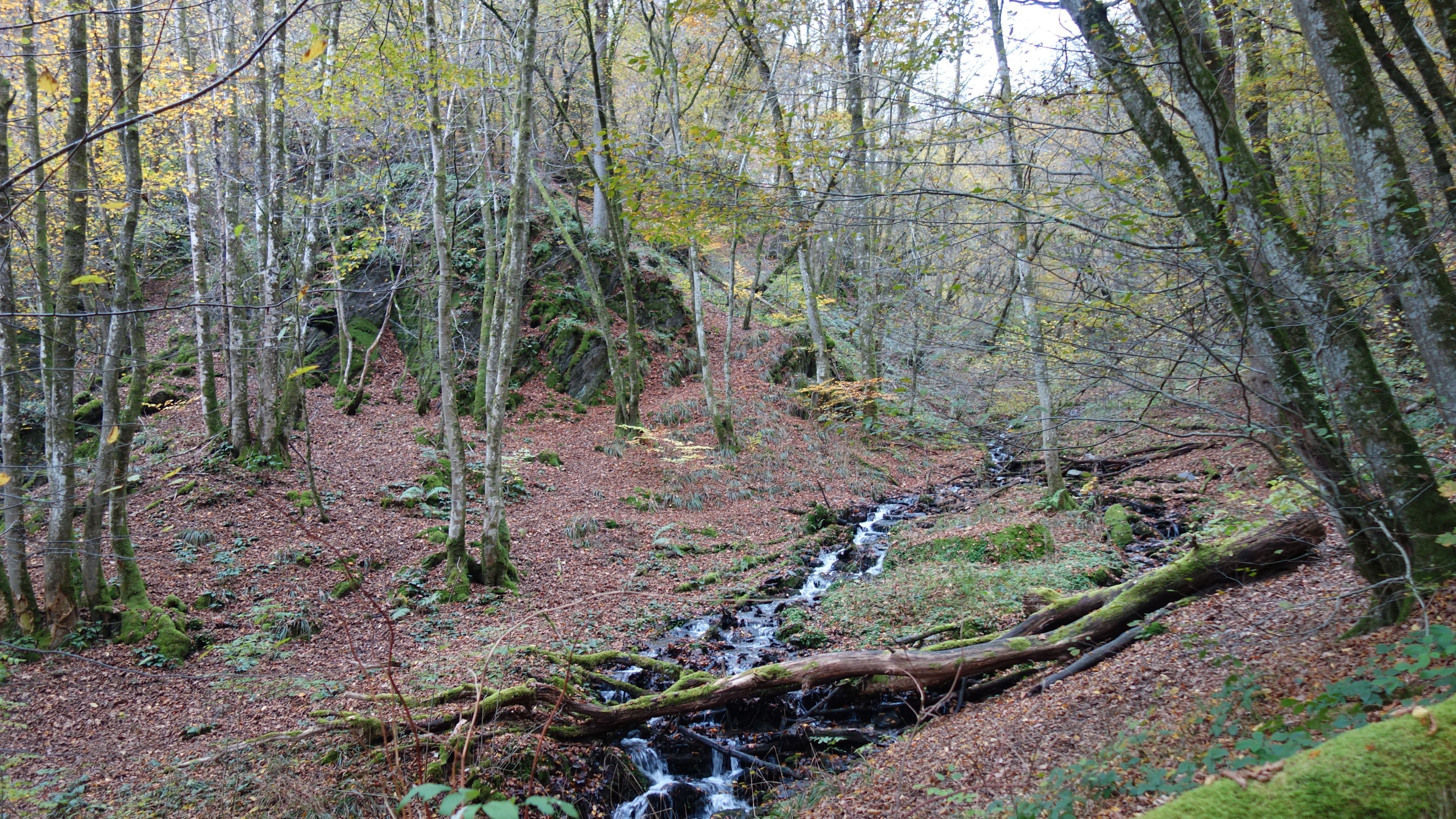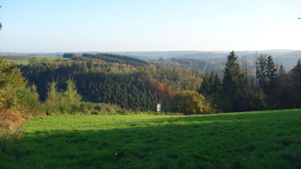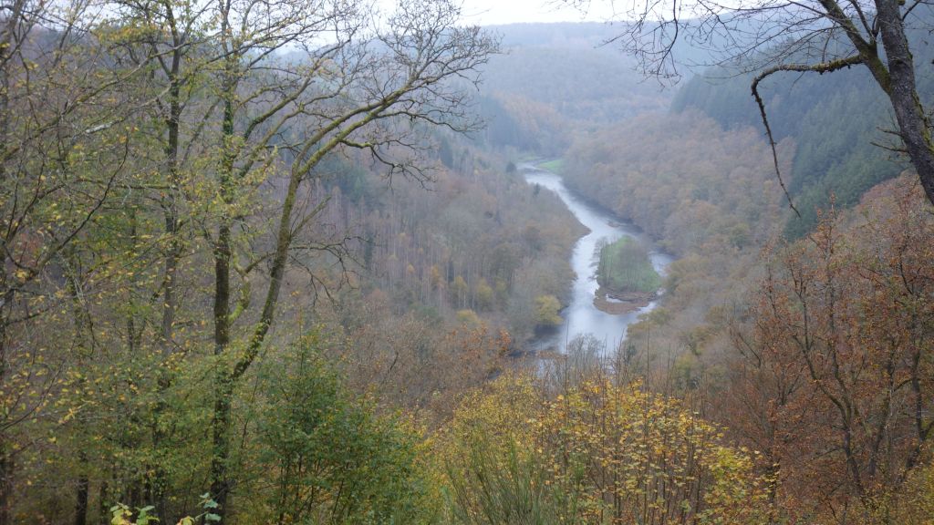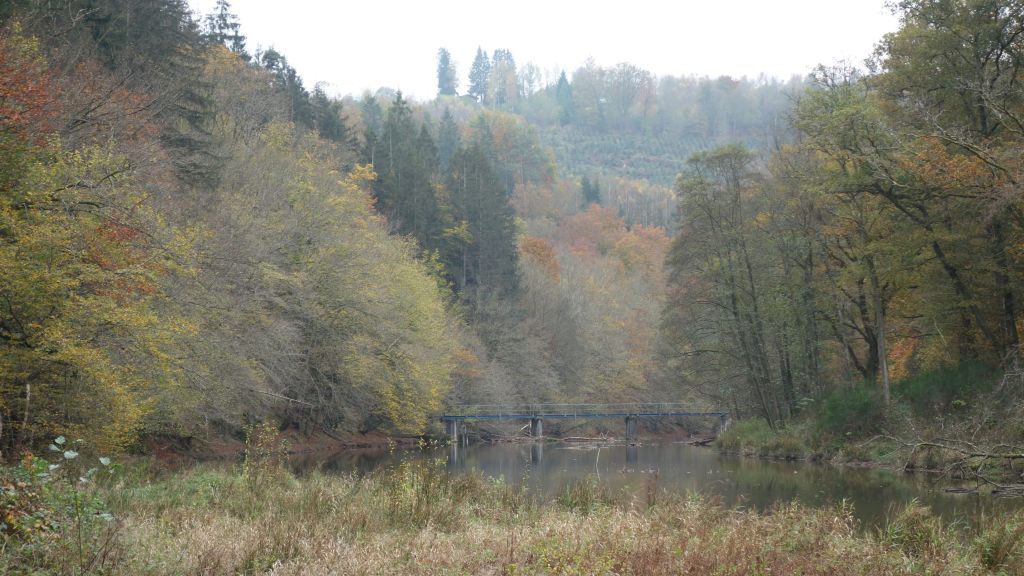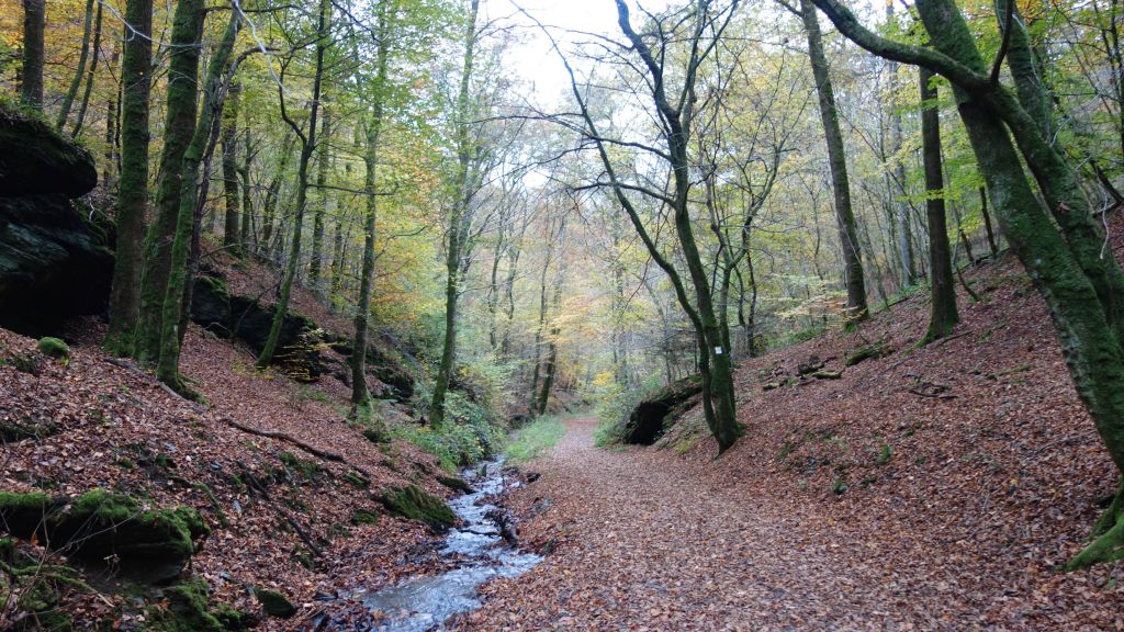 Een eenvoudig uitloopdagje zou het worden, dacht ik. We steken even door een loofbos door en kunnen zo snel een onverharde weg op. Wat verder komen we de Eisleck Trail tegen die ons terug naar de Ourthe brengt. Daar zou volgens Alpenvereinaktiv een paadje moeten liggen dat stroomopwaarts de rivier volgt maar het verdwijnt al snel de ‘brousse’ in. Ivo begint te mopperen maar blijft me volgen. Wat later ploeteren we door de modder en lijkt er geen doorkomen meer aan. Dan maar omhoog en de bosweg opnieuw oppikken.