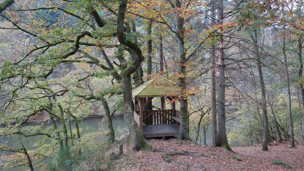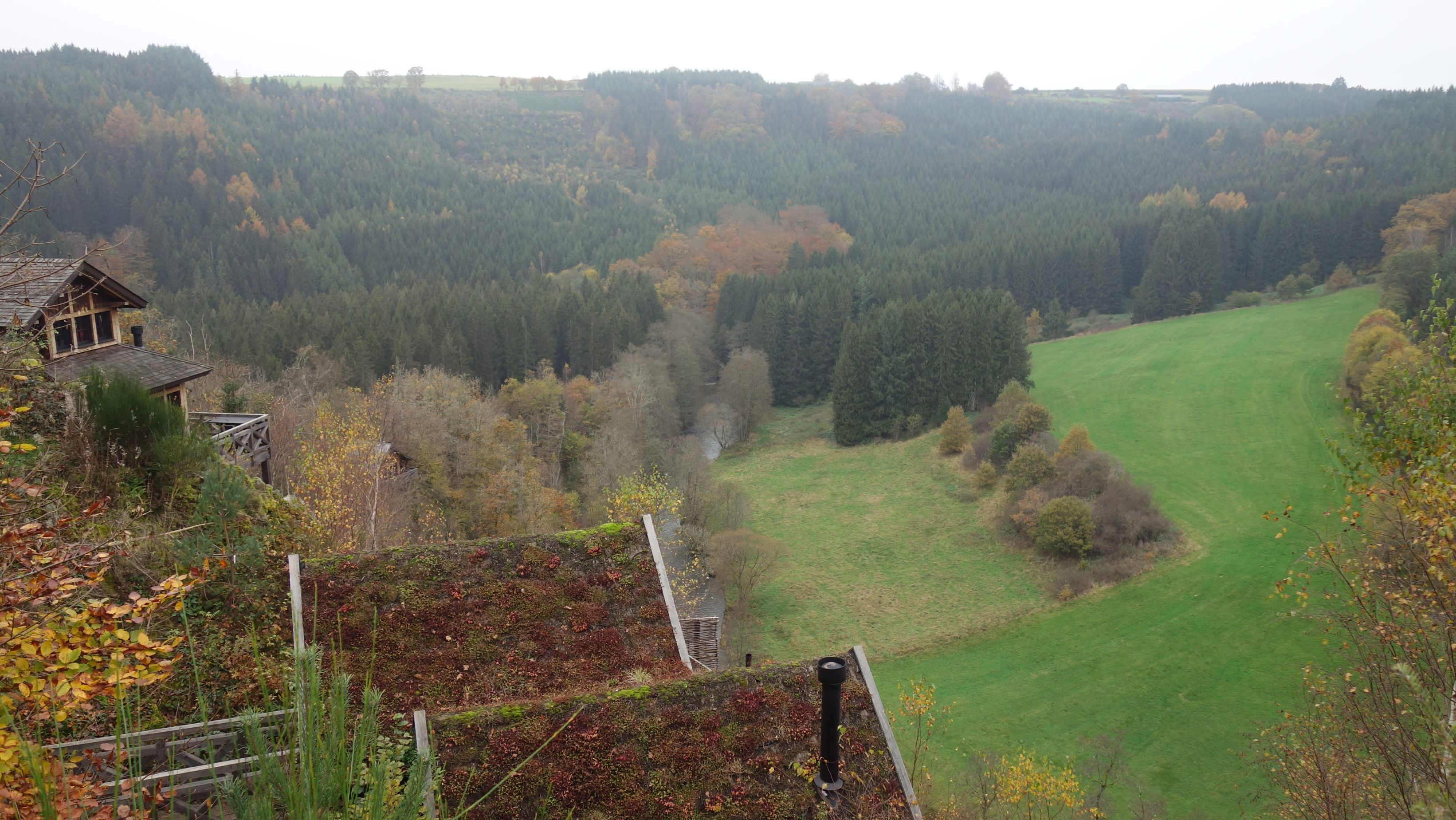 Samen met de kabbelende Ruisseau de Martin Moulin dalen we rustig af naar de Ourthe Orientale. Na de brug over de rivier stappen we wat onwennig het domein van Les Cabanes de Rensiwez binnen. De markering is samen met ons zelfvertrouwen even zoek. Maar er loopt wel degelijk een wandelroute de flank omhoog waar tal van blokhotten op houten palen gebouwd staan. Het zicht over de vallei is best de moeite.