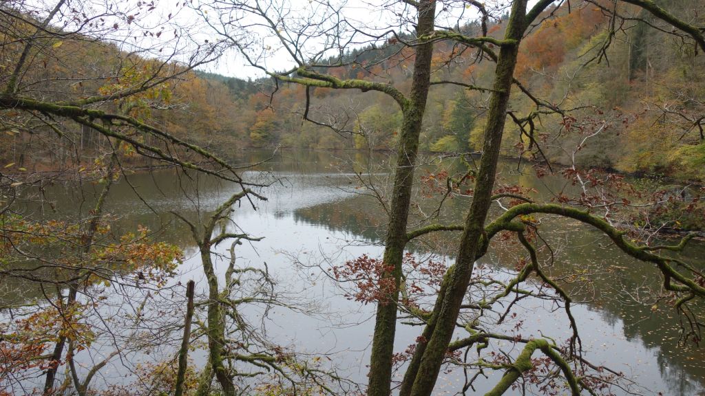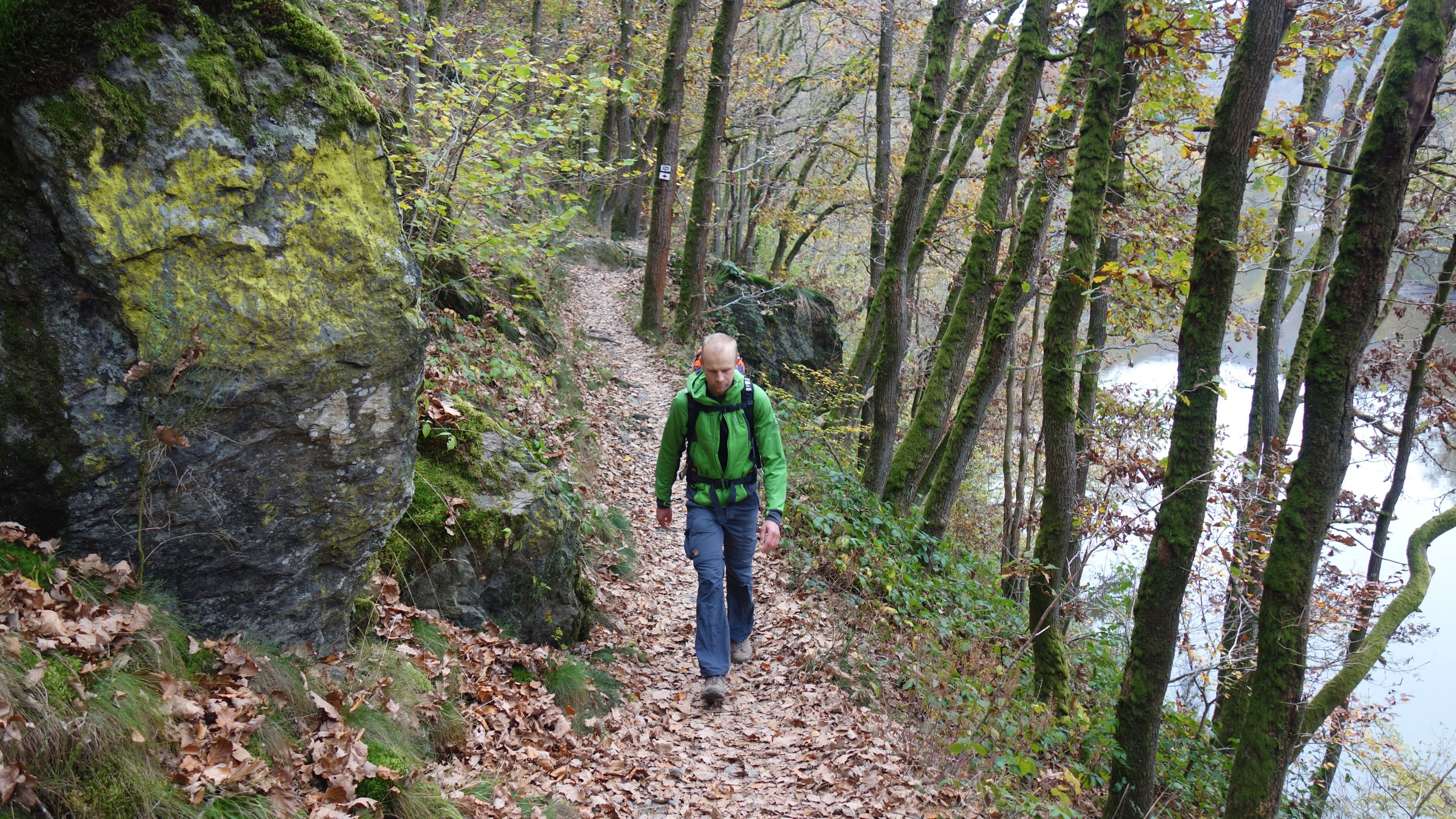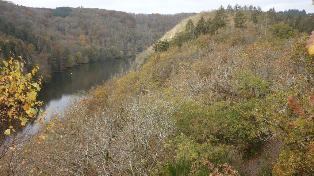 De witte golfjes van de Eisleck trail leiden ons terug omlaag naar de Ourthe. Plots komen we veel dagstappers tegen. ’t Is herfstvakantie en de wandeling rond het Lac de Nisramont blijkt gigantisch populair te zijn. Terecht ook wel, een smal pad slingert langs de heuvelflank en biedt her en der ook mooie zichten, onder andere op de ‘confluence des deux Ourthes’ waar de oostelijke en westelijke tak samenvloeien. Pas als we de rechtstreekse doorsteek nemen naar de parking van de stuwdam, wordt het terug rustig.