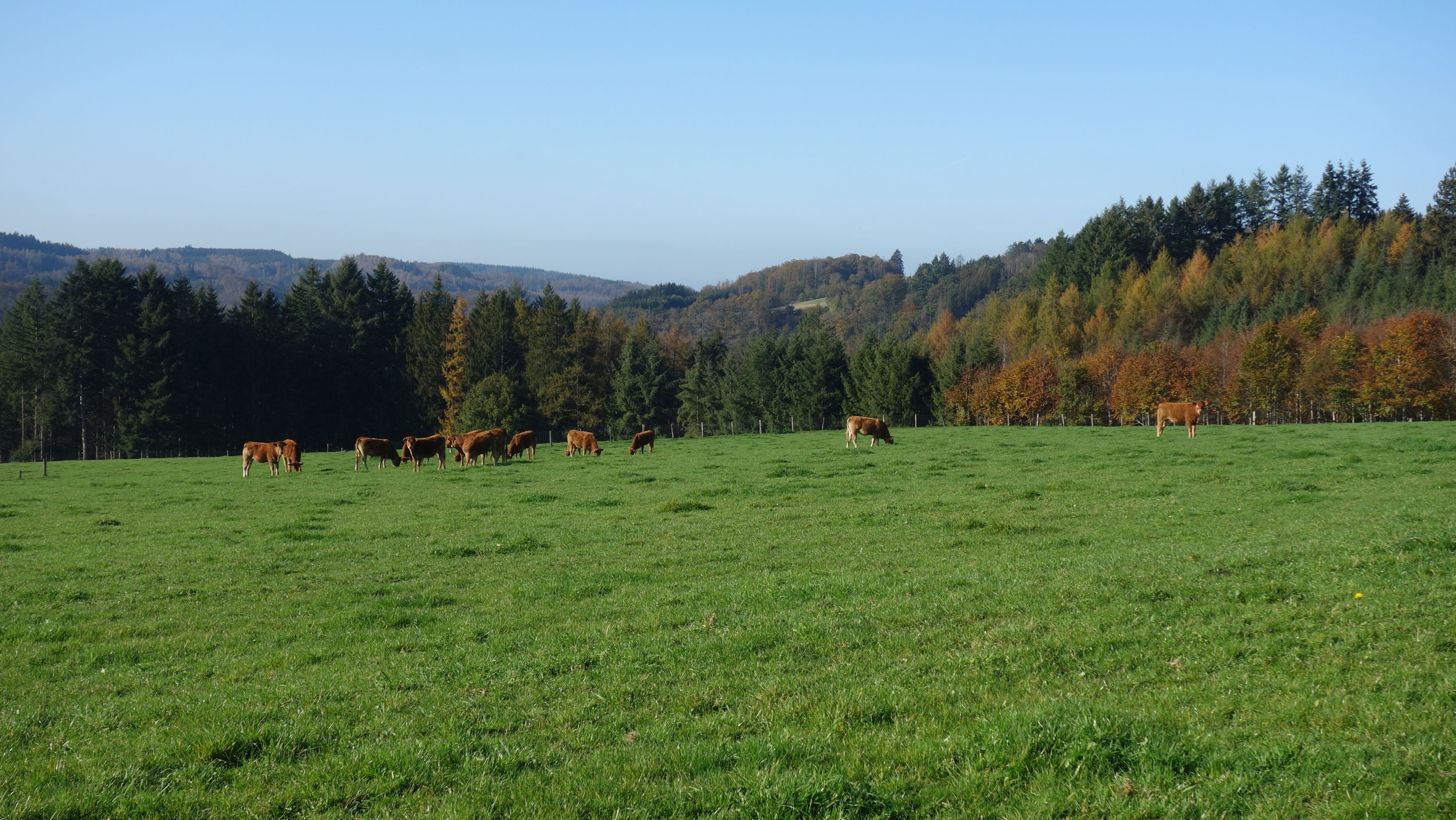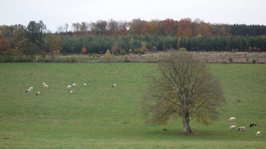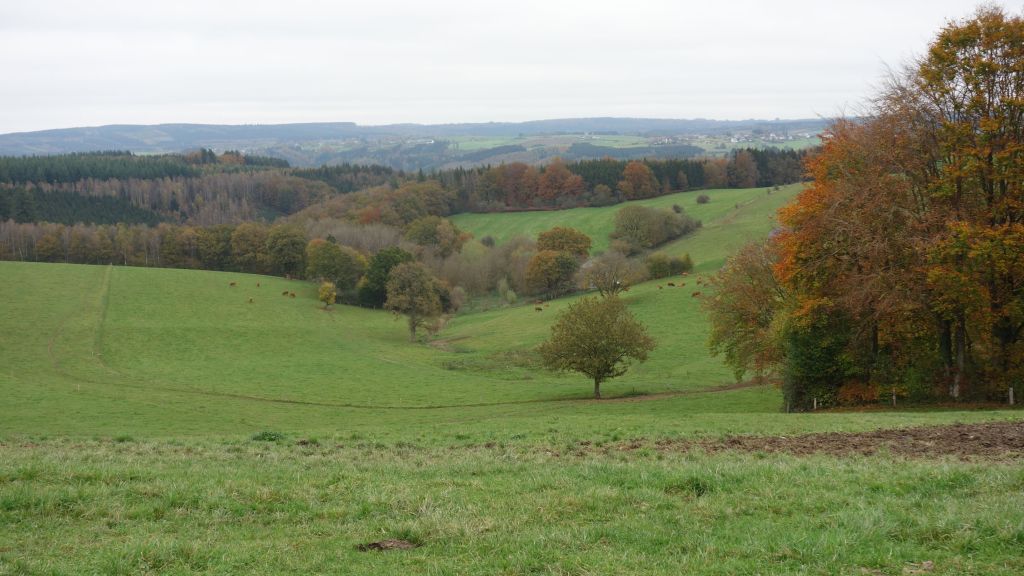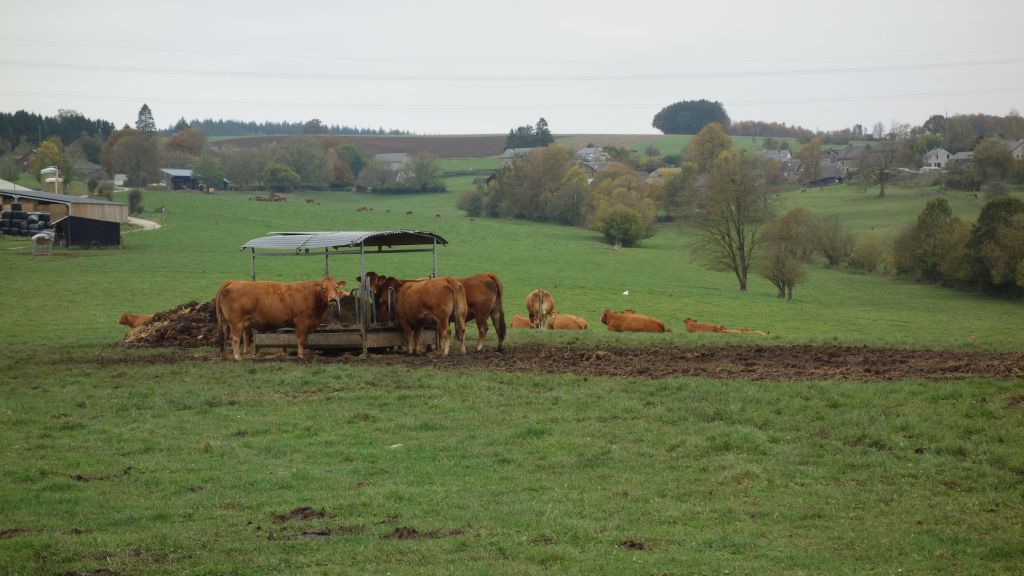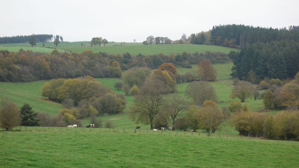Pas verder gaat het terug omhoog richting Hubermont. Het landschap opent zich. Bovenop het plateau wandelen we over verkeersluwe wegen tussen de koeien naar Nisramont. Gezien Ivo’s appetijt niet gestild geraakt met vederlichte mueslirepen, stappen we een donkerbruin café binnen voor pizza en cola.