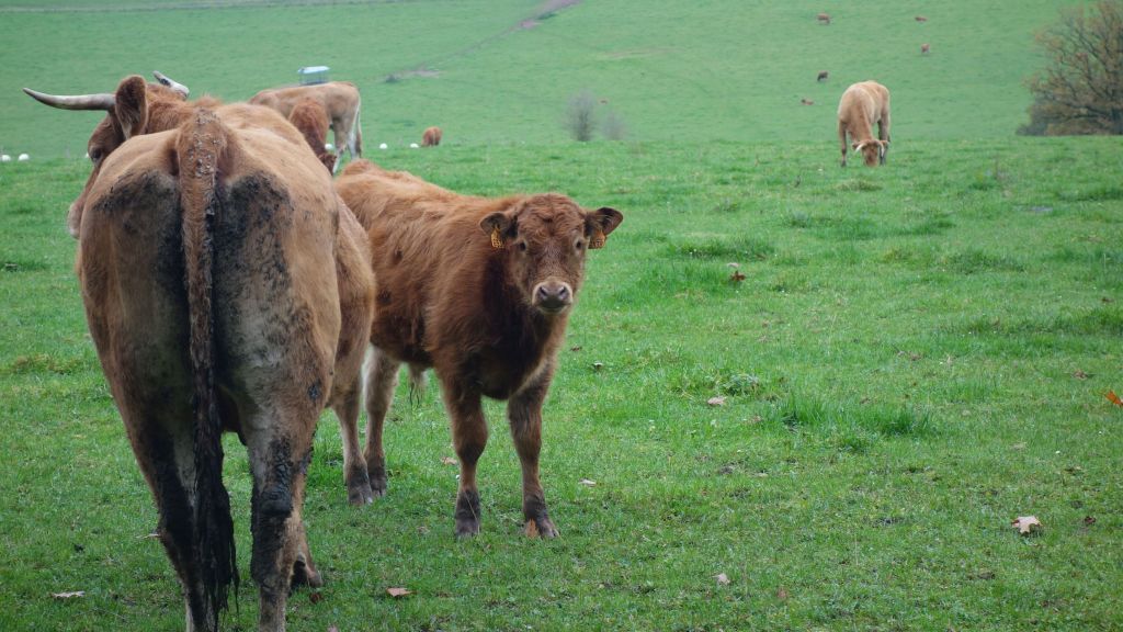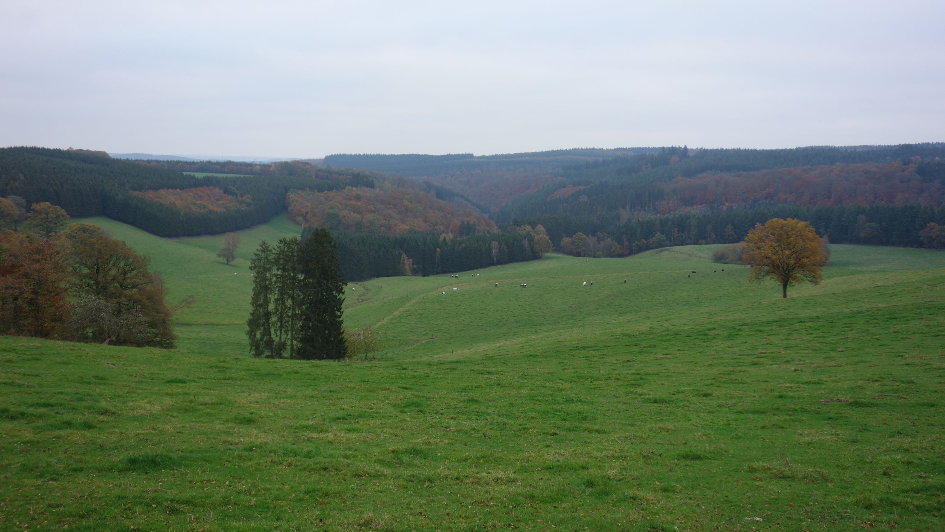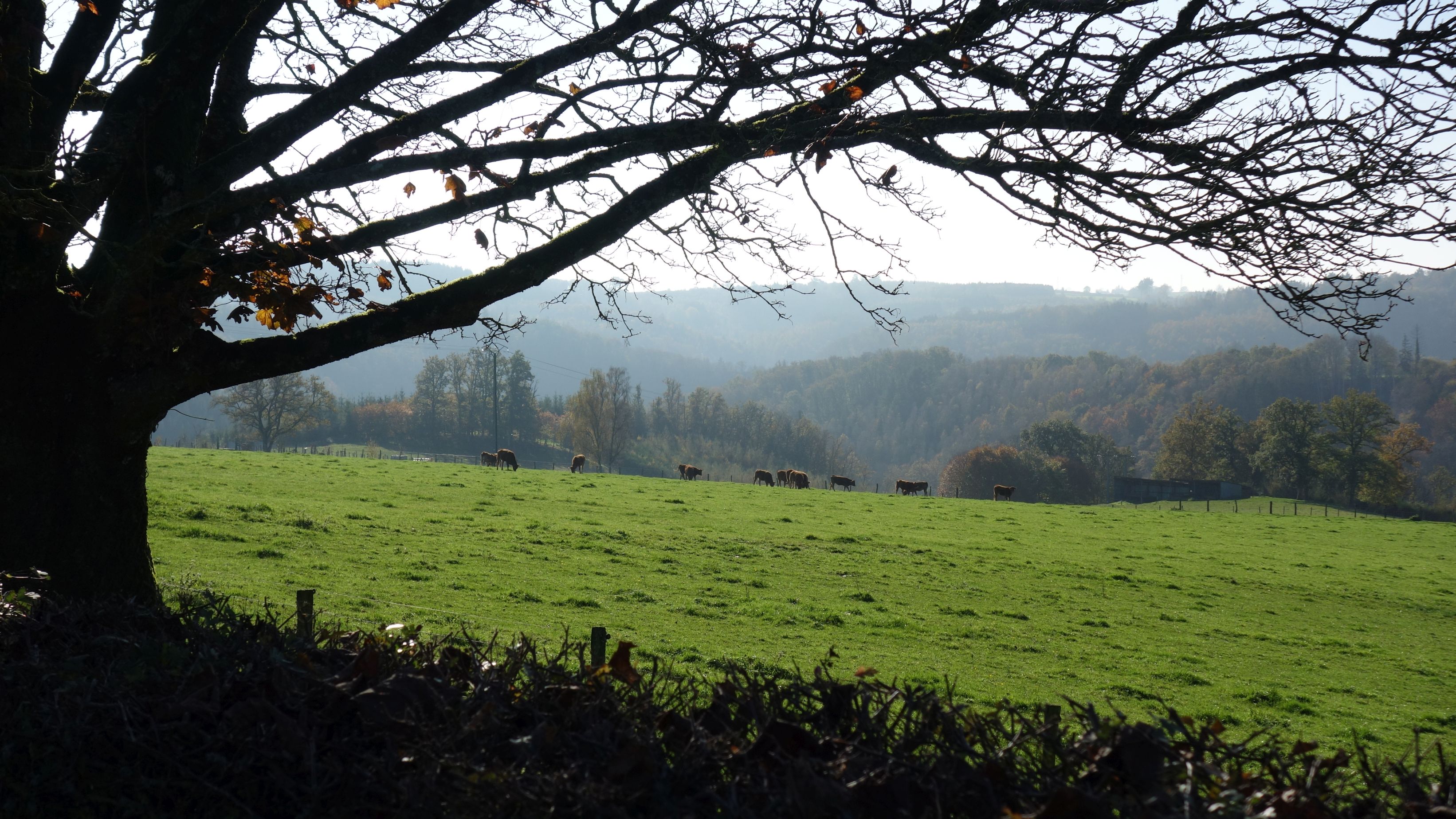 Pas verder gaat het terug omhoog richting Hubermont. Het landschap opent zich. Bovenop het plateau wandelen we over verkeersluwe wegen tussen de koeien naar Nisramont. Gezien Ivo’s appetijt niet gestild geraakt met vederlichte mueslirepen, stappen we een donkerbruin café binnen voor pizza en cola.