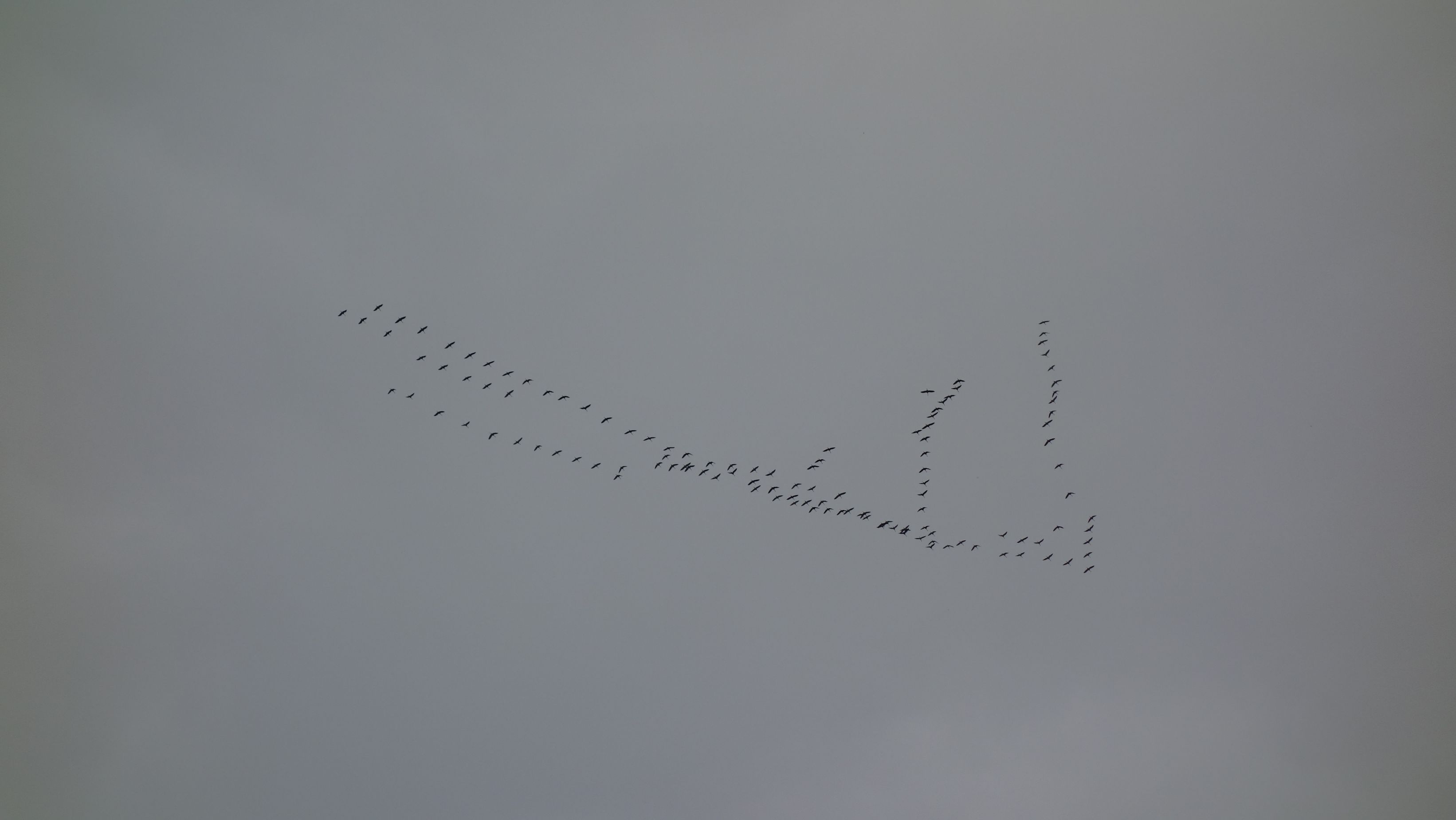 Niet veel later zijn we terug aanbeland op de Promenade du Lac de Nisramont, deze keer ‘aan den overkant’. Fitte wandelaars en hijgende exemplaren, korte mouwen en dikke donsjassen, rugzakken en sjakossen, alles zien we passeren. De diversiteit is even groot als het aantal hondenrassen op de rondtocht. Enkel het gekrijs van kraanvogels doen onze gedachten even afdwalen. In V-formatie trekken ze van hun broedplaatsen zuidwaarts om te overwinteren.