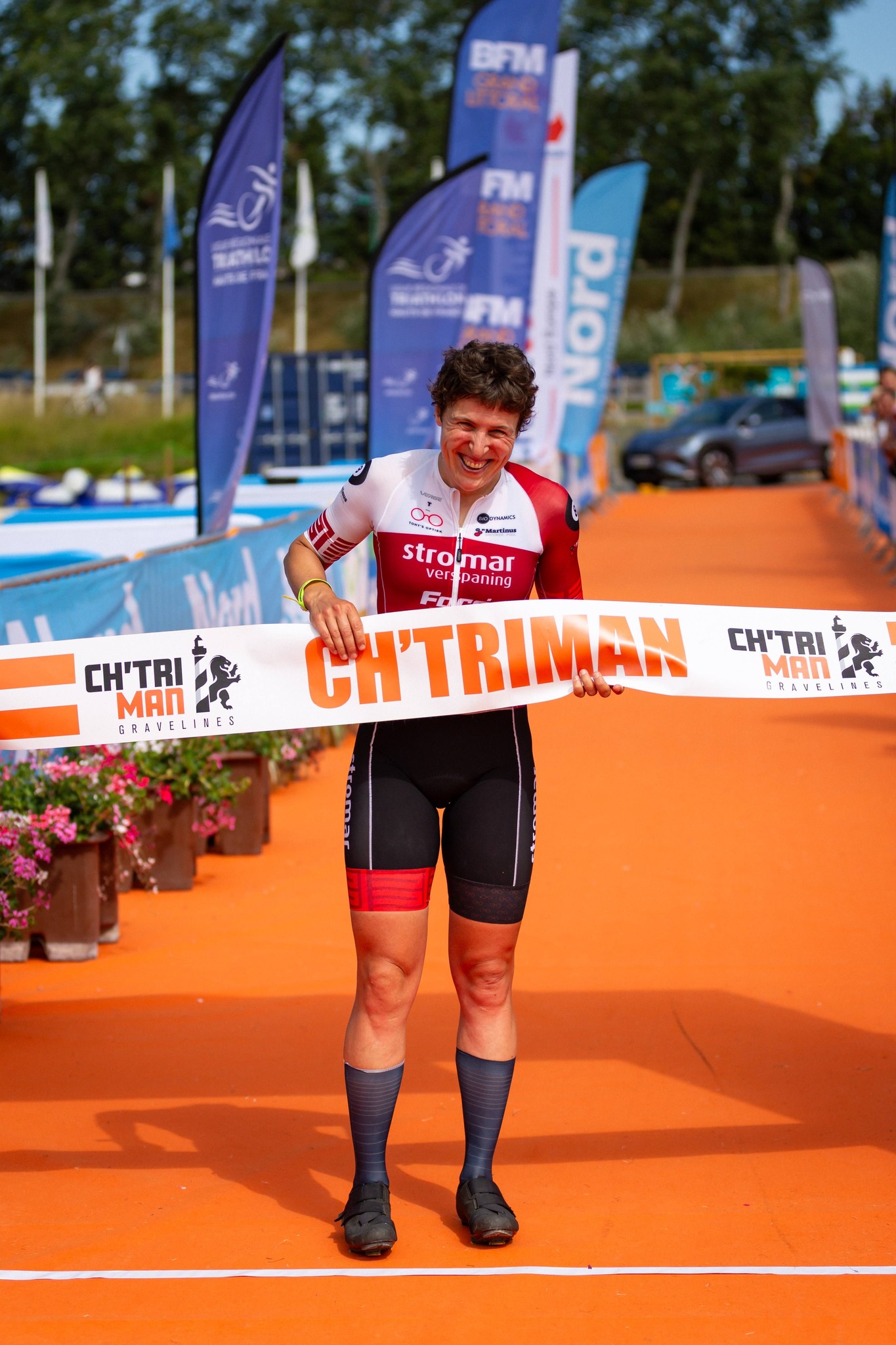 Aan de finish ga ik bijna overkop. Als blijkt dat ik niet ná maar vóór de tijdsmat moet stoppen, gooi ik alle remmen toe. Bij swimbikes varieert dat, het stond niet in de briefing en mijn hoofd is volledig ingesteld op koersen. Gelukkig knijpt de arbiter een oogje dicht en kan ik mijn 1ste plaats bij de vrouwen, 16de overall, toch nog behouden. Un grand merci!