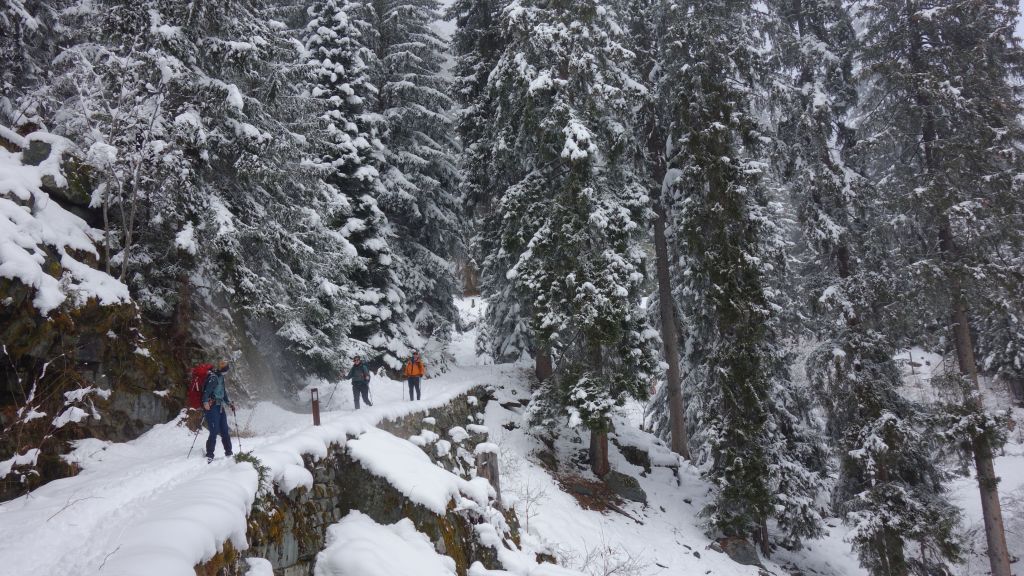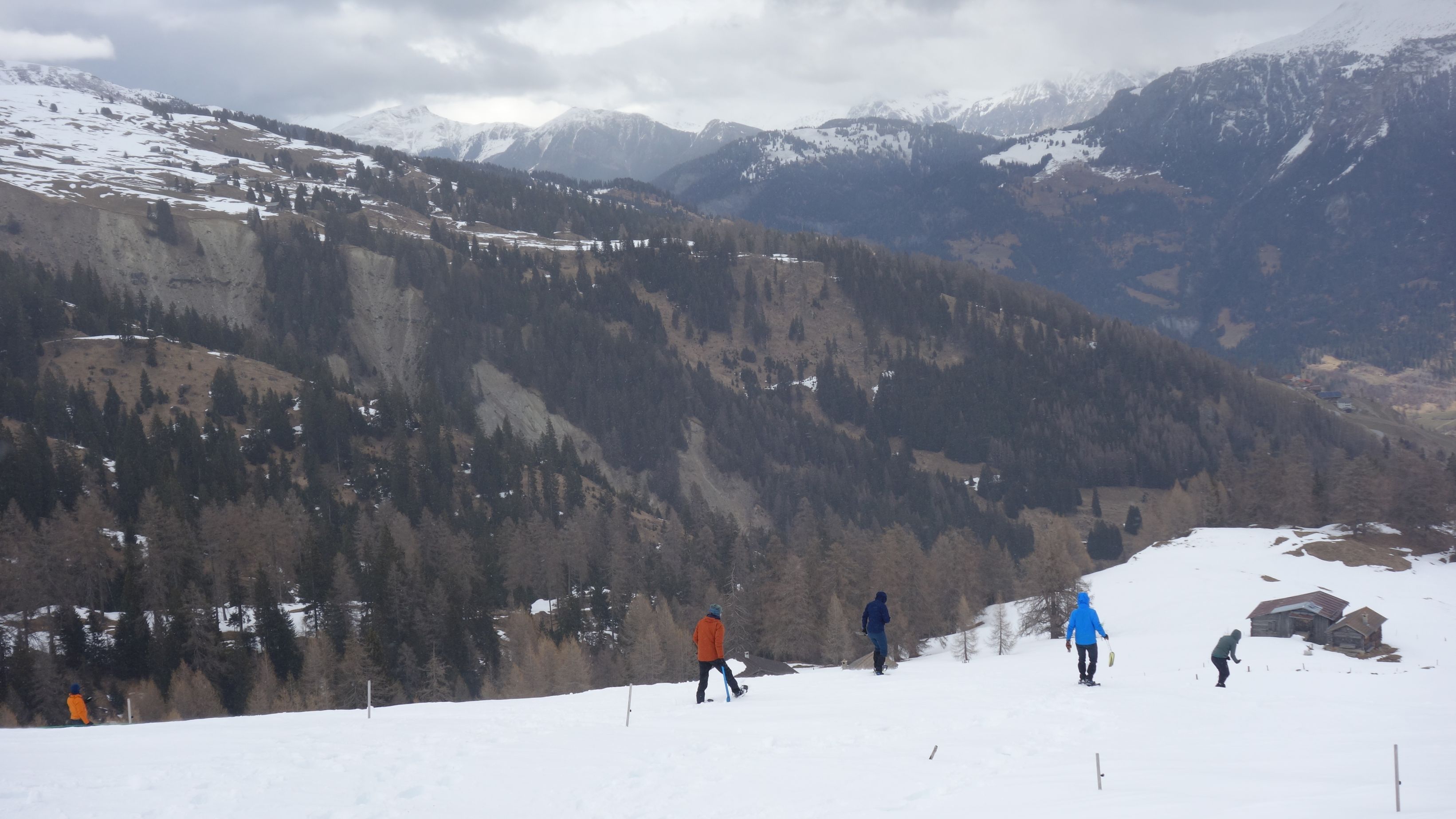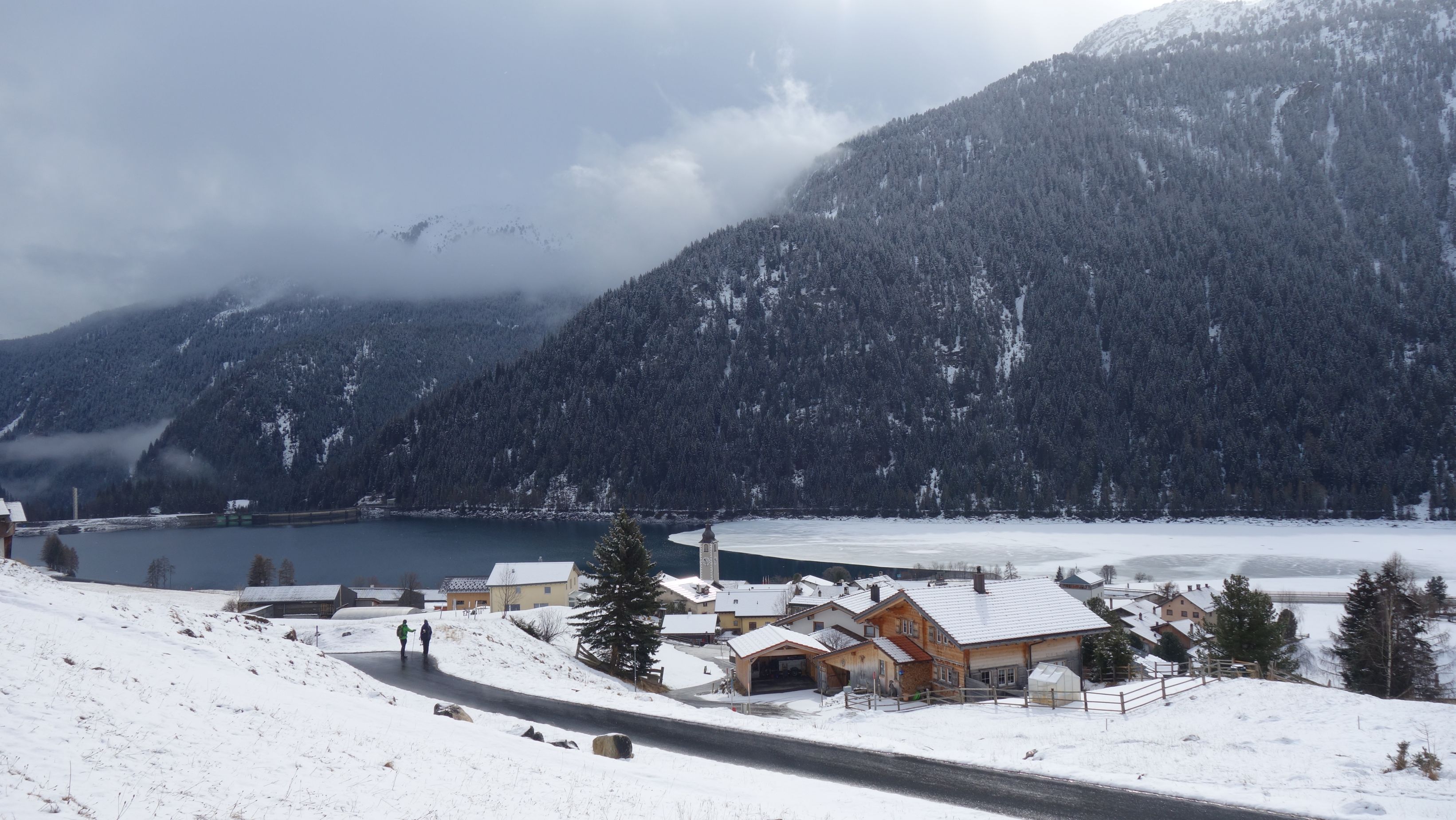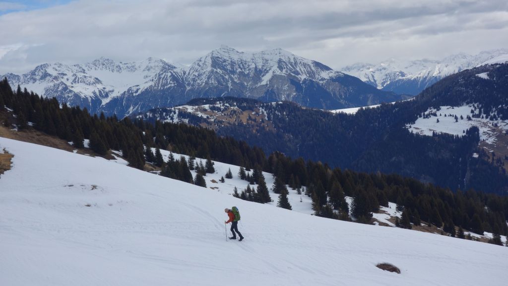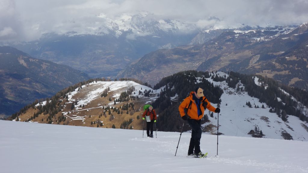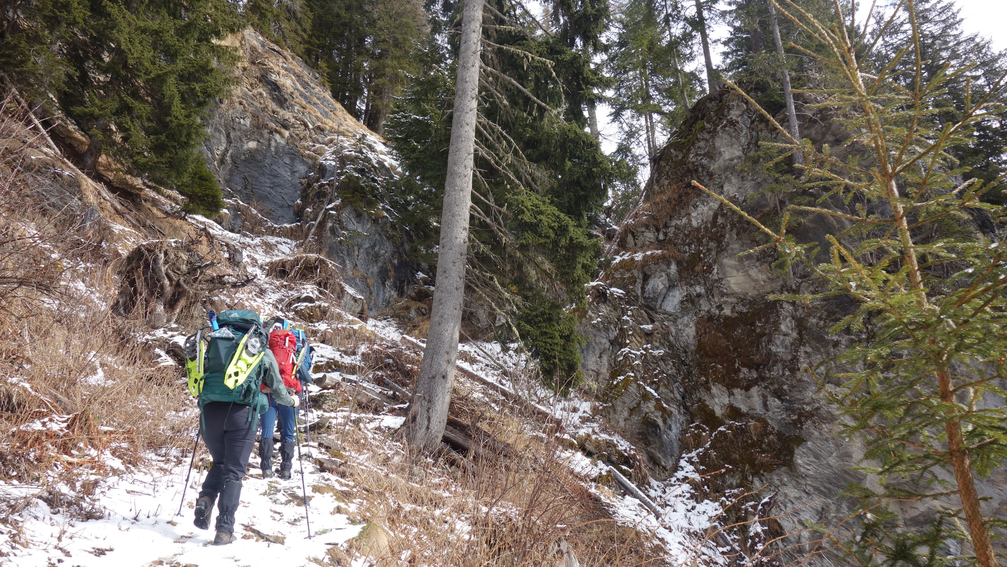 Het zomerwandelpad is zuidgericht en daardoor zo goed als sneeuwvrij. Met de sneeuwschoenen op de rug kunnen we zo snel vorderen. De zon is er zelfs bij en zo hebben we toch een mooi uitzicht op het dorpje Sufers en het half ingevroren stuwmeer. Boven de boomgrens kunnen we de raketten aangespen en worden de rugzakken opnieuw voelbaar lichter.