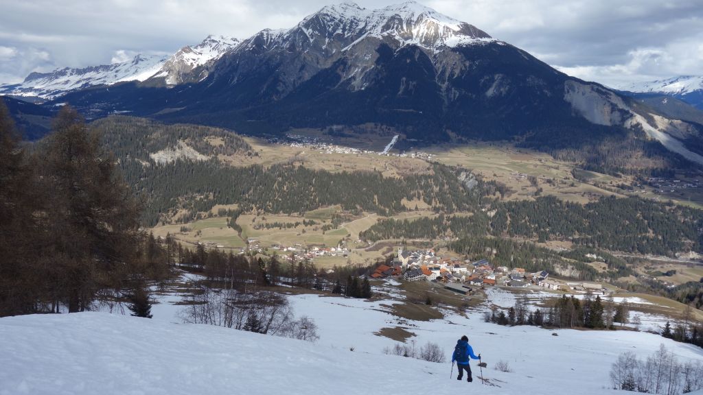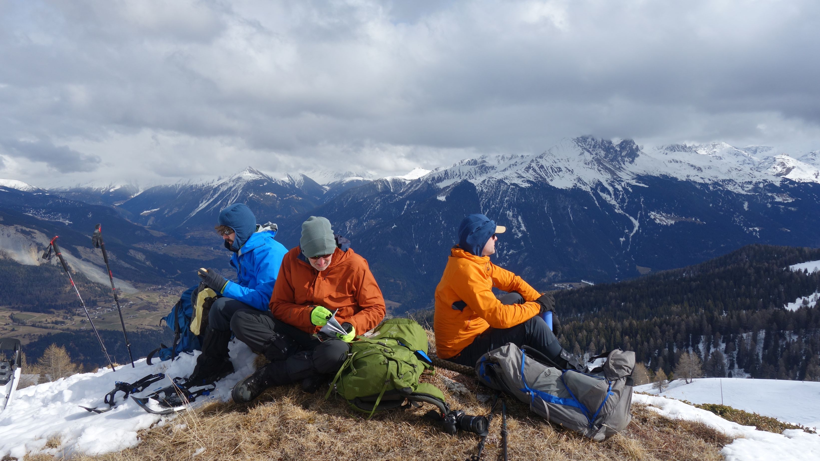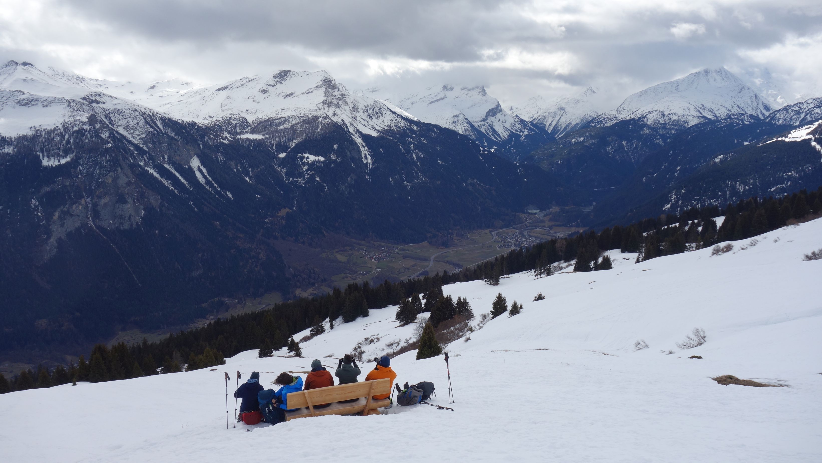 Opgelucht bereiken we de top van de helling en zetten de lange afdaling richting Stierva in. Op een sneeuwvrije grasbobbel is het tijd om te lunchen. Het panorama is indrukwekkend met brede beboste valleien en witte bergen rondom.