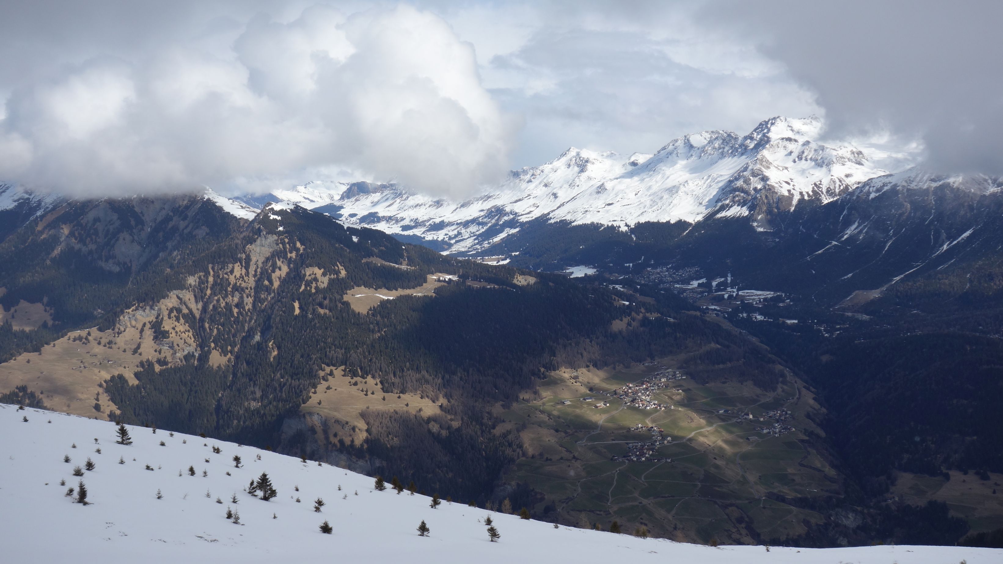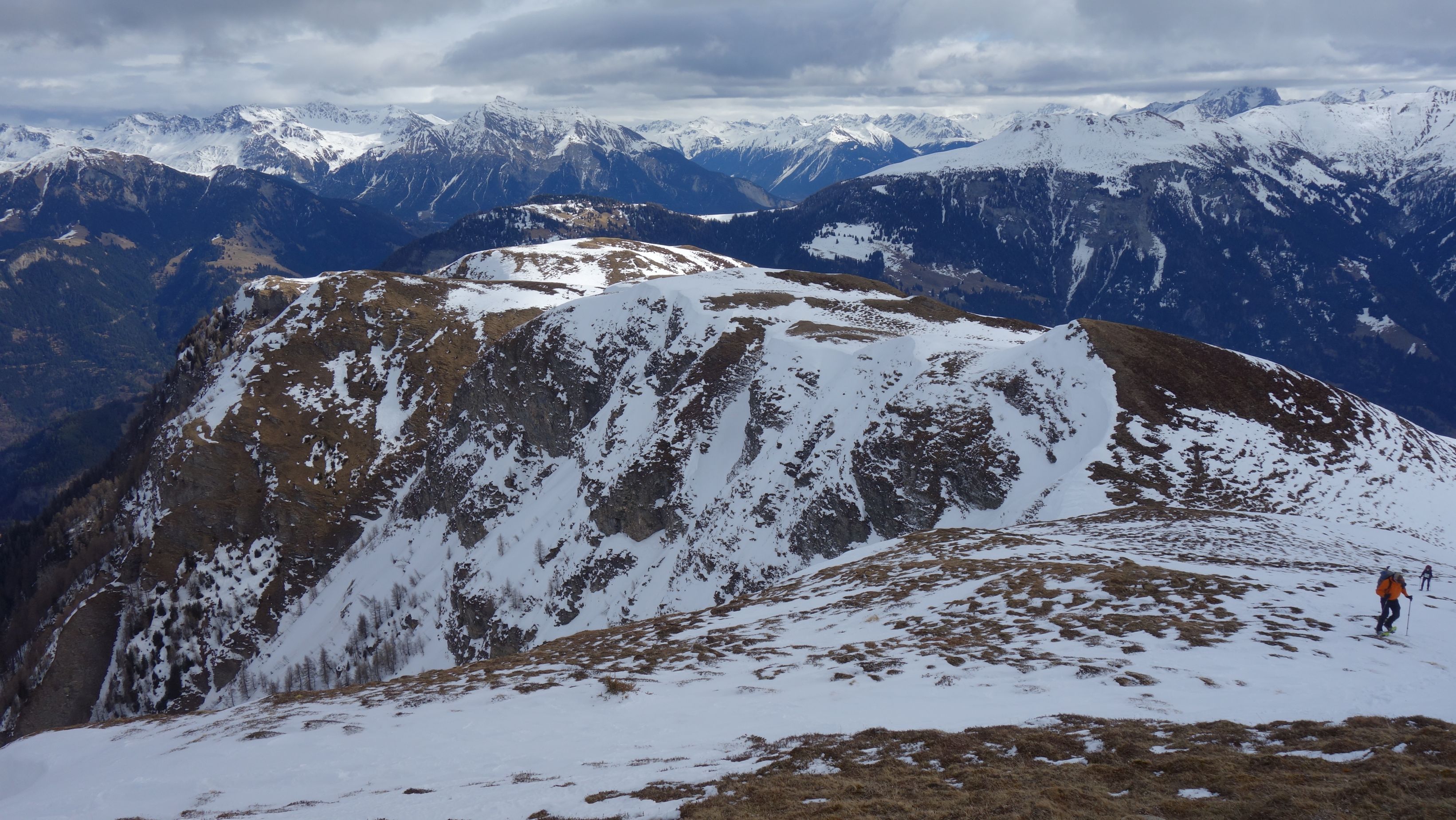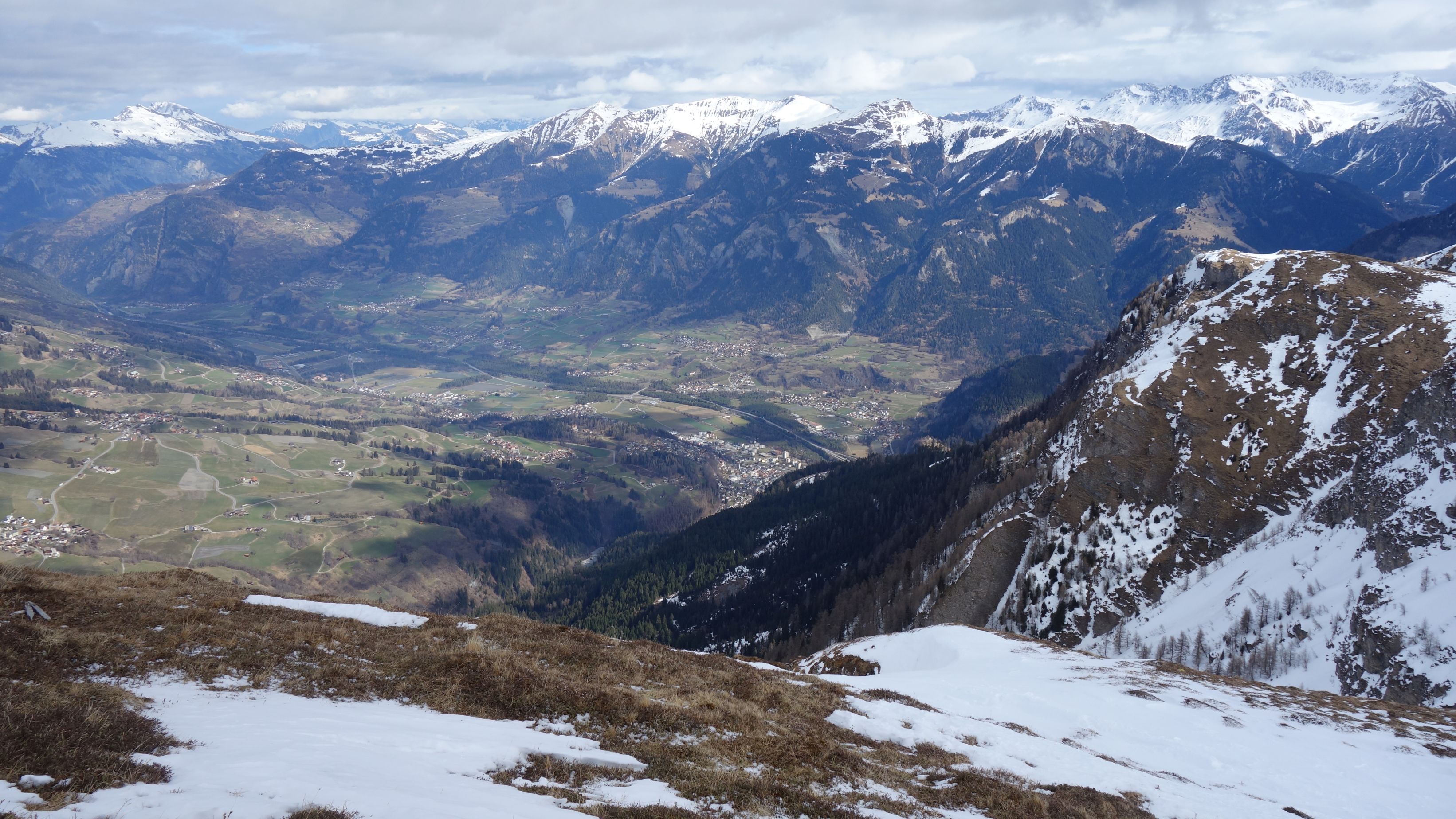 Opgelucht bereiken we de top van de helling en zetten de lange afdaling richting Stierva in. Op een sneeuwvrije grasbobbel is het tijd om te lunchen. Het panorama is indrukwekkend met brede beboste valleien en witte bergen rondom.