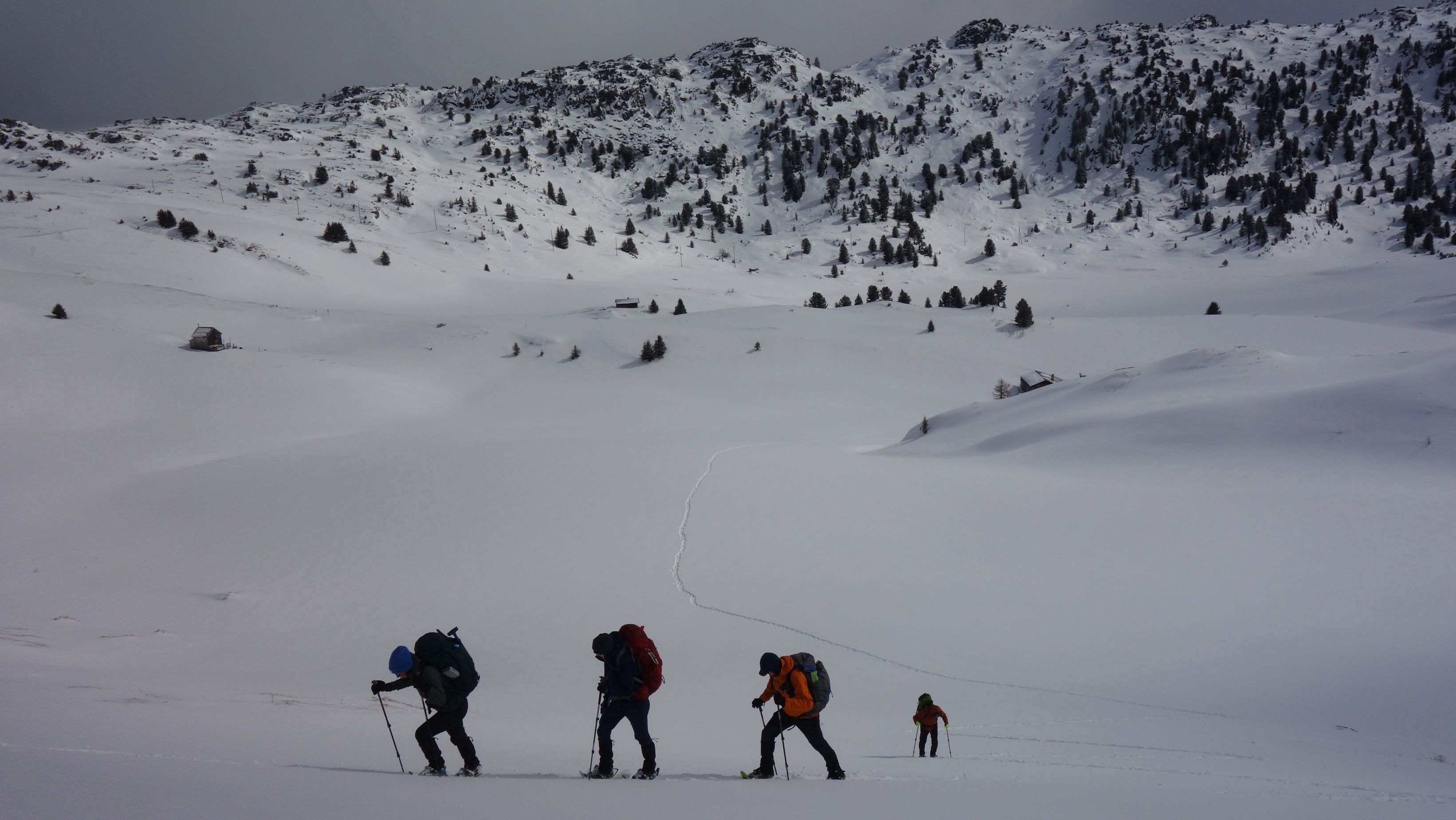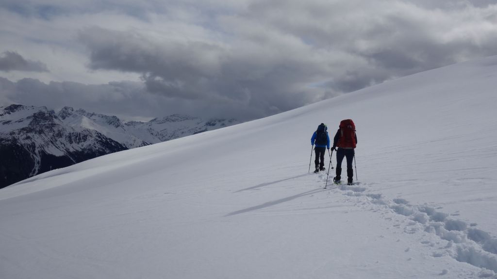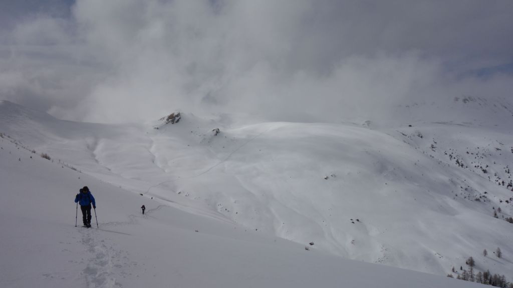 Goed dat we wat energie getankt hebben want daarna is het één groot ploeterfestijn om de steilere flank te doorkruisen die ik had aangeduid als mogelijk risicovoller. Qua driftsneeuw valt het wel mee, maar door de warmere Föhnwind is de sneeuwkwaliteit verre van ideaal. Mijn deelnemers lijken fysiek niet heel goed voorbereid op dit avontuur en ik blijf dus het grootste deel van het sporen voor mijn rekening te nemen. We vorderen trager dan ingeschat maar iedereen houdt de moed erin. De motivatie zit wel goed.
