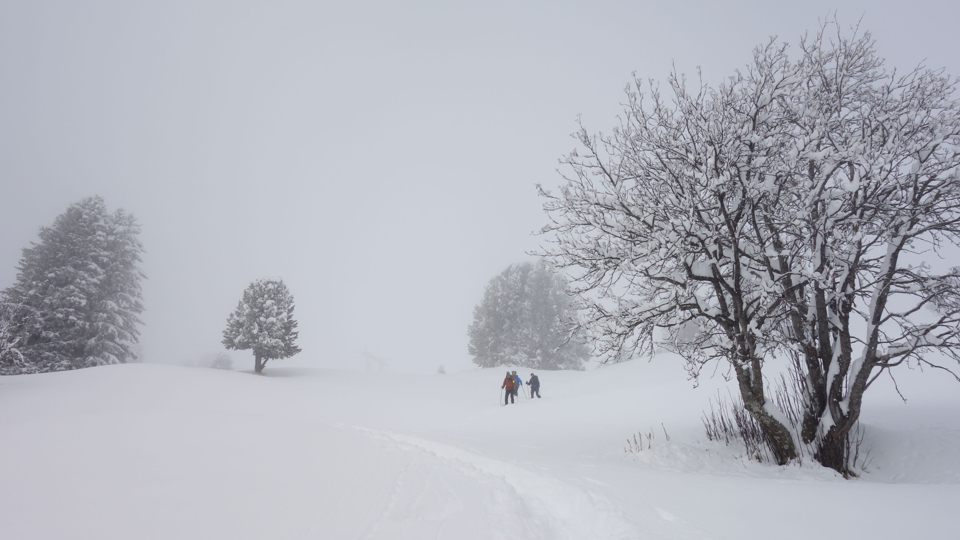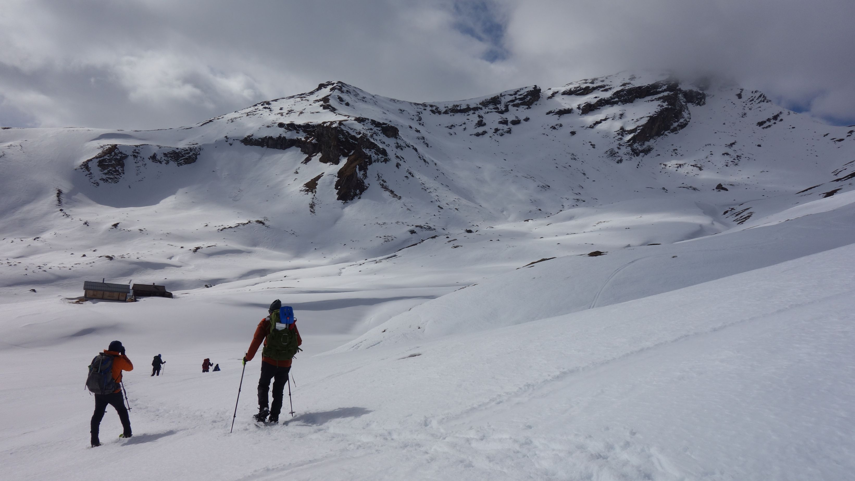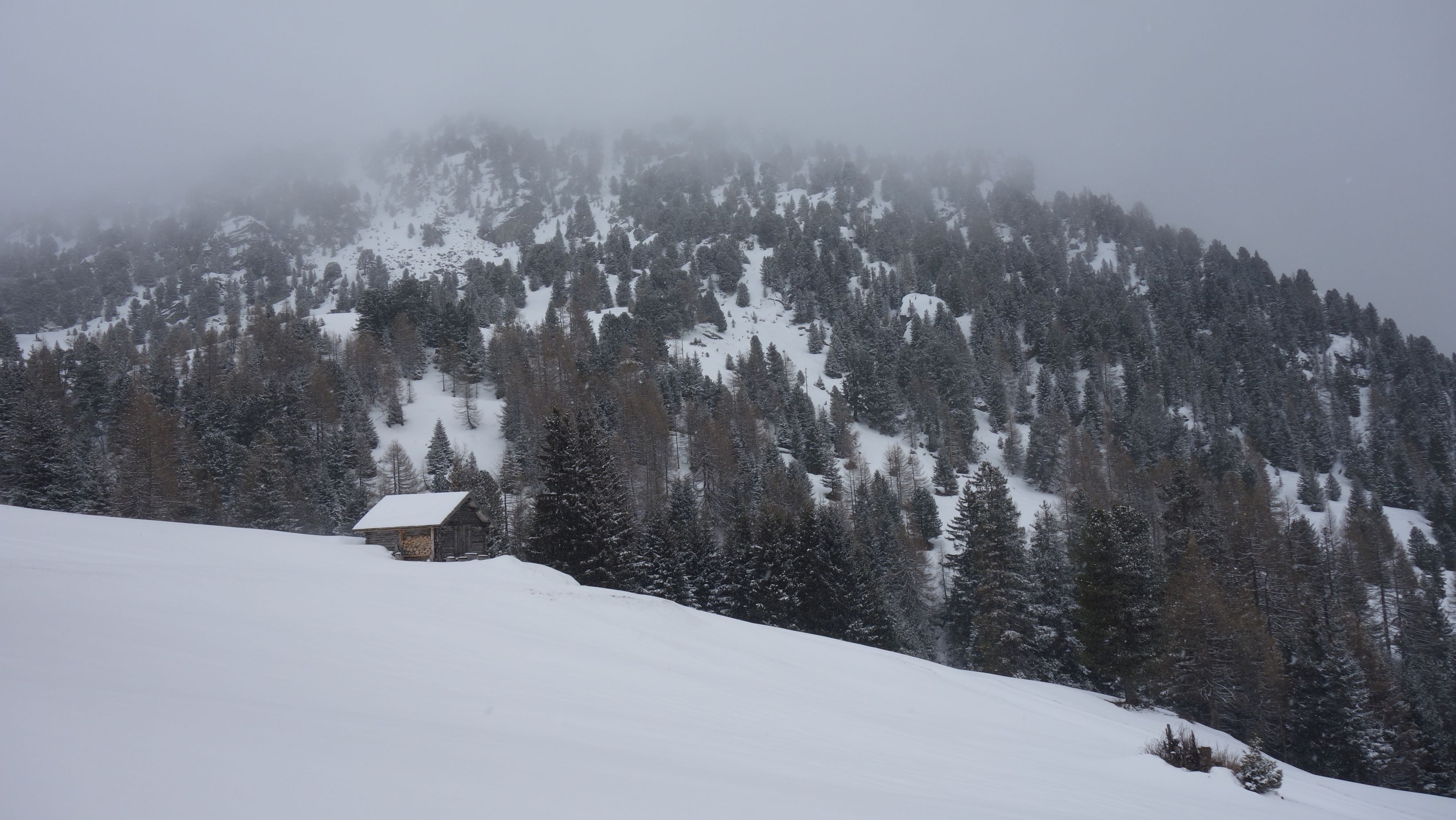 De sneeuw dwarrelt naar beneden en de duidelijke skisporen van de dag voordien zijn al zo goed als weggeblazen. Niemand te bekennen vandaag. Met een laaghangend wolkendek en stevige wind is er weinig animo om de voorziene bergtop te beklimmen. Gelukkig voor ons klaart het toch af en toe wat uit. Bij een traditionele hut houden we even halt om de thermos met warme thee en een snack boven te halen.