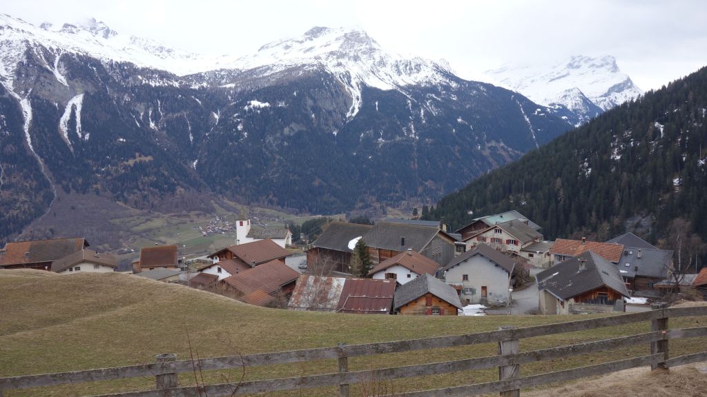 De postbus zet ons opnieuw perfect op tijd af in het stille dorpje Lohn. De sneeuwschoenroute is niet bruikbaar wegens geen sneeuw; de kale velden liggen iets te hobbelig. Dus is het beter om de bestaande wandelpaden te volgen die bij de start nog verraderlijk glad liggen door ijs.